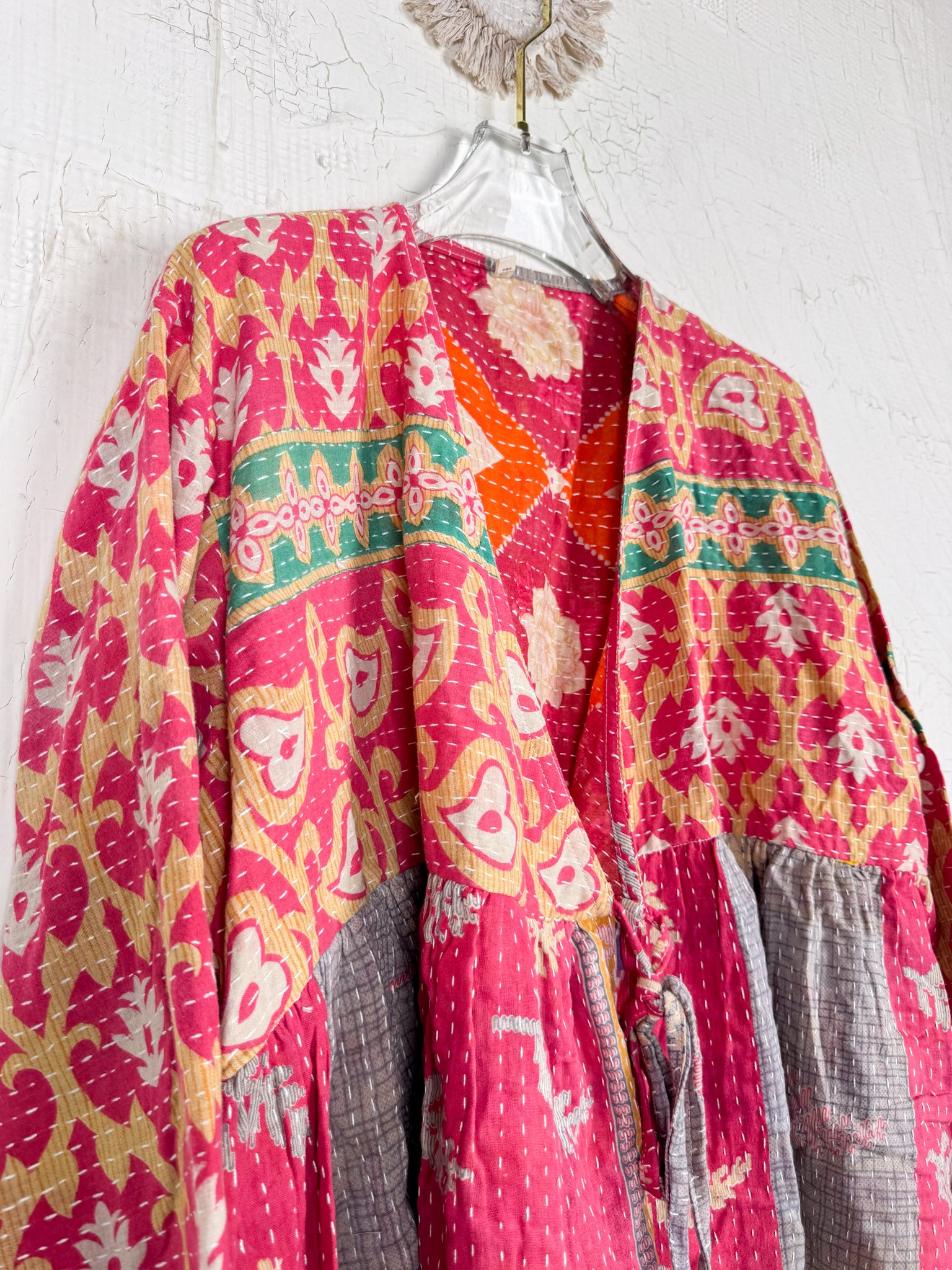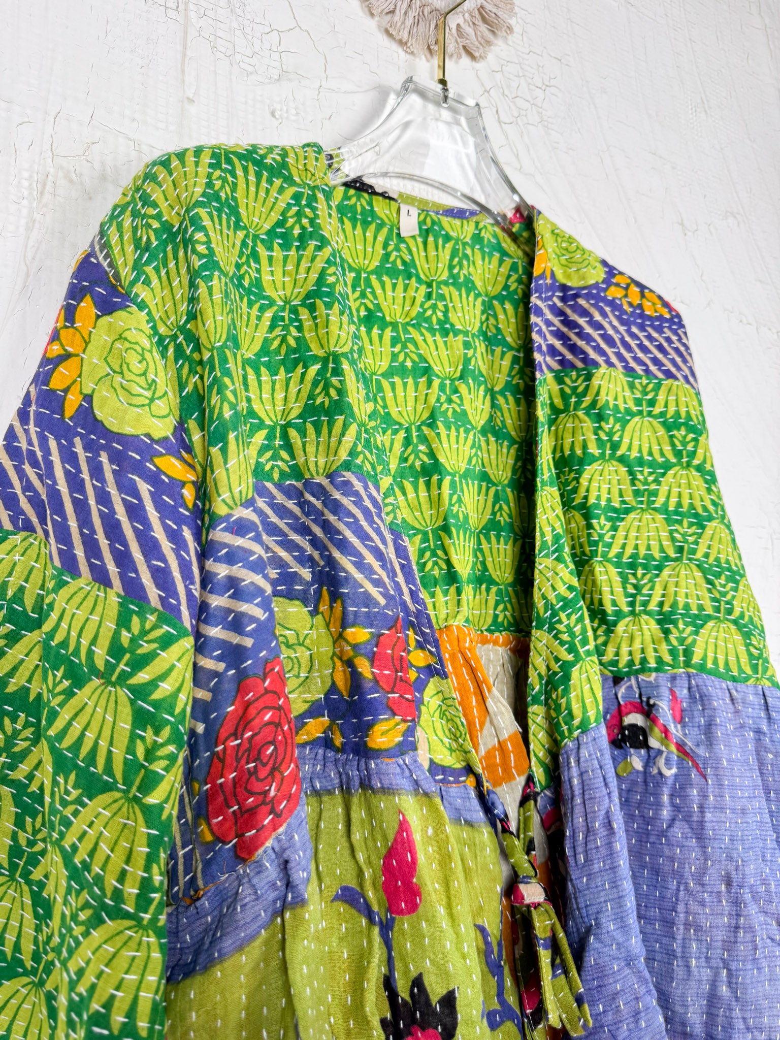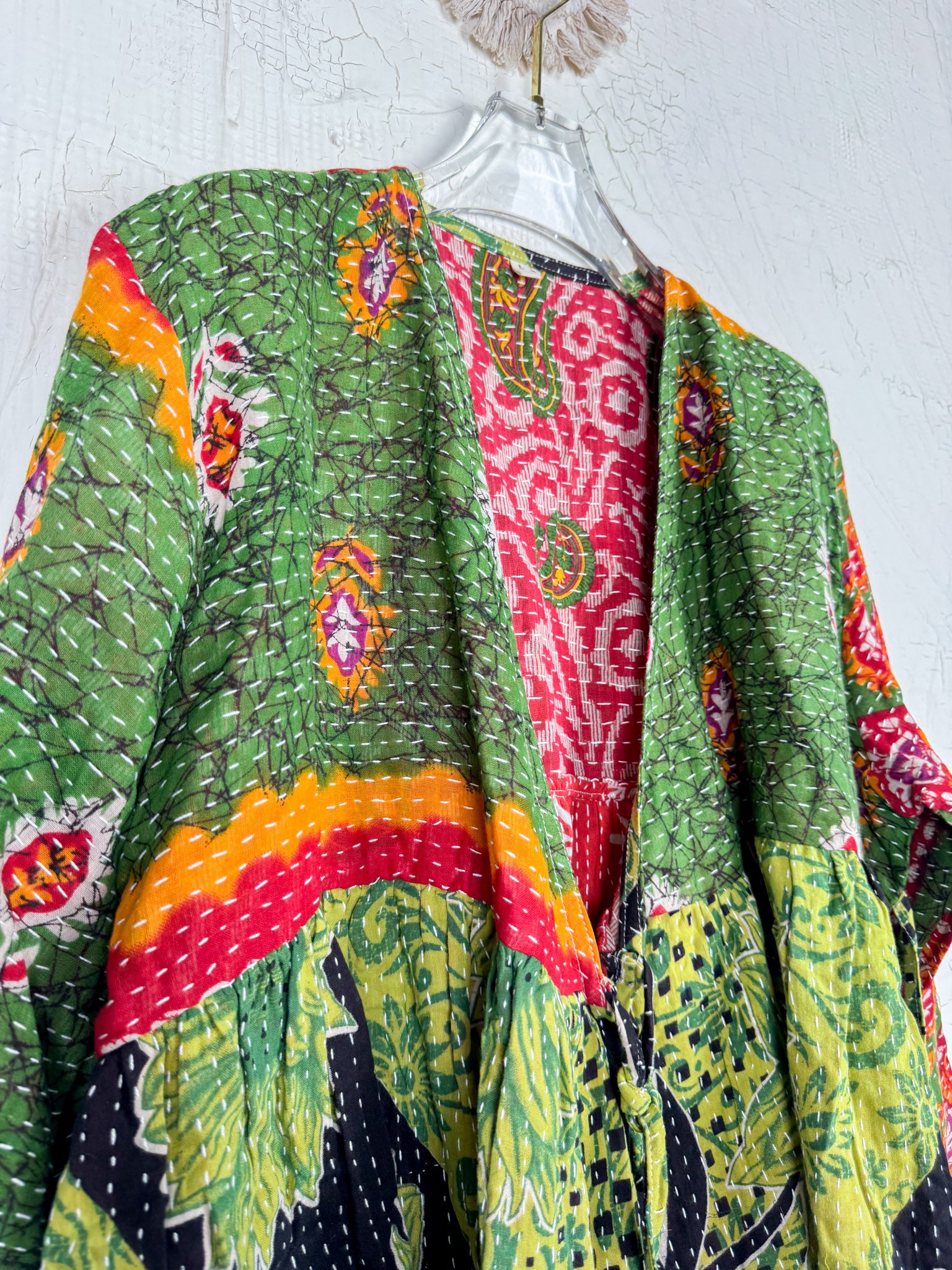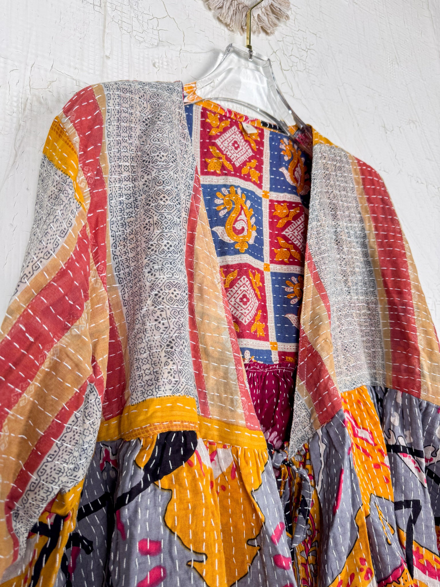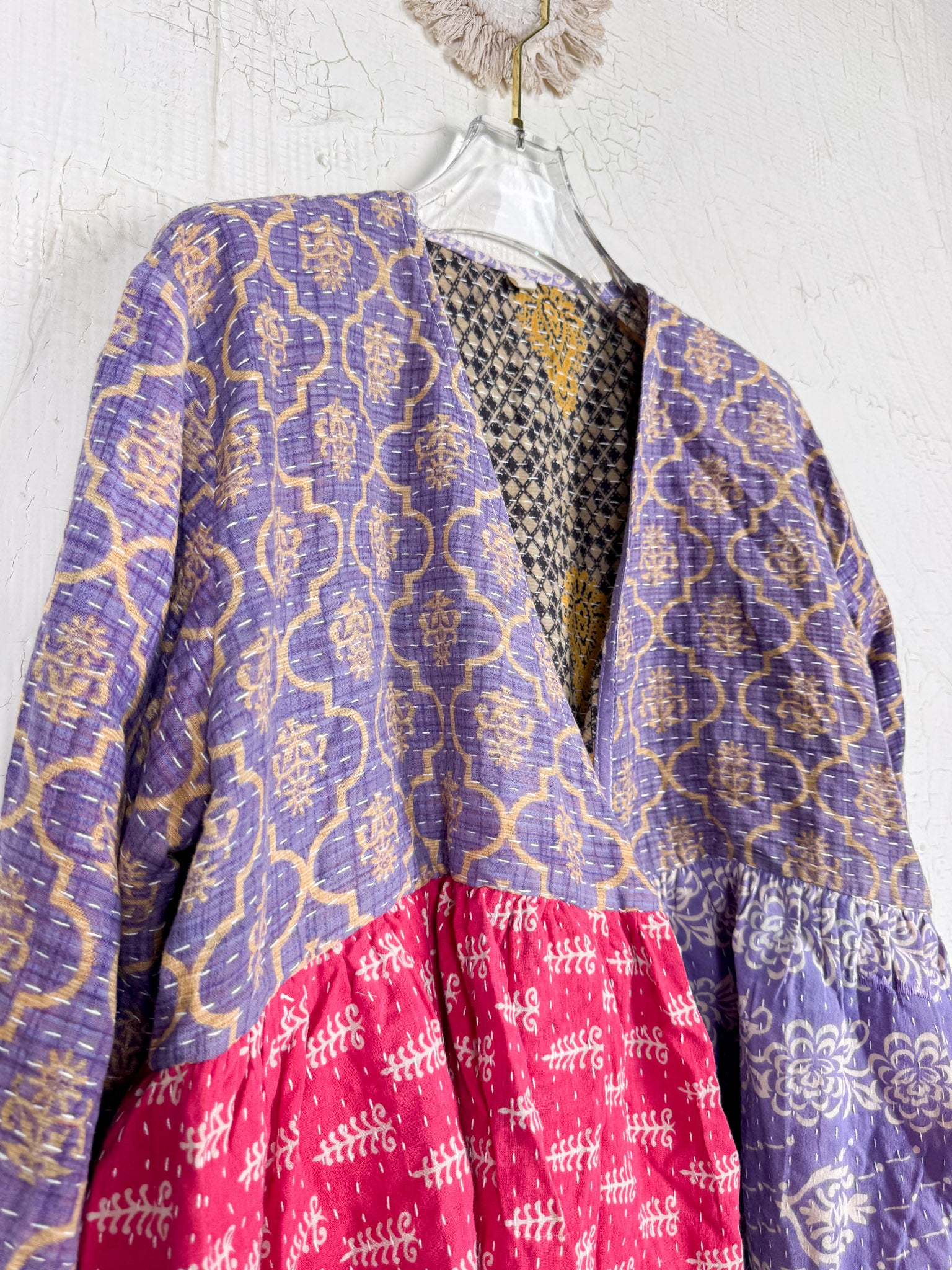 This ONE-OF-A-KIND Kantha Angiya Top, crafted from vintage Kantha, is a vibrant, hand-stitched piece of wearable art. Its V- neck, Balloon sleeve with frill design flatters all figures, offering a versatile and comfortable addition that tells a story.
