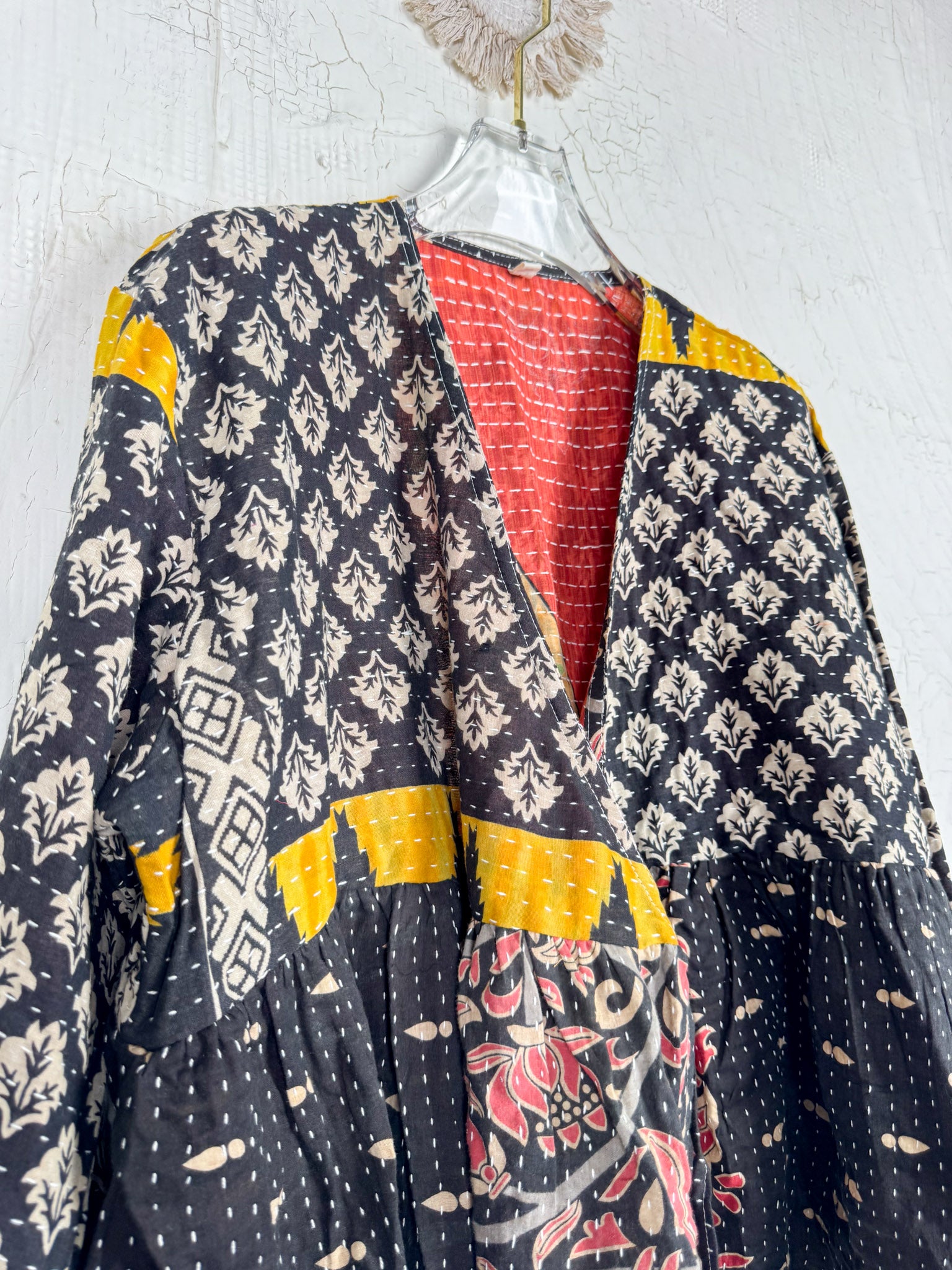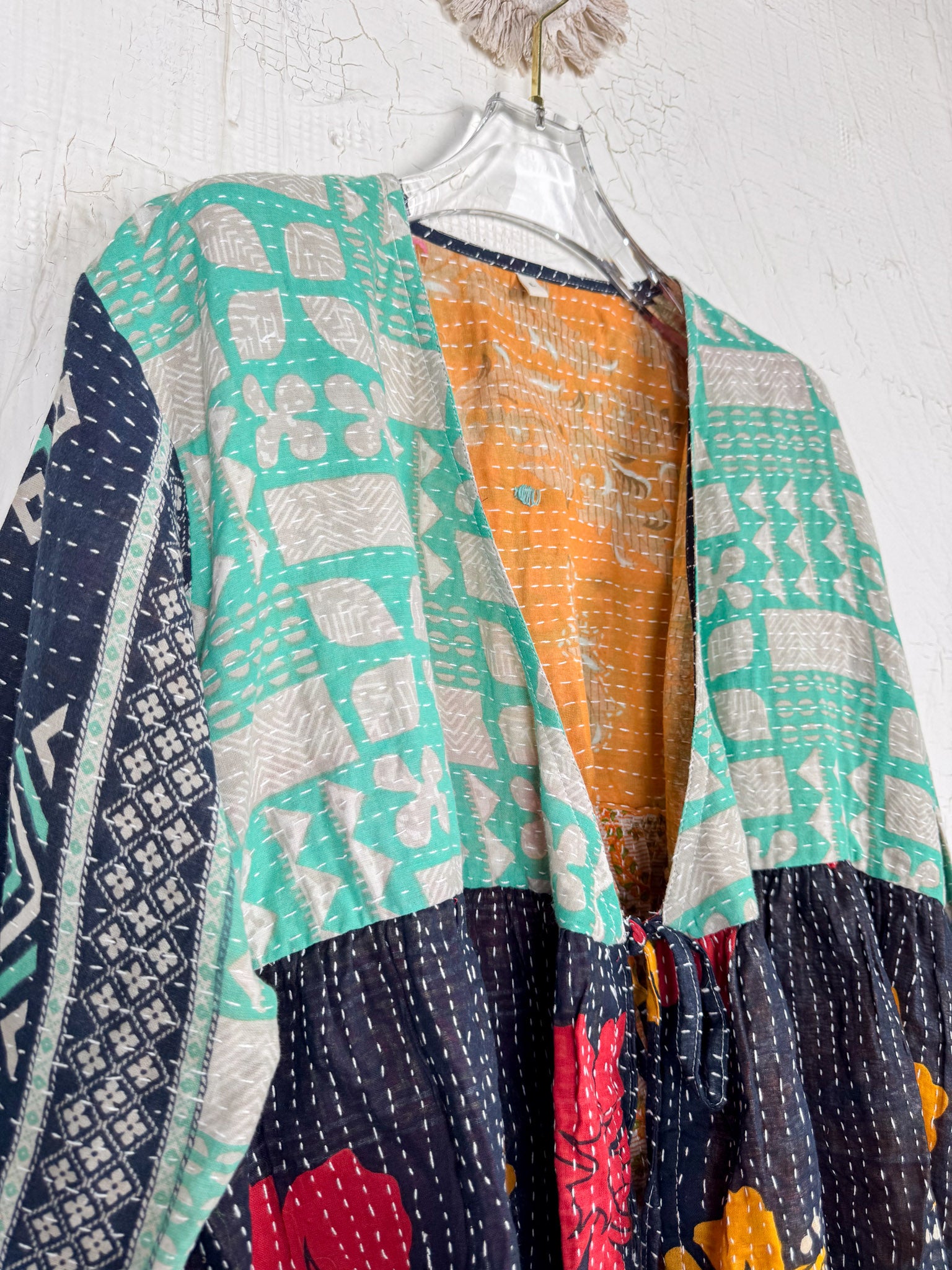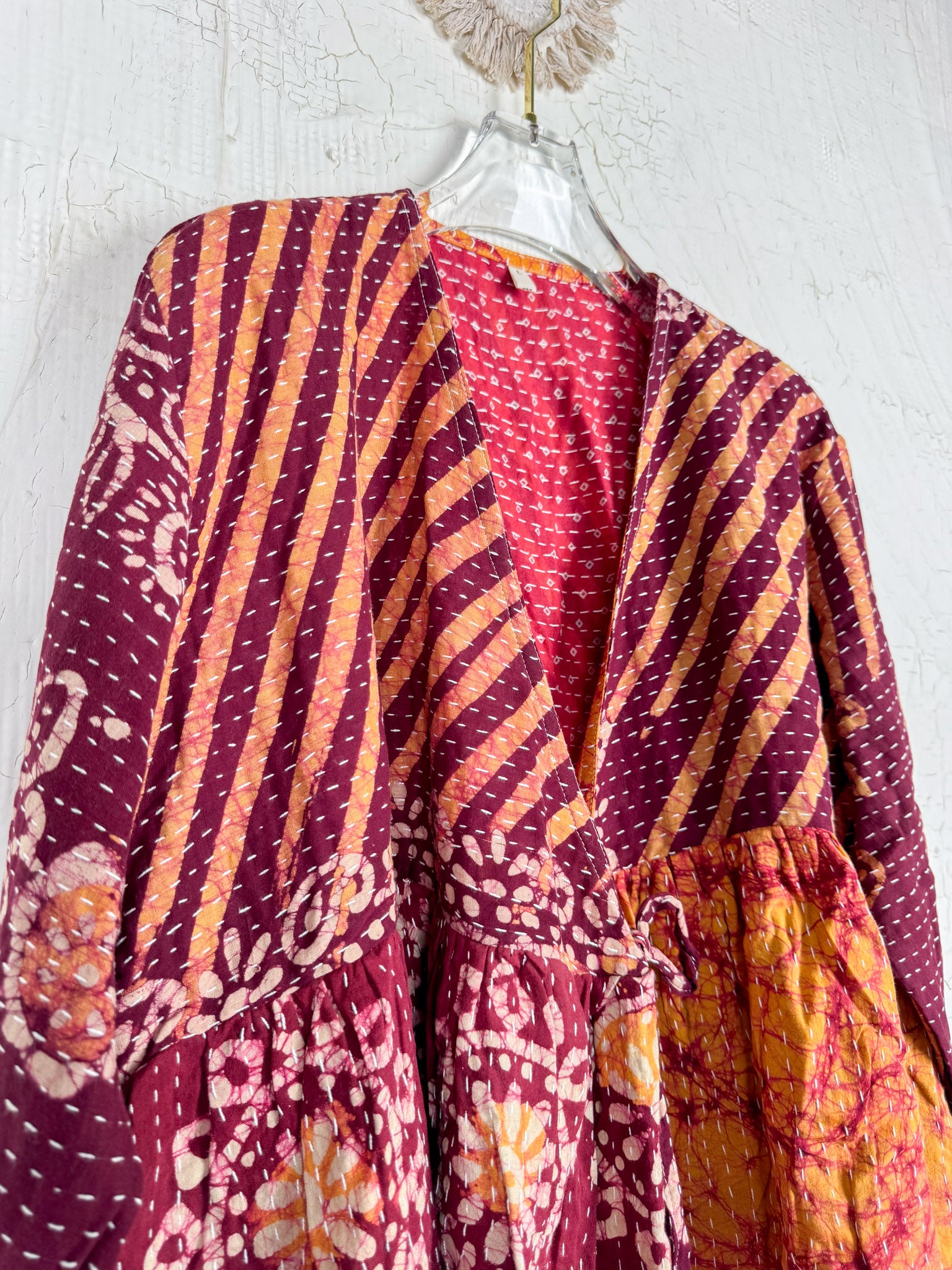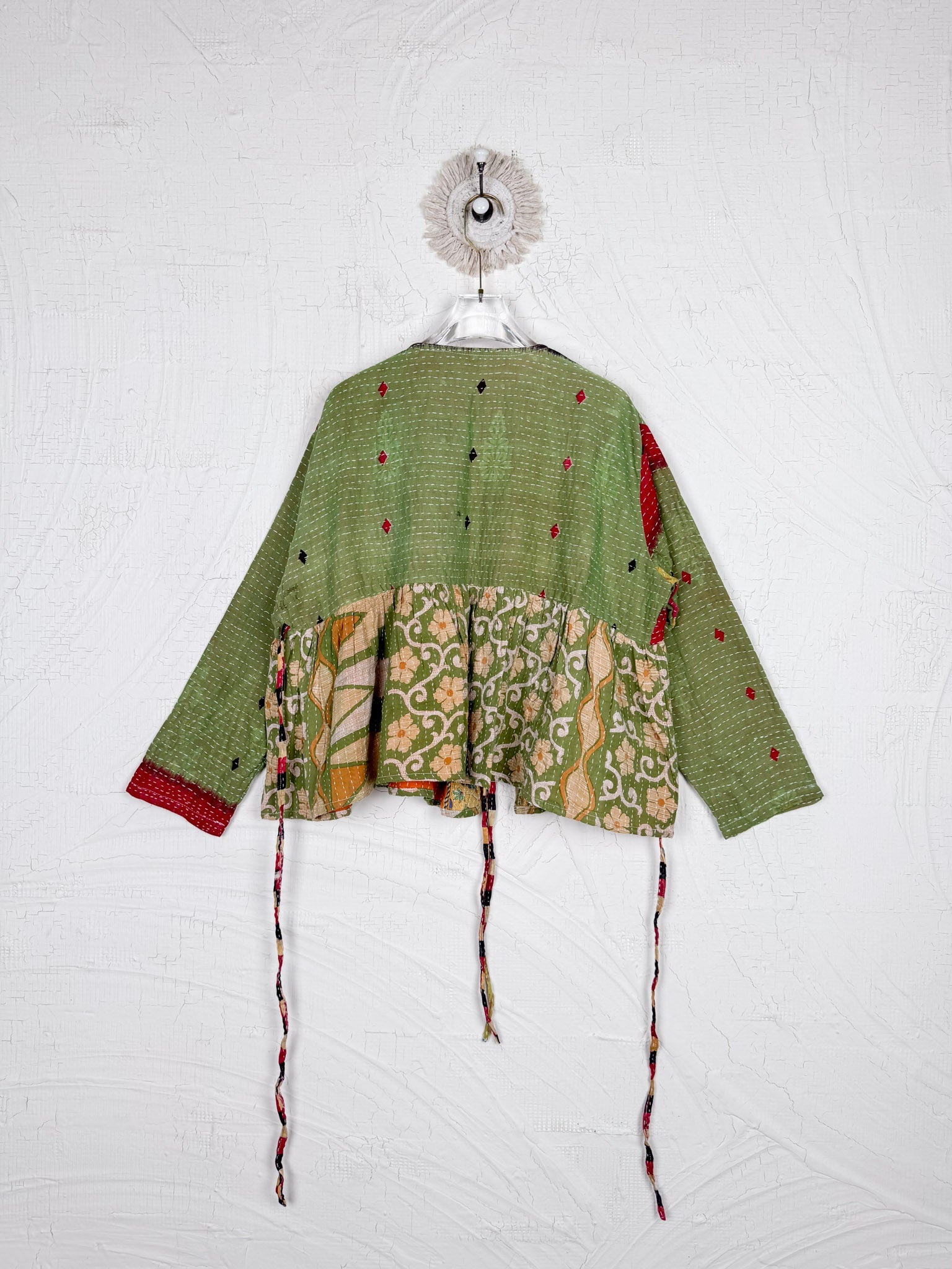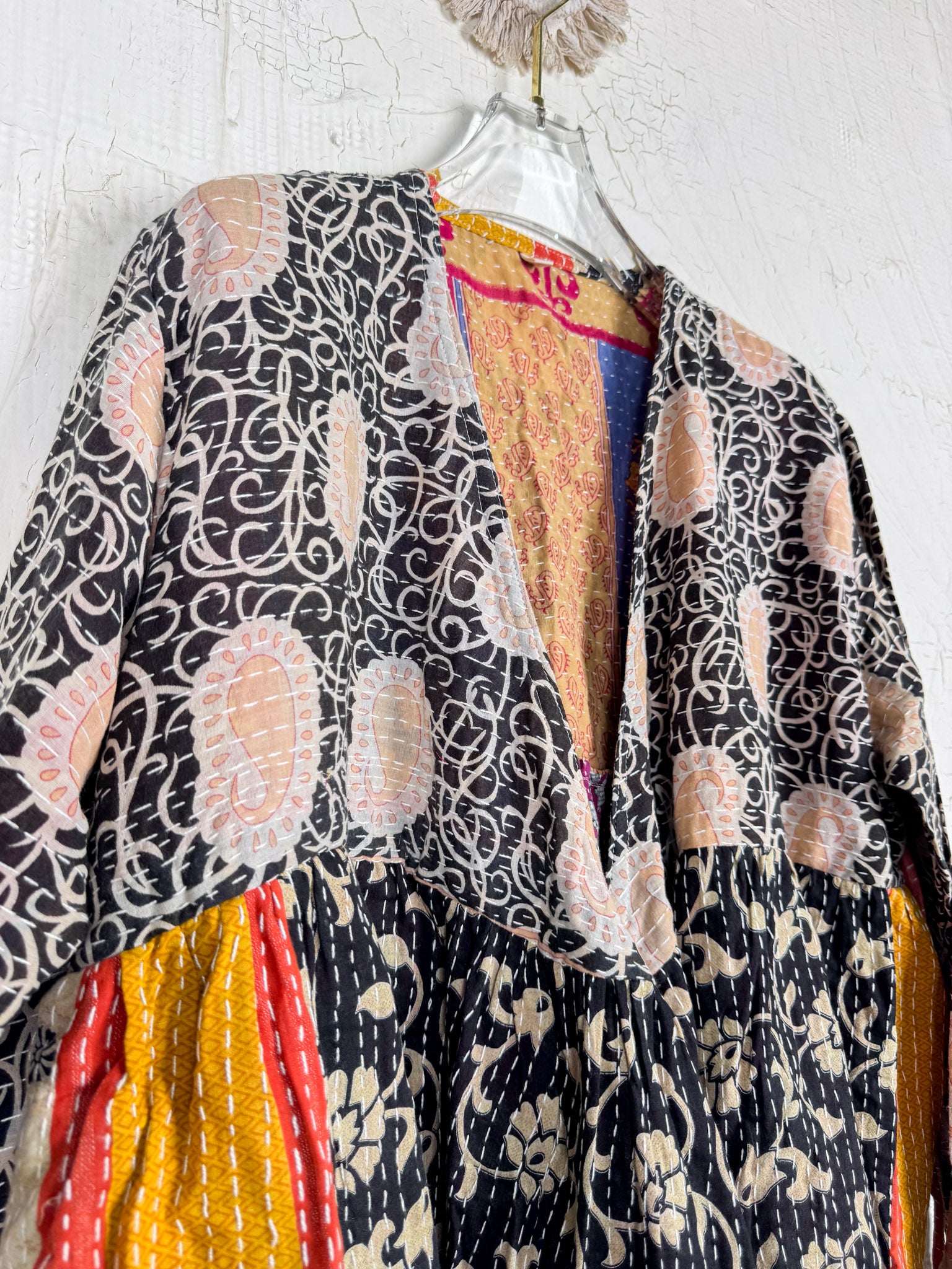 This ONE-OF-A-KIND Kantha Angiya Top, crafted from vintage Kantha, is a vibrant, hand-stitched piece of wearable art. Its V- neck, Balloon sleeve with frill design flatters all figures, offering a versatile and comfortable addition that tells a story.