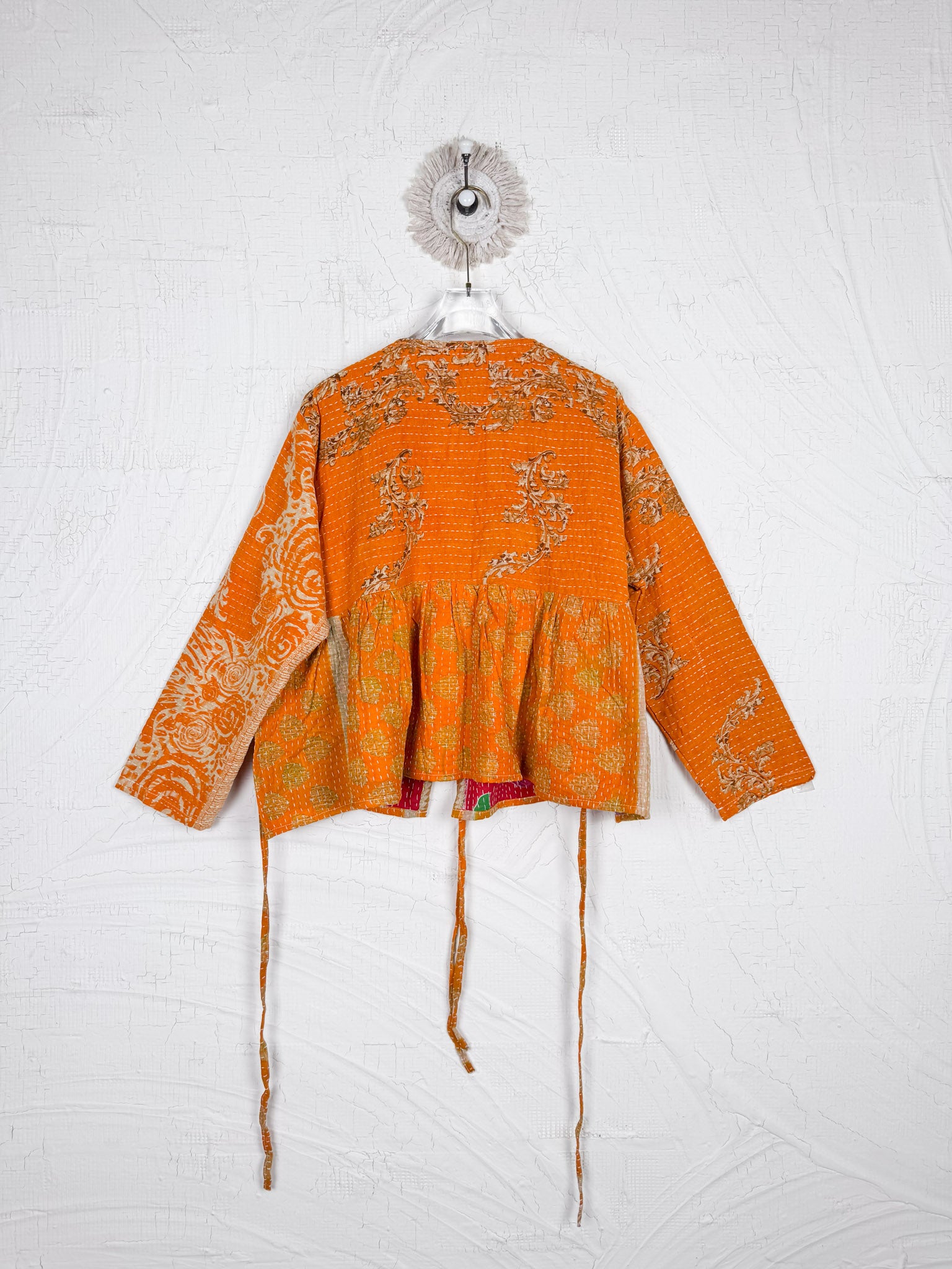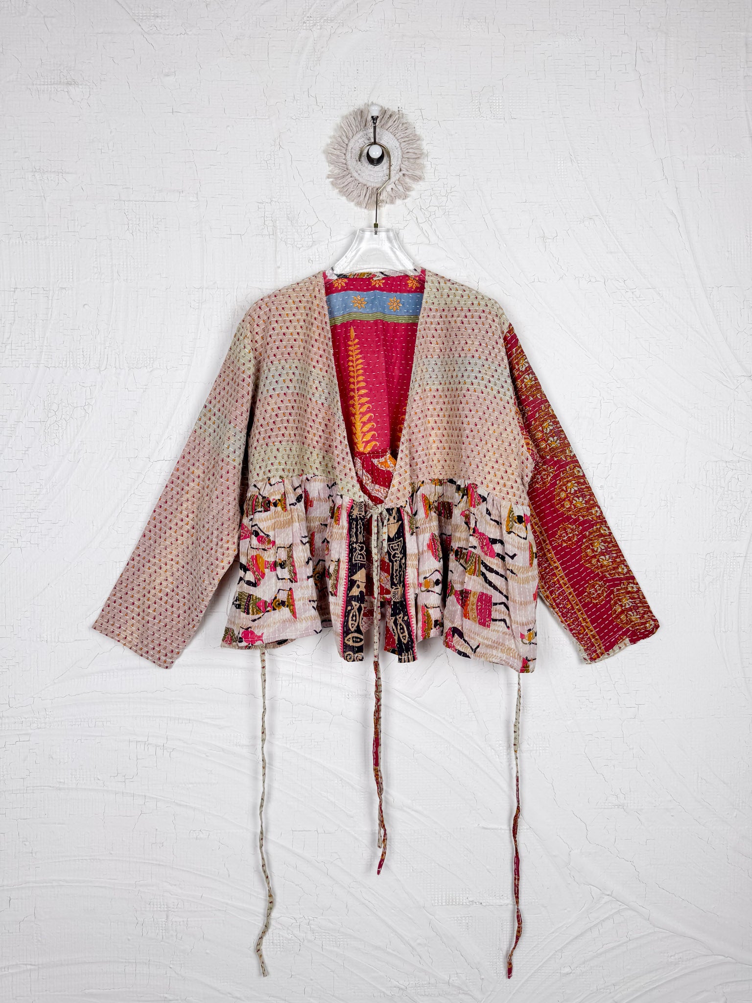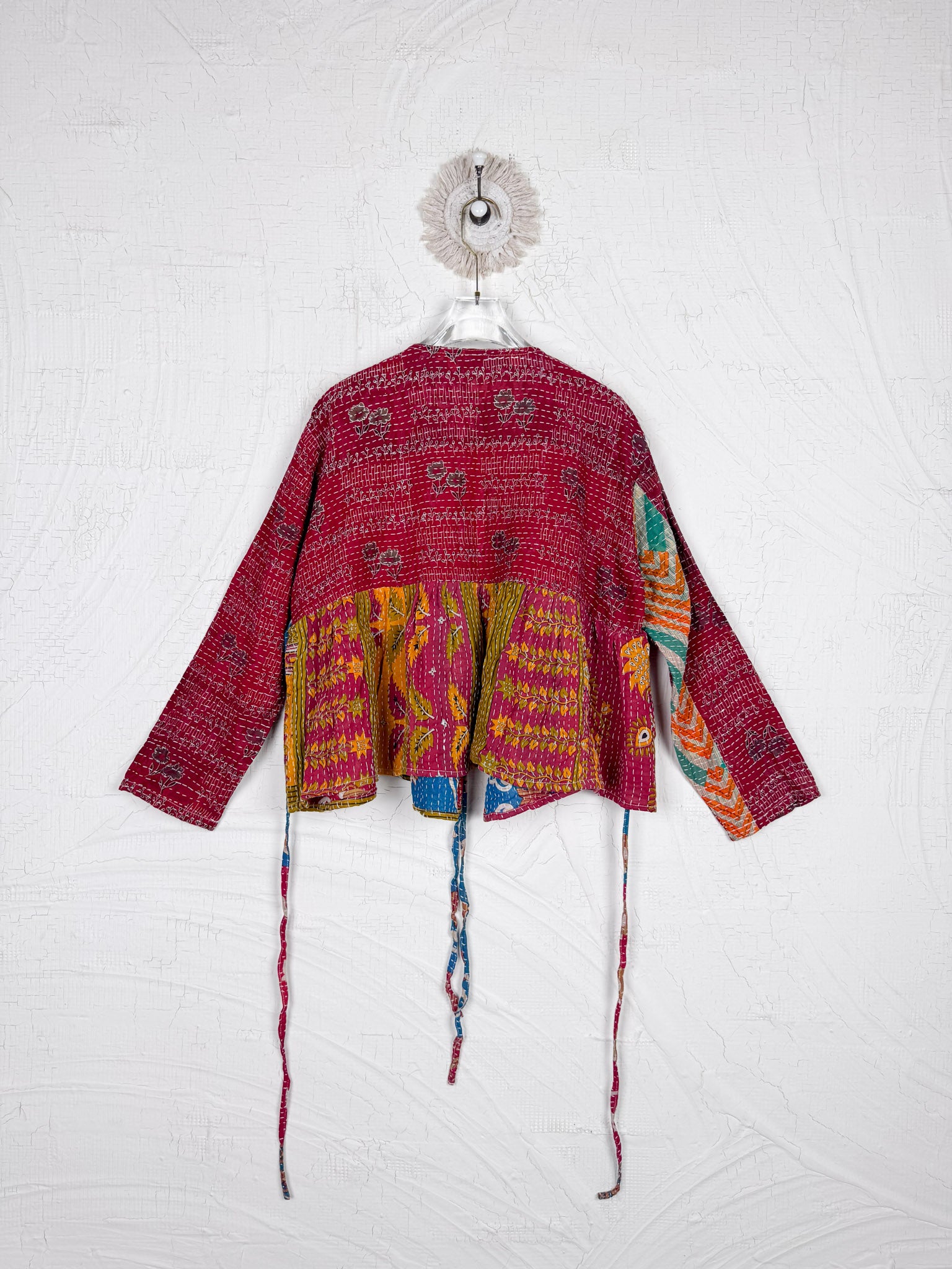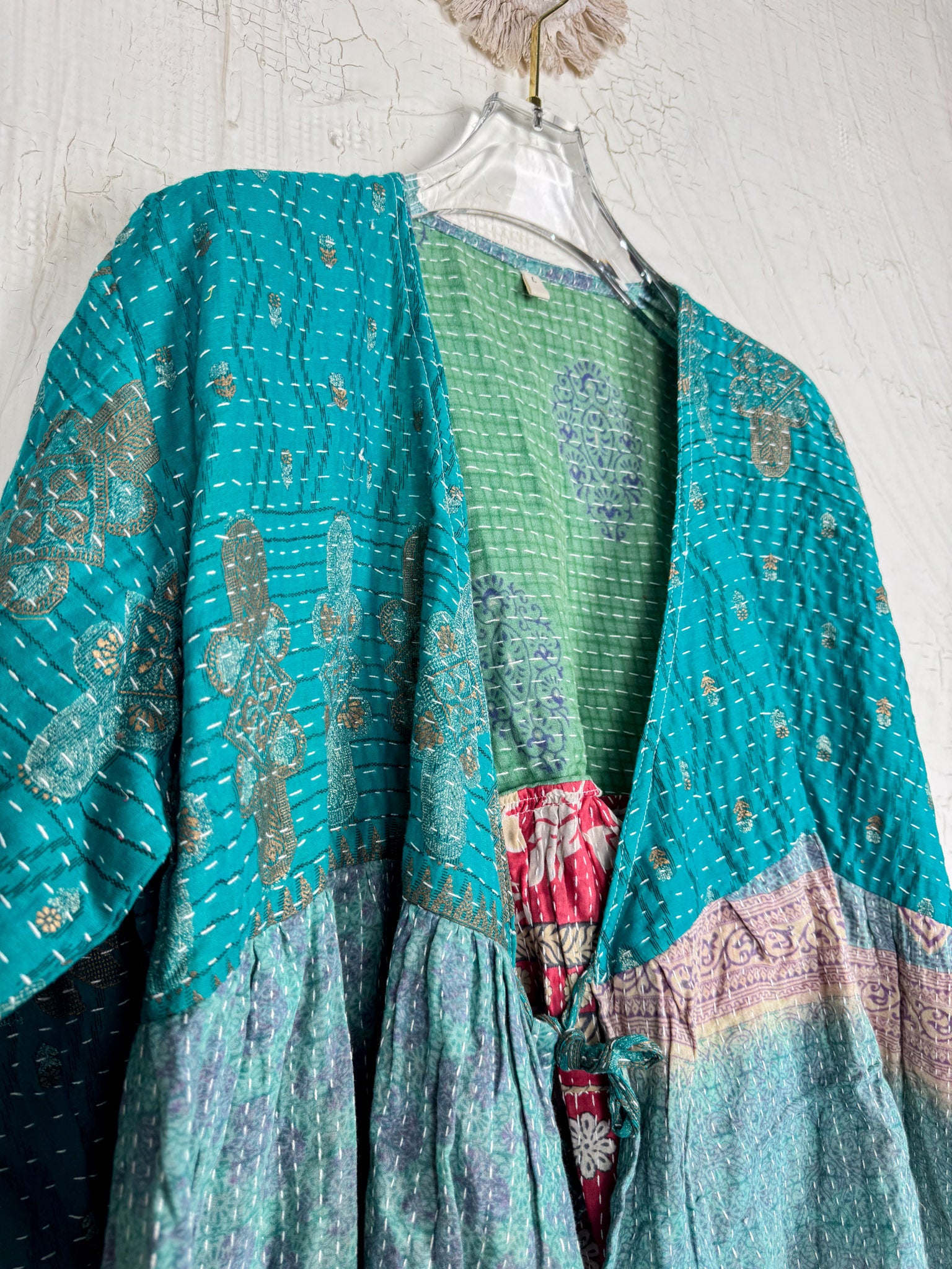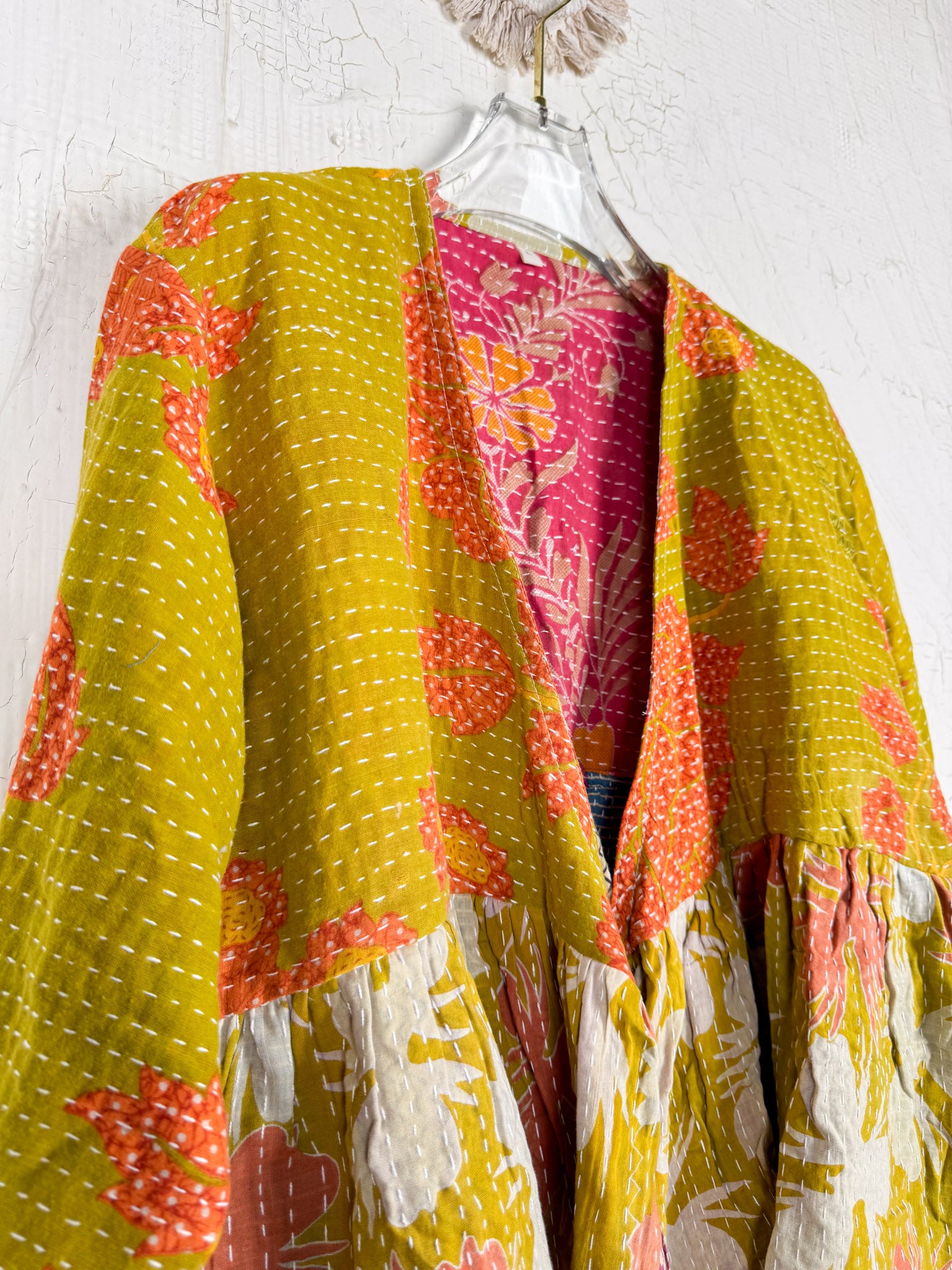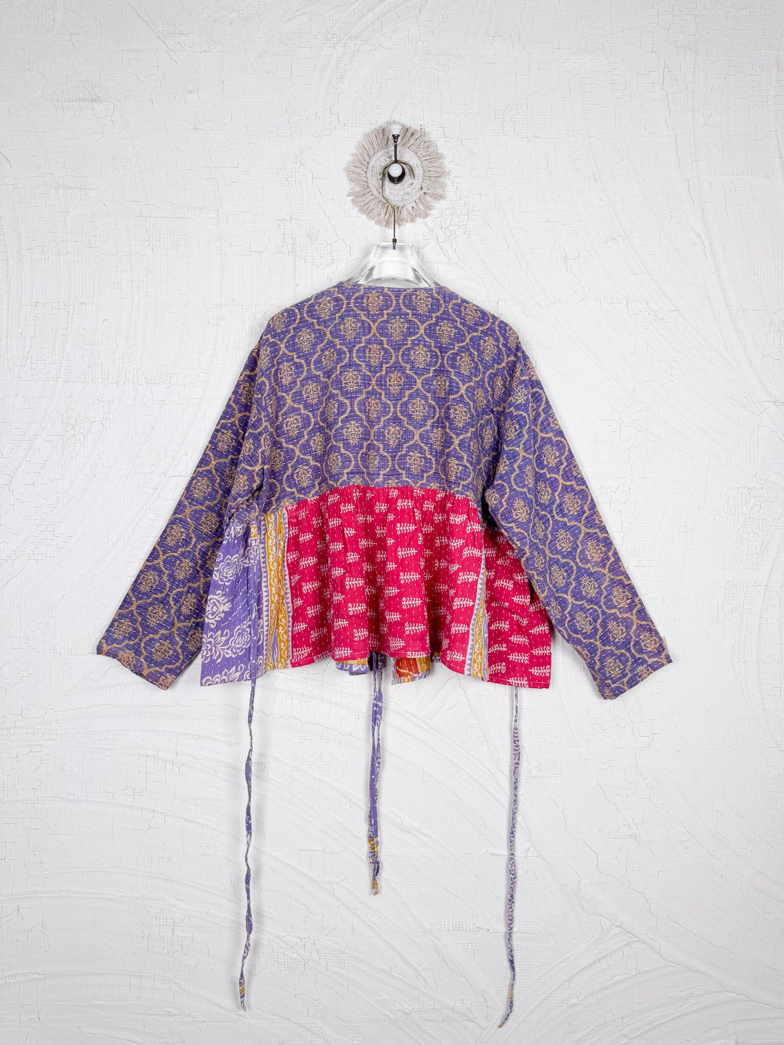 This ONE-OF-A-KIND Kantha Angiya Top, crafted from vintage Kantha, is a vibrant, hand-stitched piece of wearable art. Its V- neck, Balloon sleeve with frill design flatters all figures, offering a versatile and comfortable addition that tells a story.