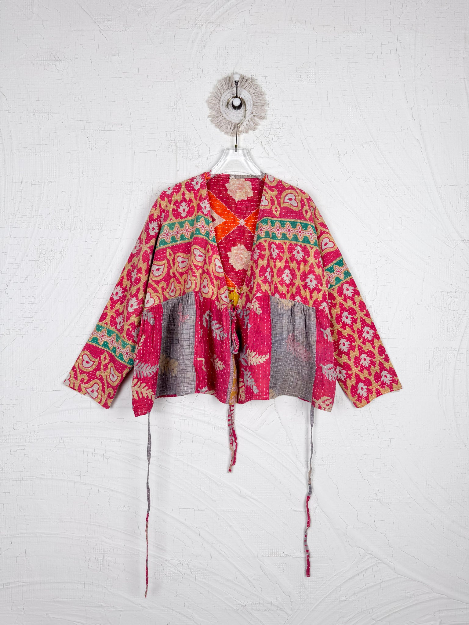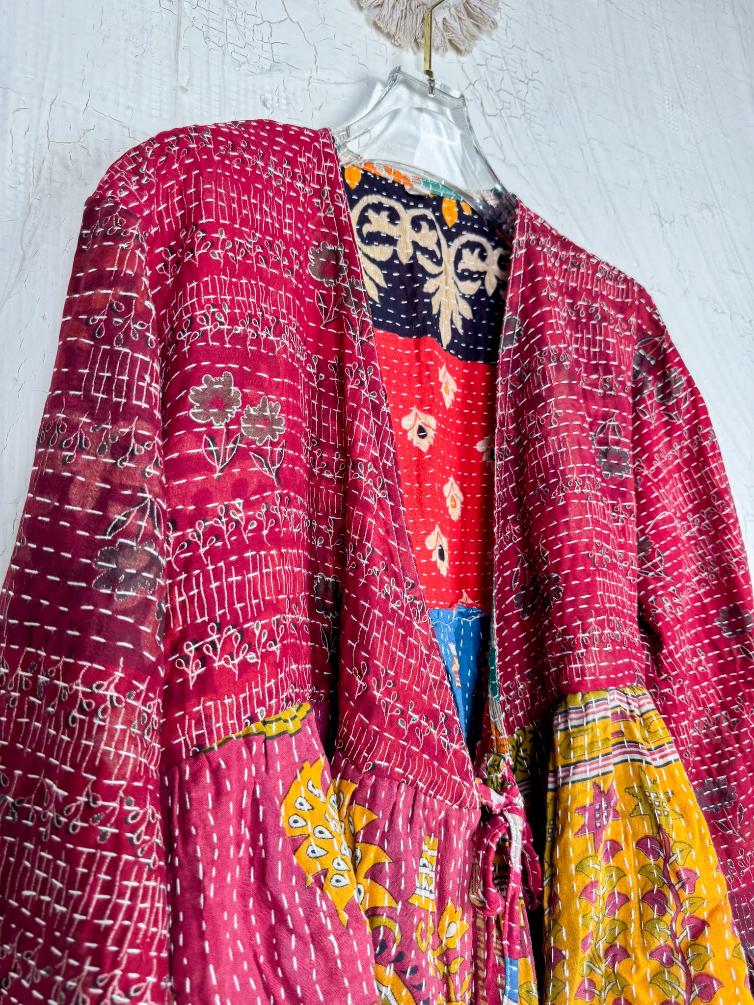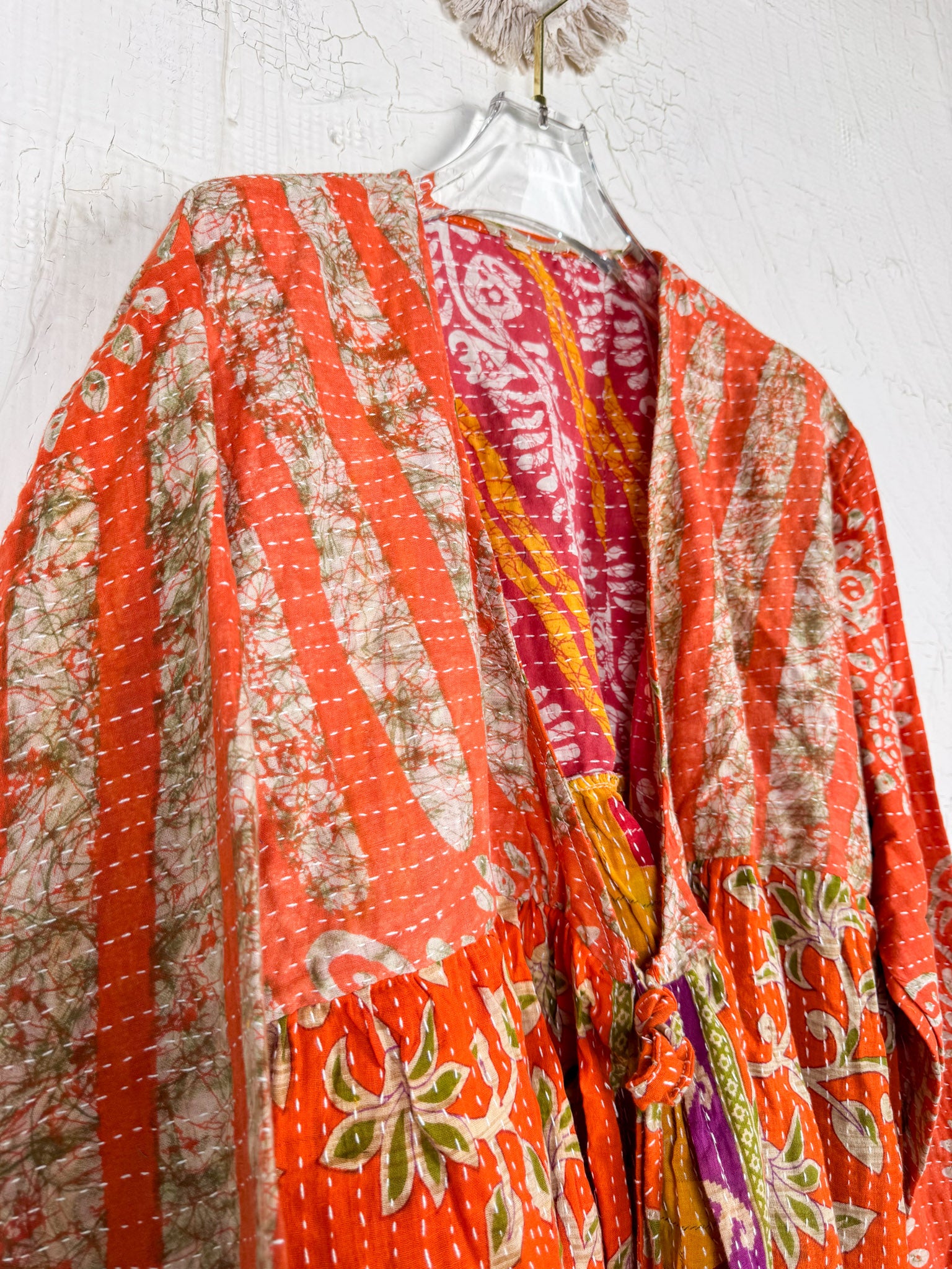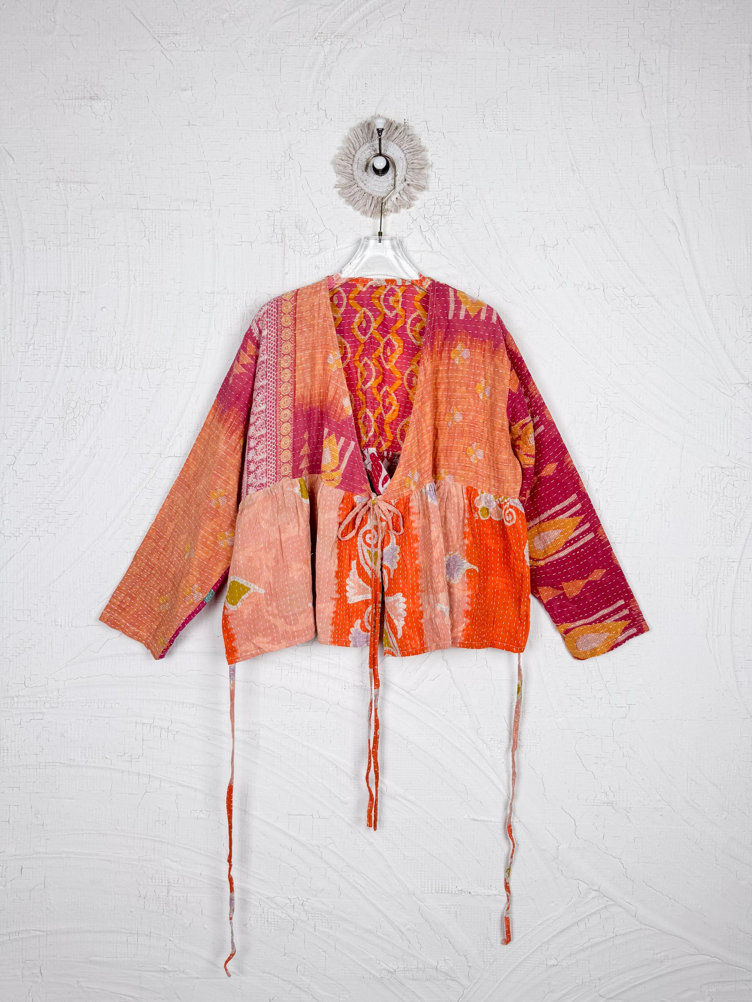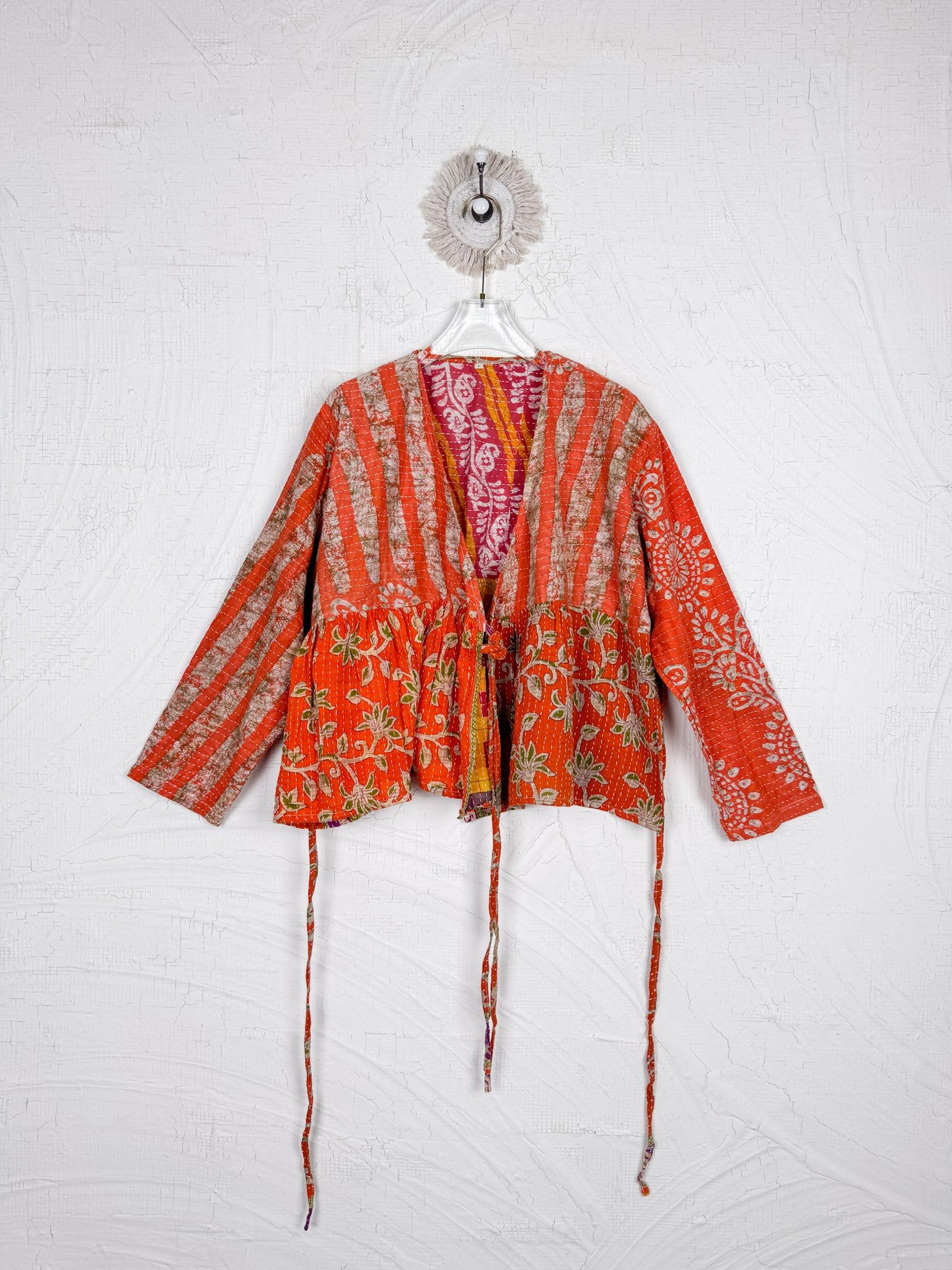 This ONE-OF-A-KIND Kantha Angiya Top, crafted from vintage Kantha, is a vibrant, hand-stitched piece of wearable art. Its V- neck, Balloon sleeve with frill design flatters all figures, offering a versatile and comfortable addition that tells a story.