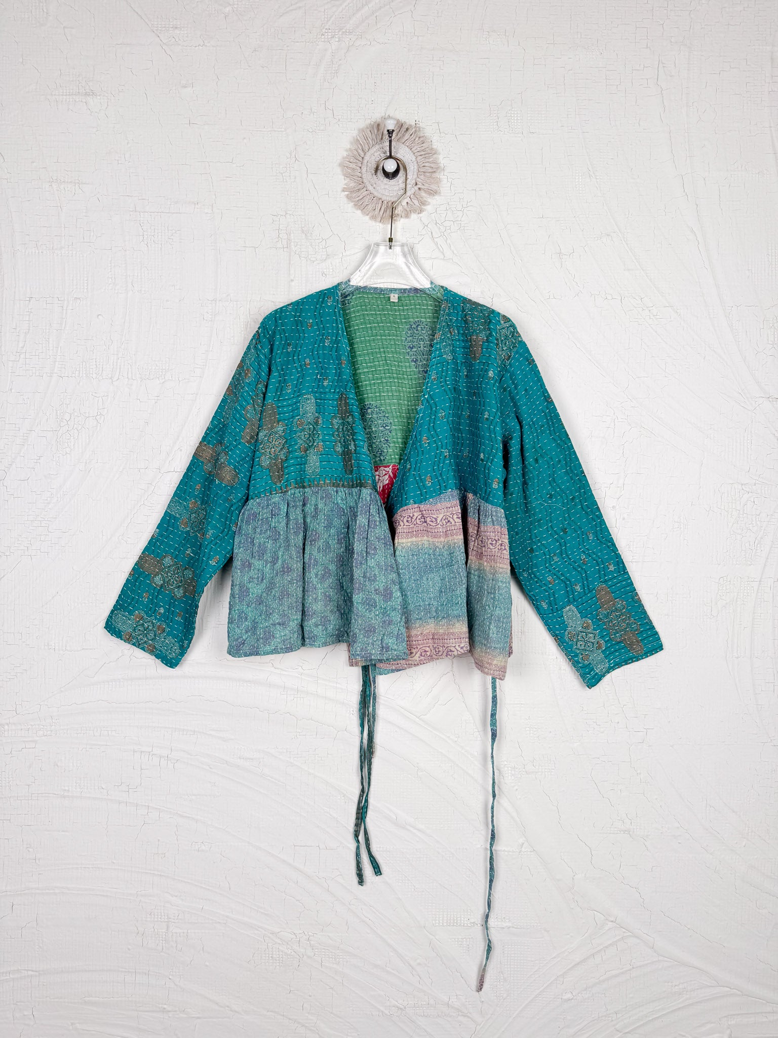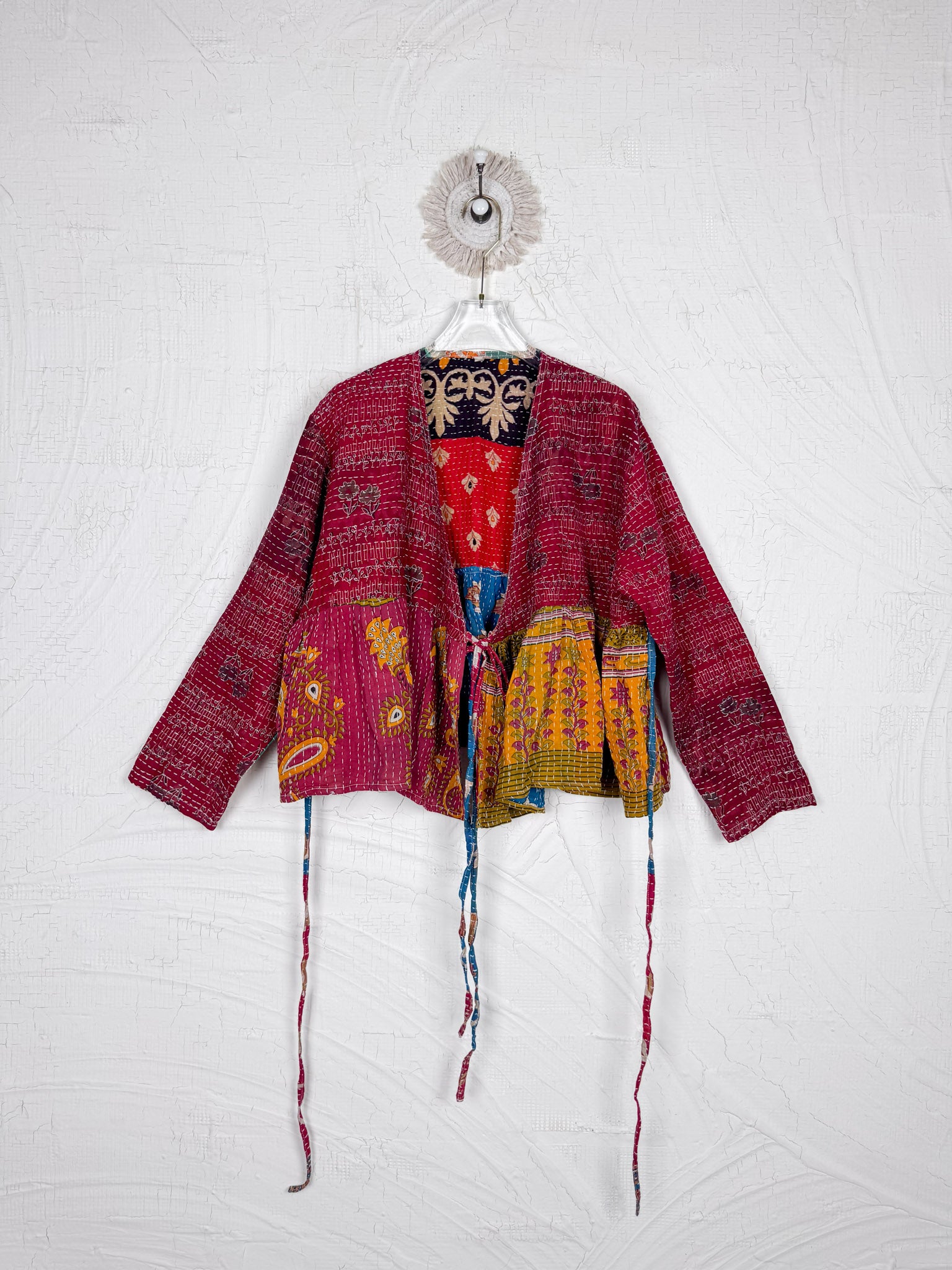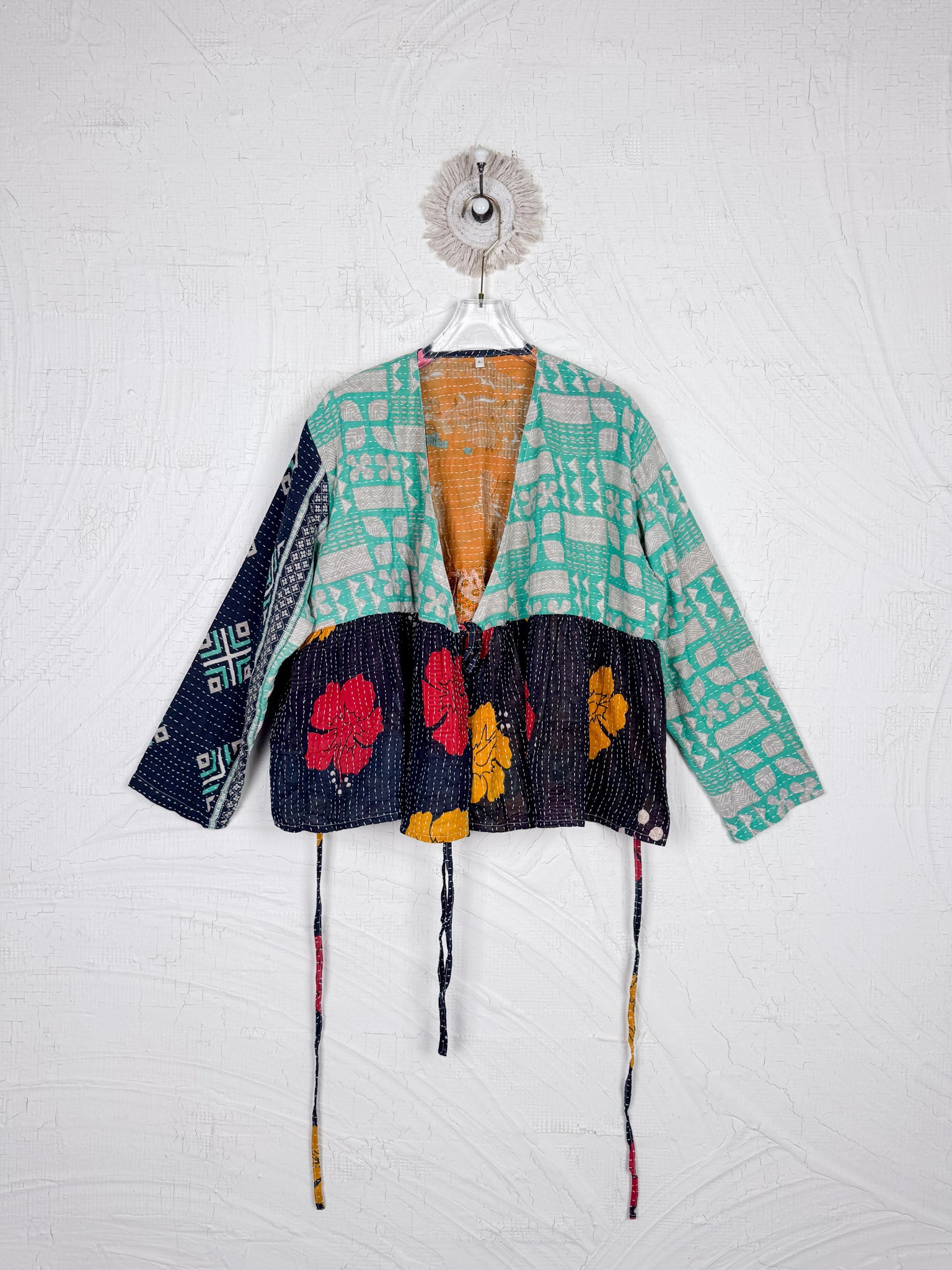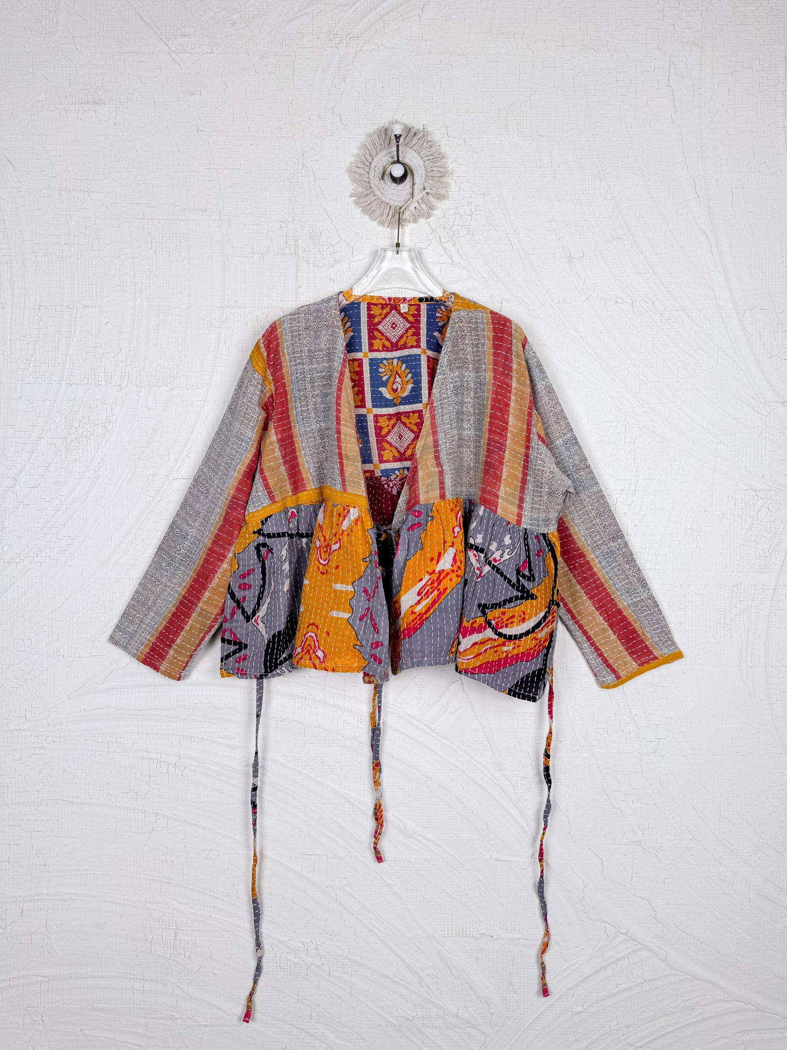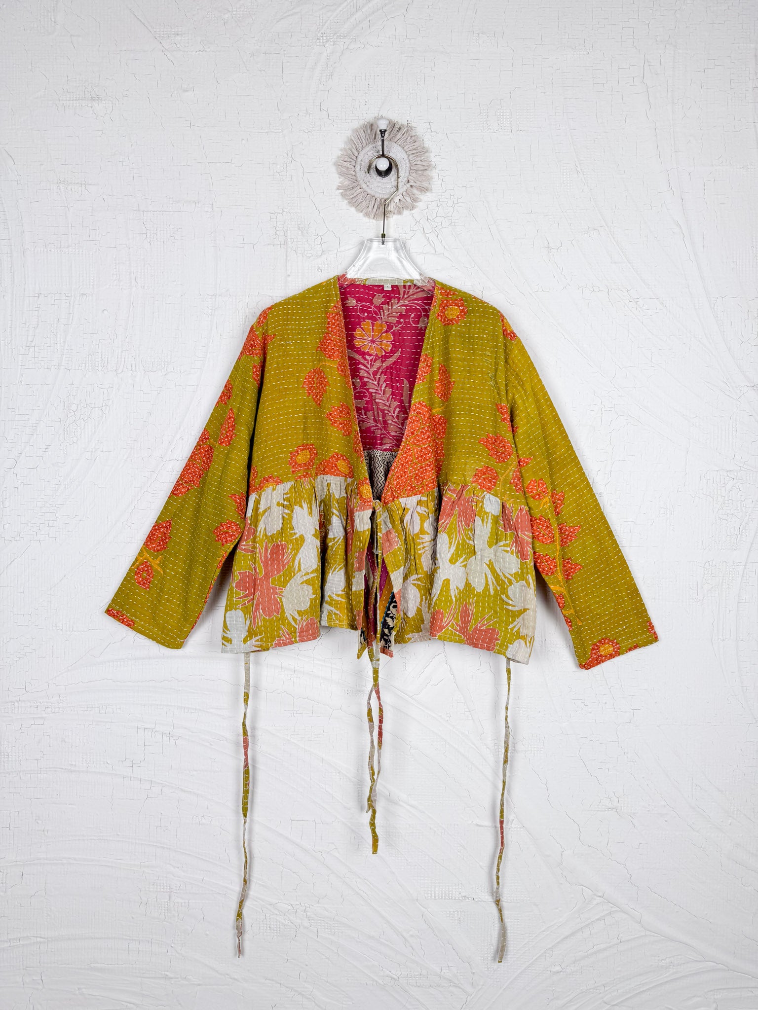 This ONE-OF-A-KIND Kantha Angiya Top, crafted from vintage Kantha, is a vibrant, hand-stitched piece of wearable art. Its V- neck, Balloon sleeve with frill design flatters all figures, offering a versatile and comfortable addition that tells a story.
