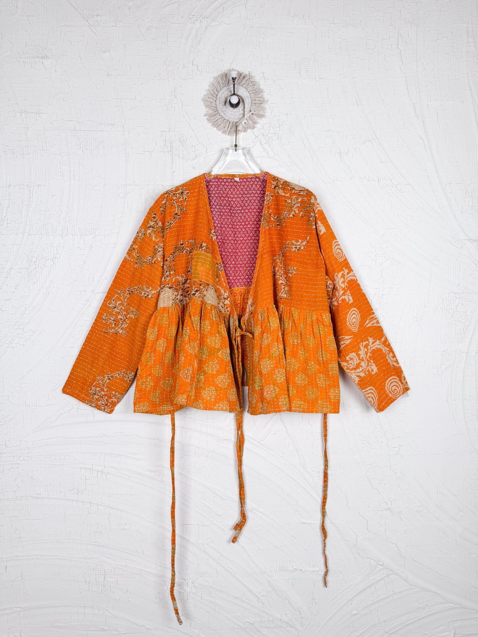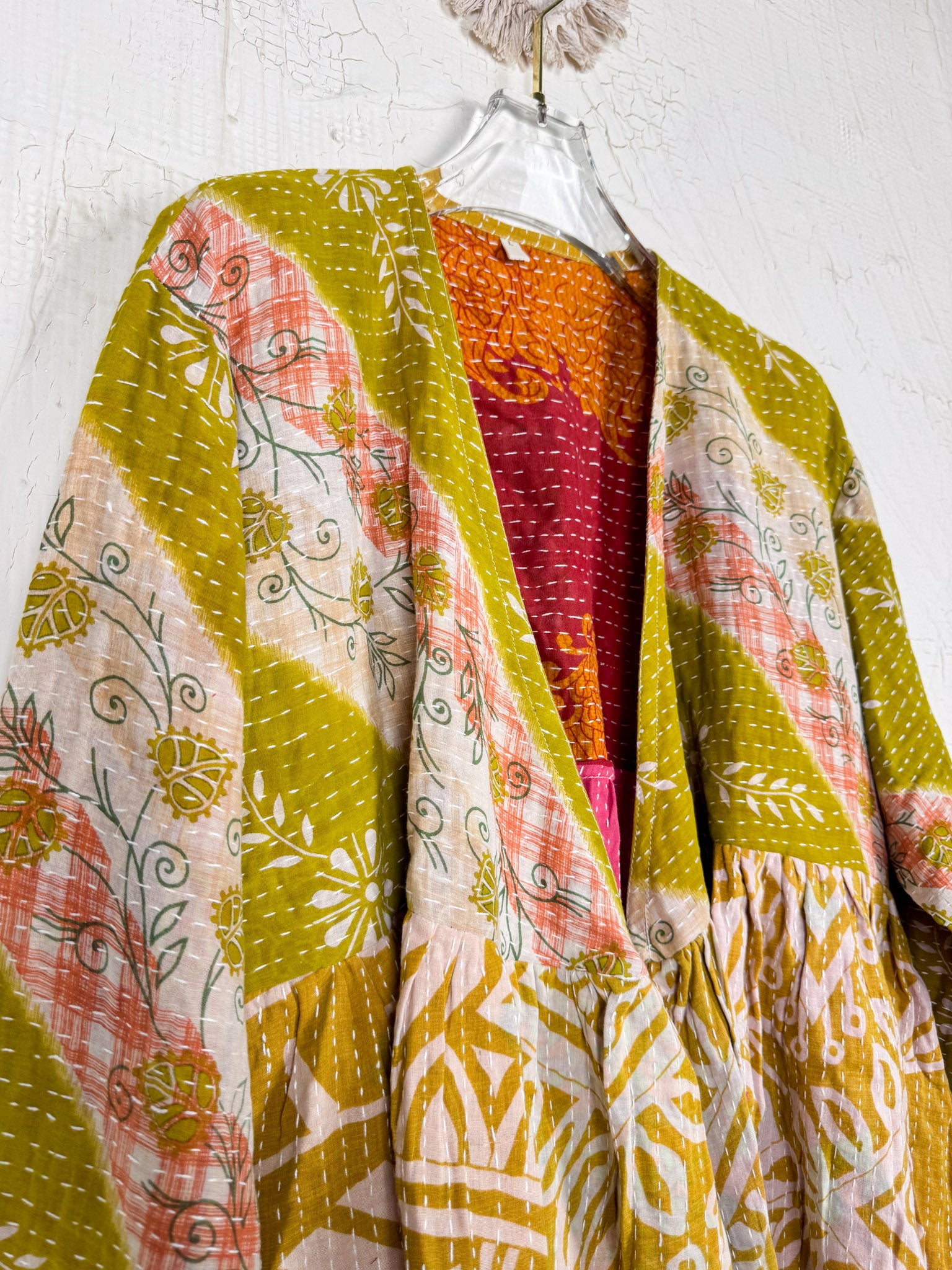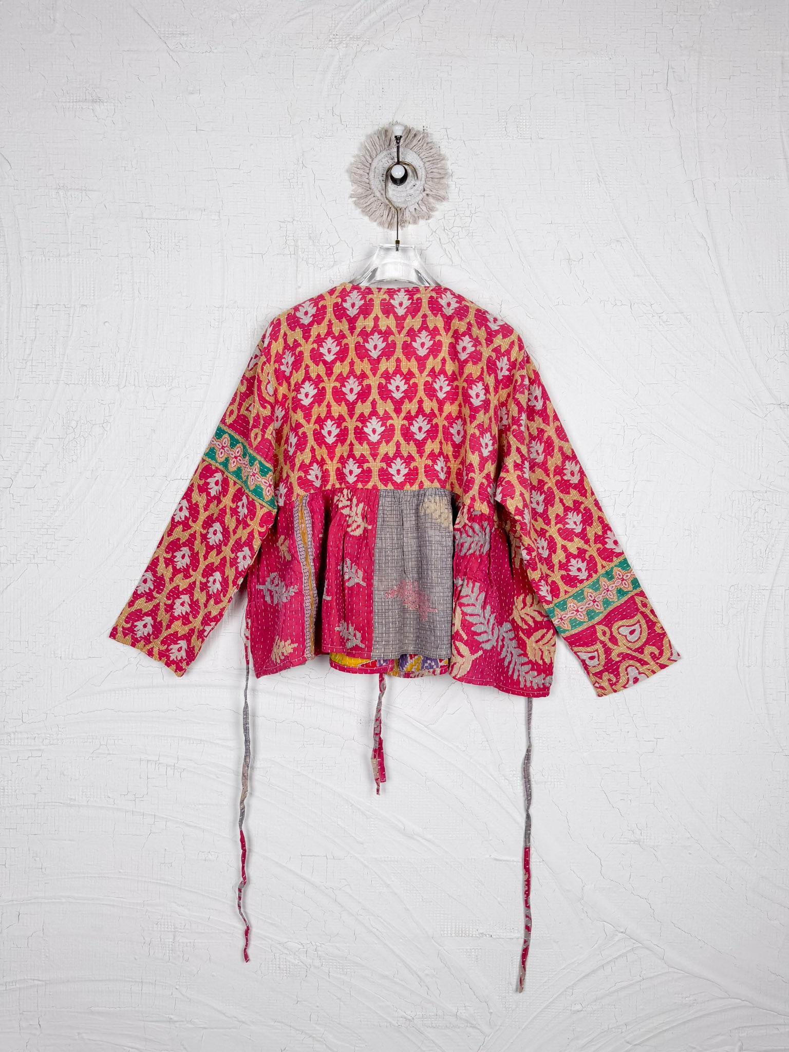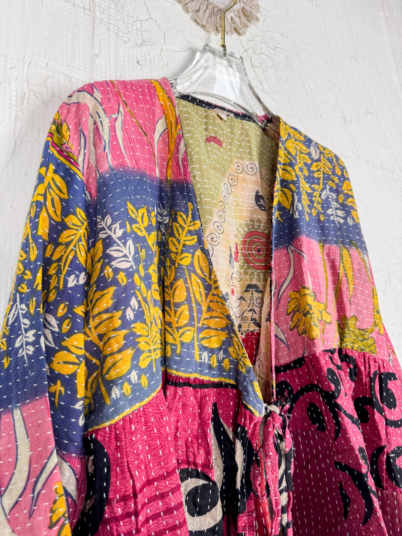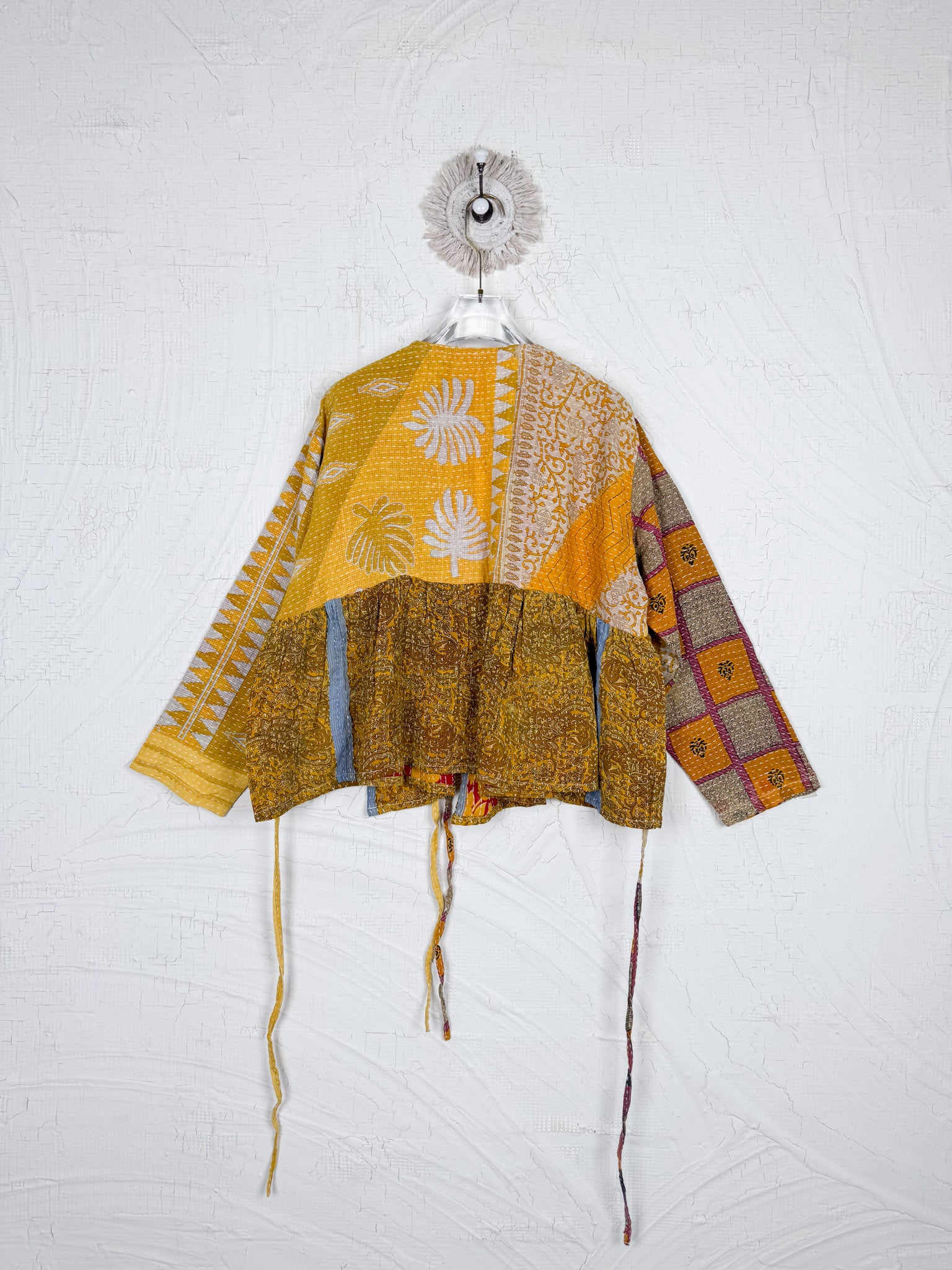 This ONE-OF-A-KIND Kantha Angiya Top, crafted from vintage Kantha, is a vibrant, hand-stitched piece of wearable art. Its V- neck, Balloon sleeve with frill design flatters all figures, offering a versatile and comfortable addition that tells a story.