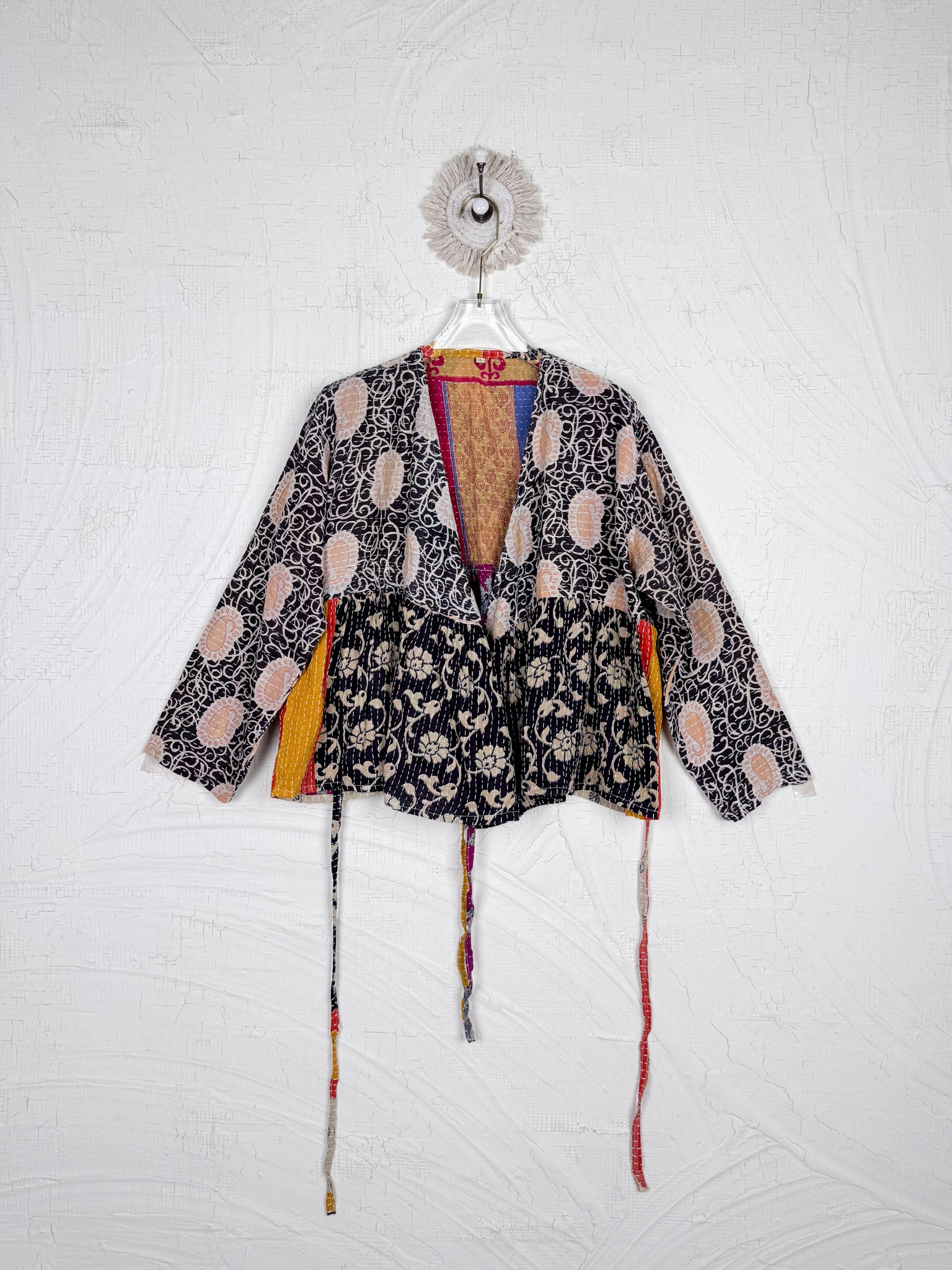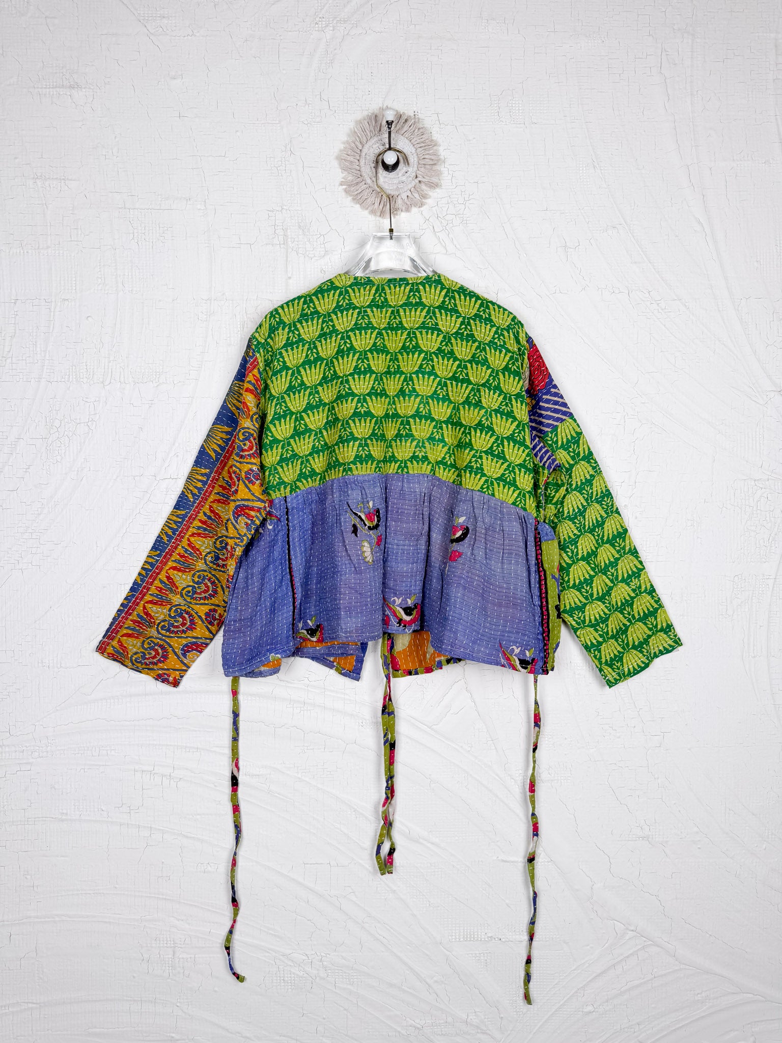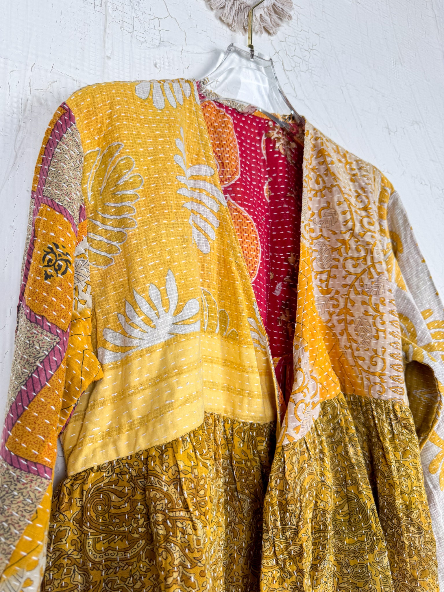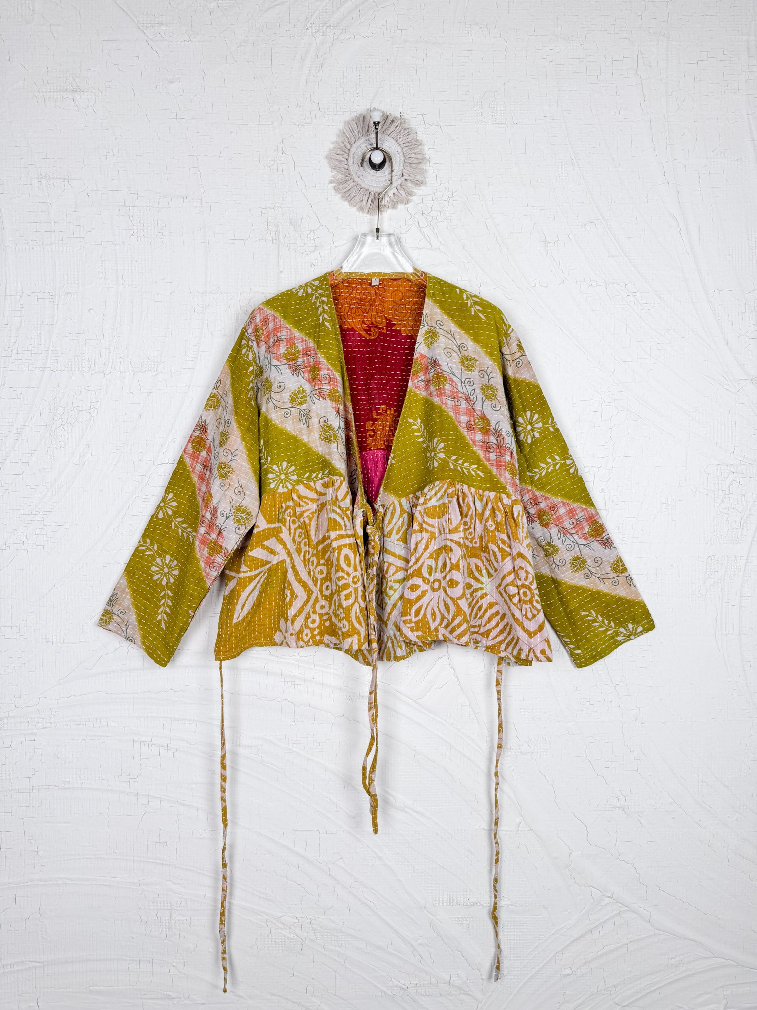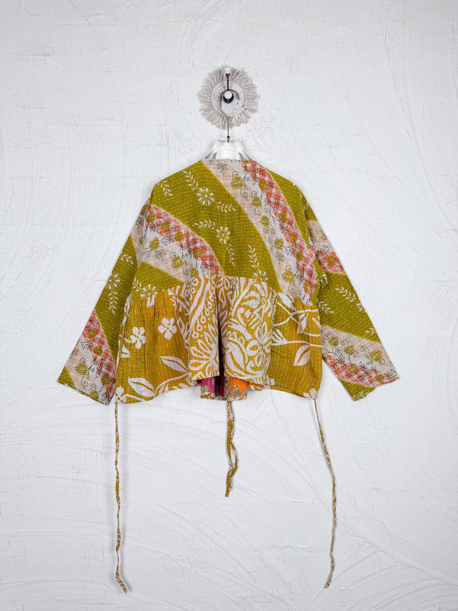 This ONE-OF-A-KIND Kantha Angiya Top, crafted from vintage Kantha, is a vibrant, hand-stitched piece of wearable art. Its V- neck, Balloon sleeve with frill design flatters all figures, offering a versatile and comfortable addition that tells a story.