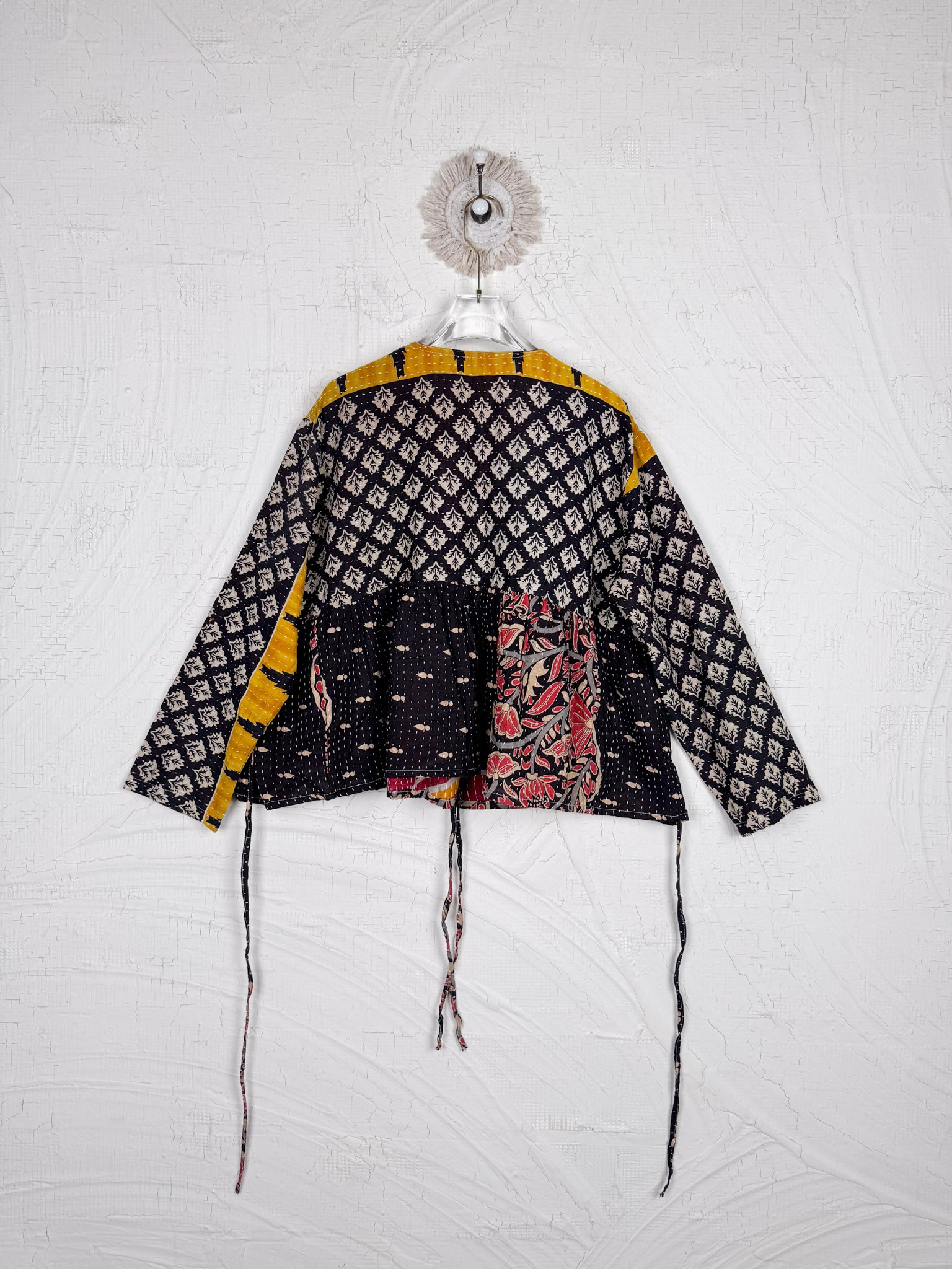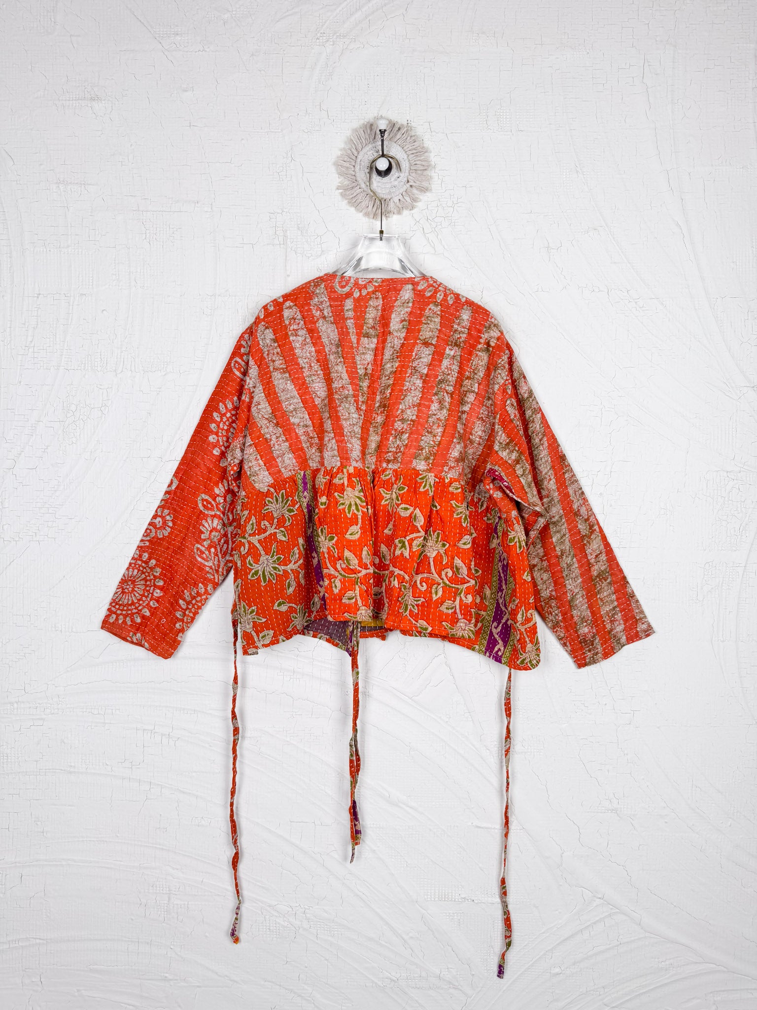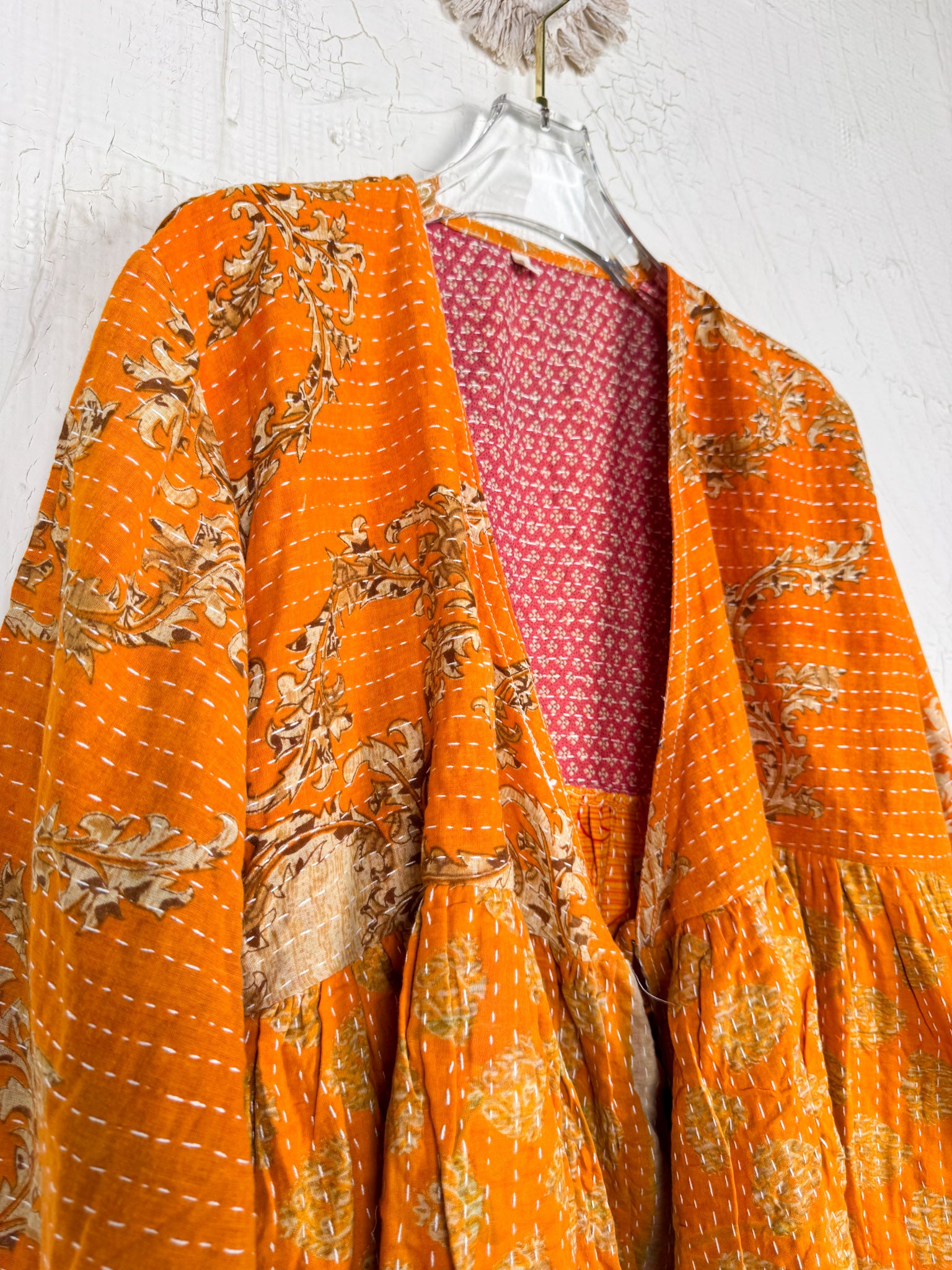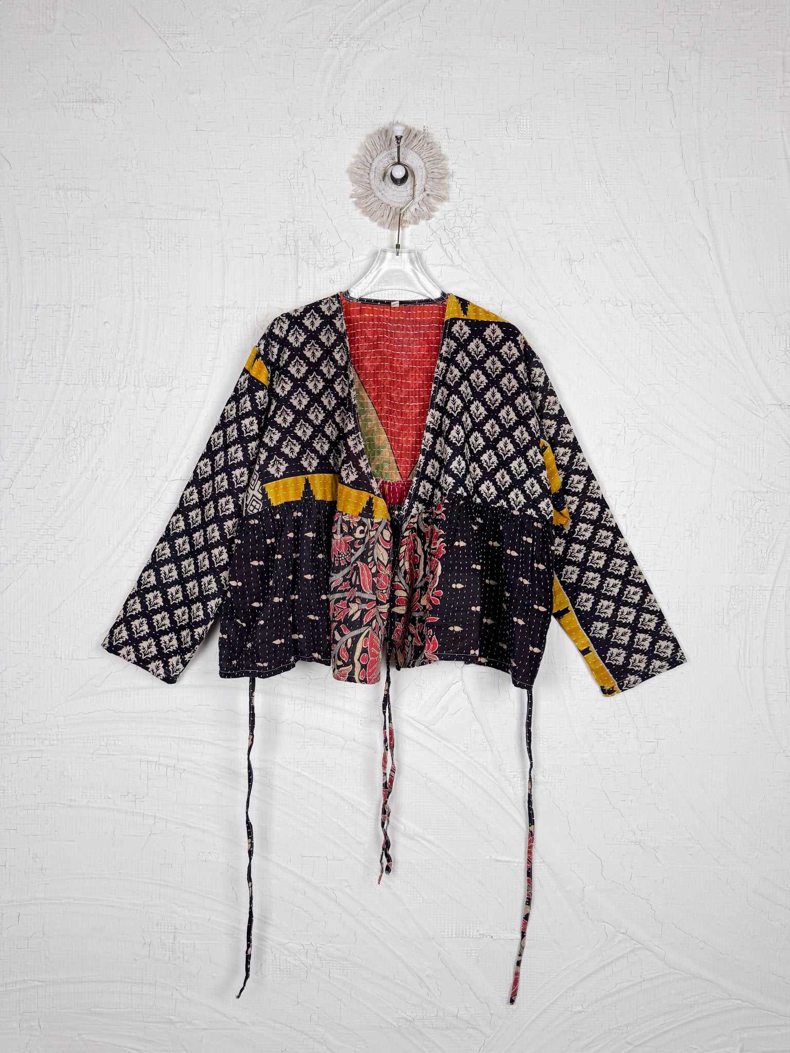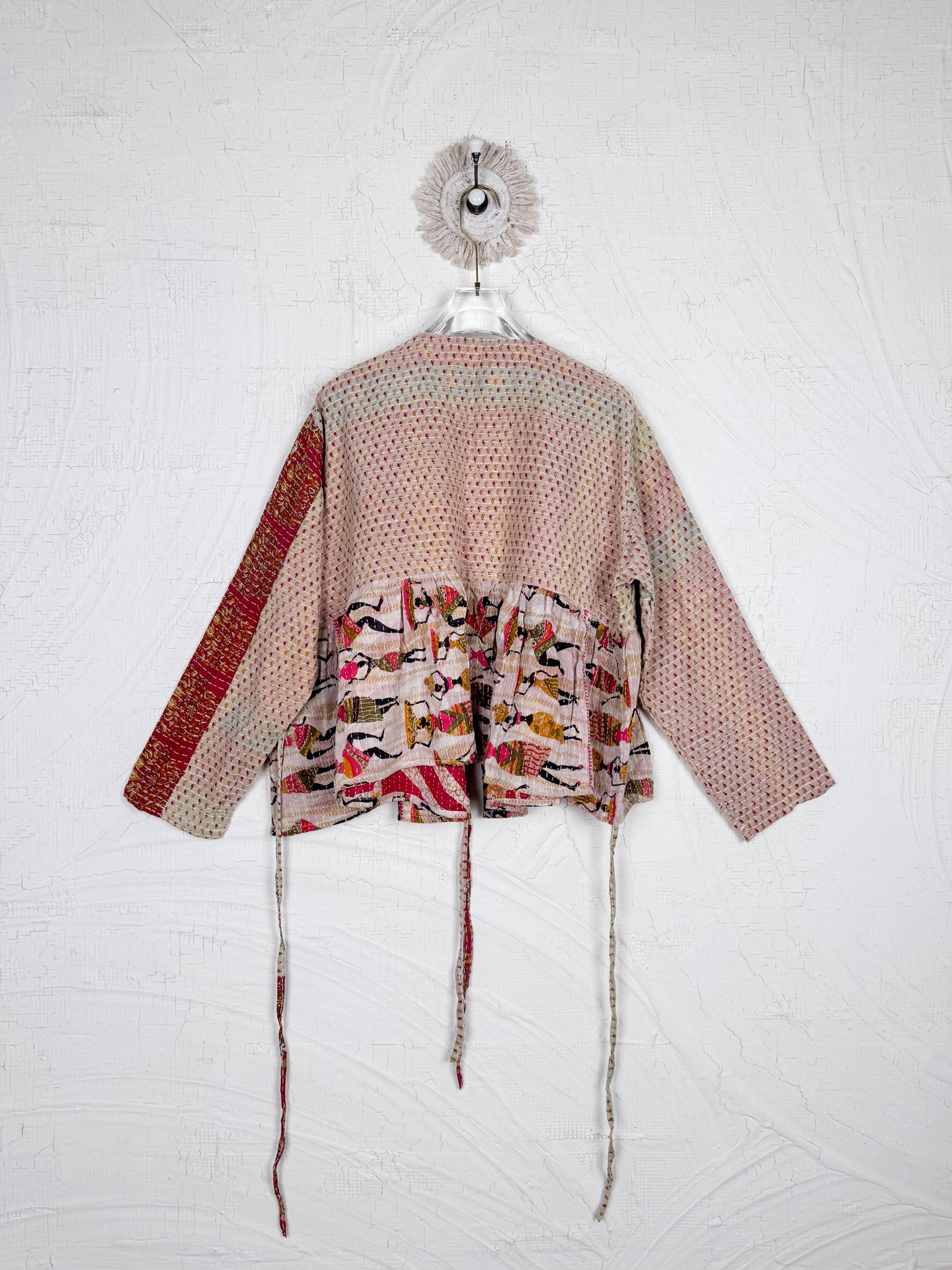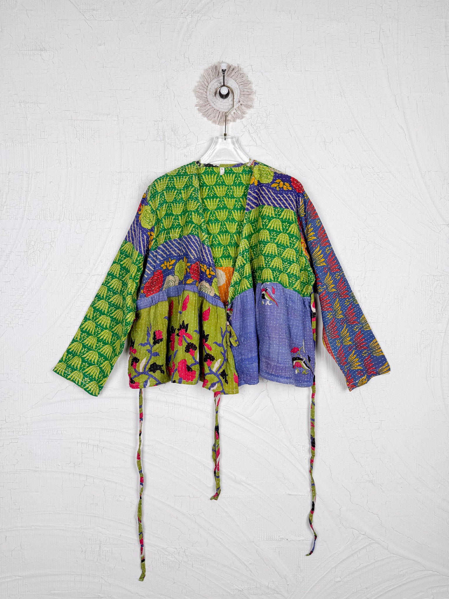This ONE-OF-A-KIND Kantha Angiya Top, crafted from vintage Kantha, is a vibrant, hand-stitched piece of wearable art. Its V- neck, Balloon sleeve with frill design flatters all figures, offering a versatile and comfortable addition that tells a story.