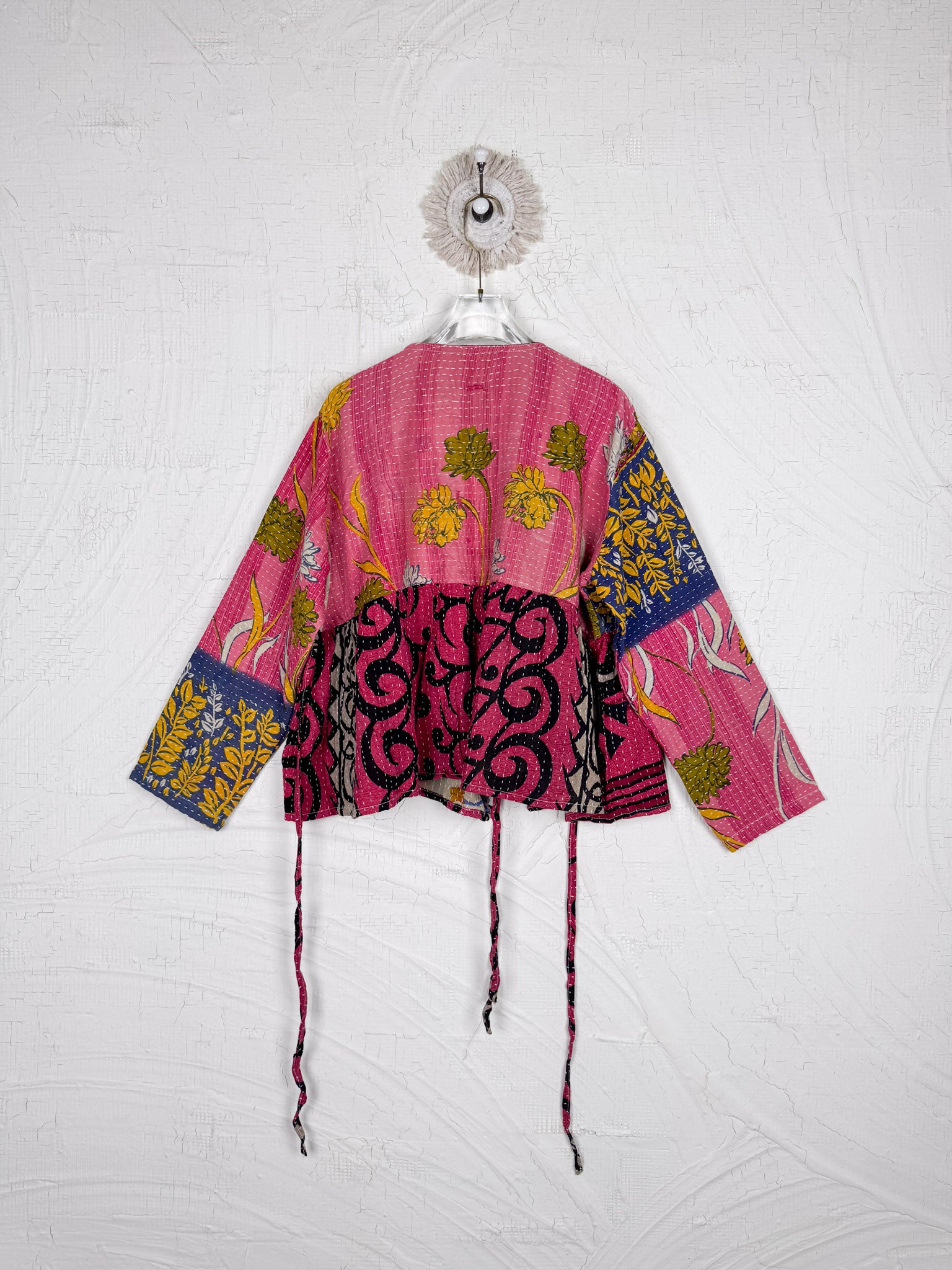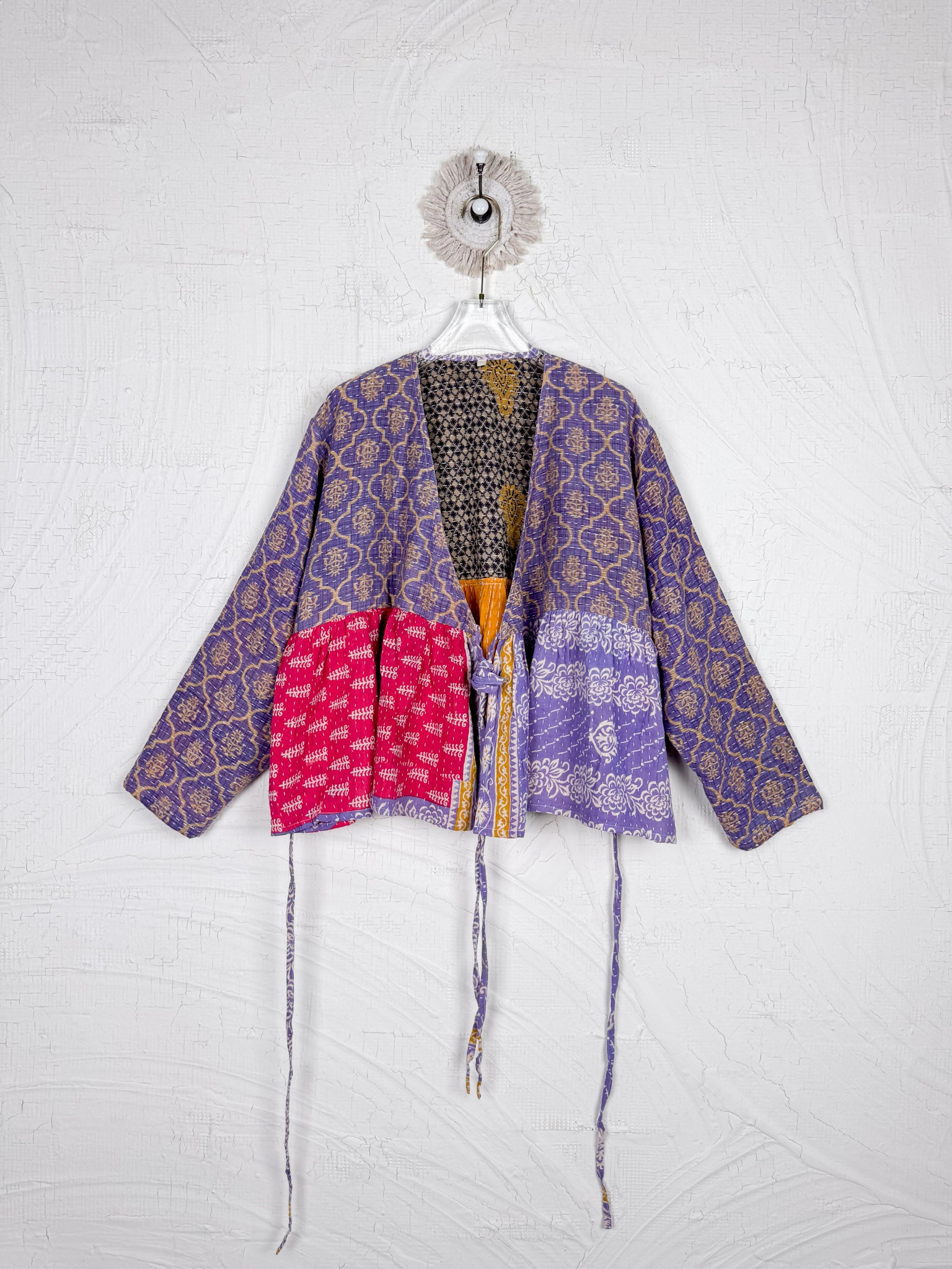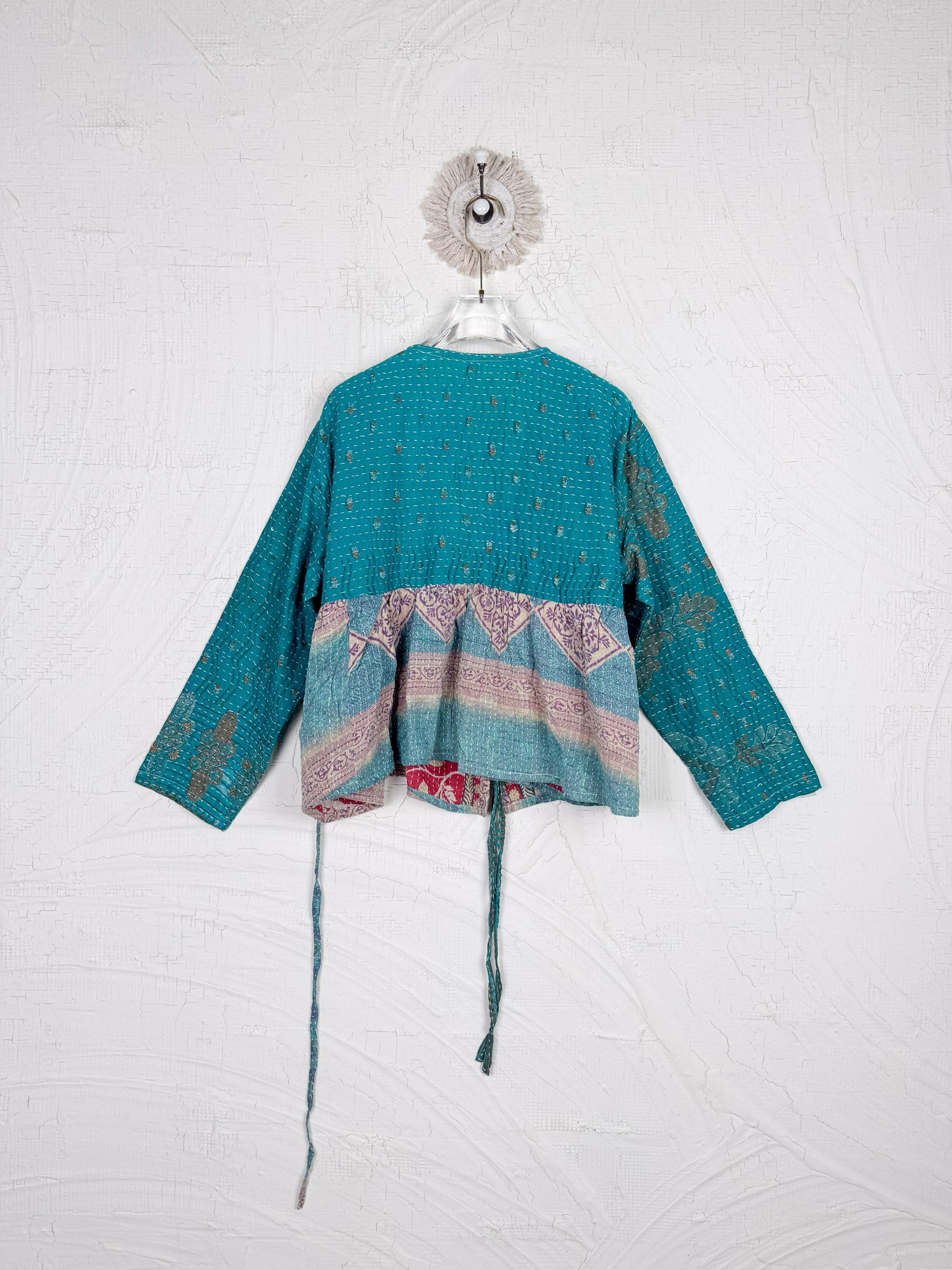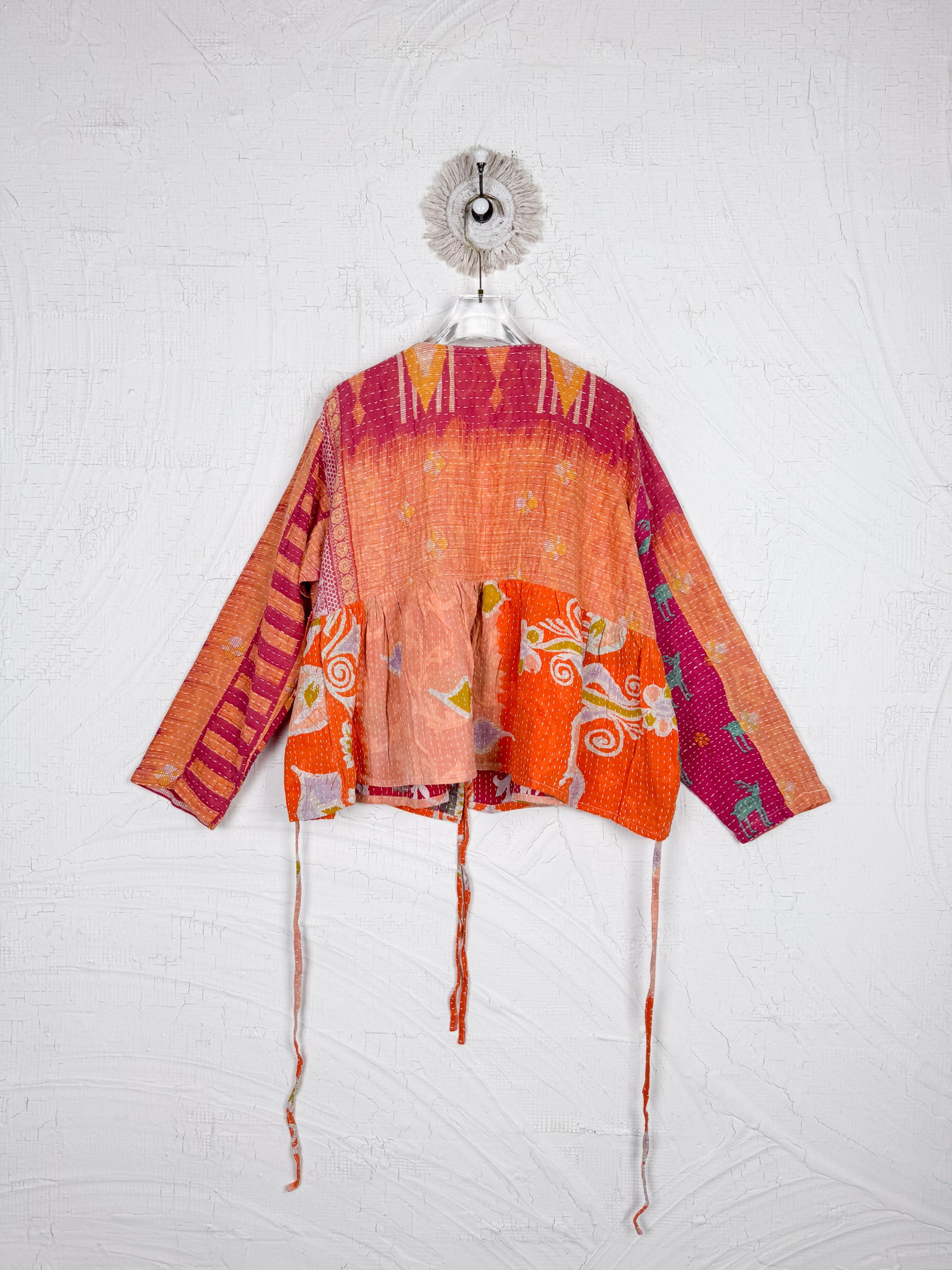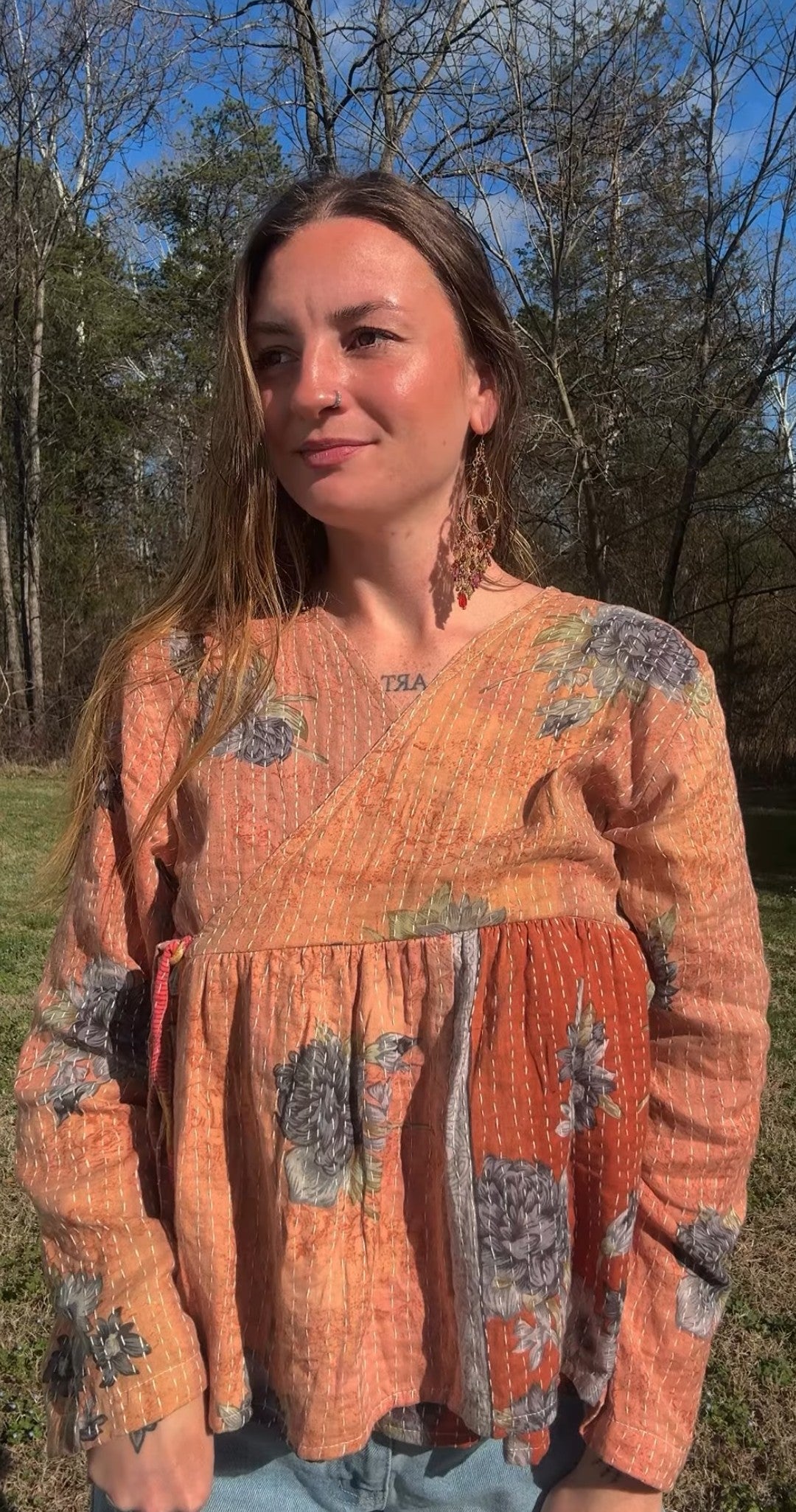 This ONE-OF-A-KIND Kantha Angiya Top, crafted from vintage Kantha, is a vibrant, hand-stitched piece of wearable art. Its V- neck, Balloon sleeve with frill design flatters all figures, offering a versatile and comfortable addition that tells a story.