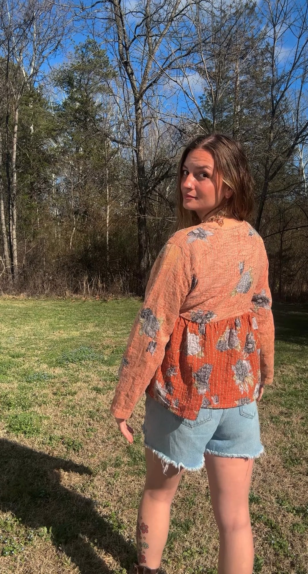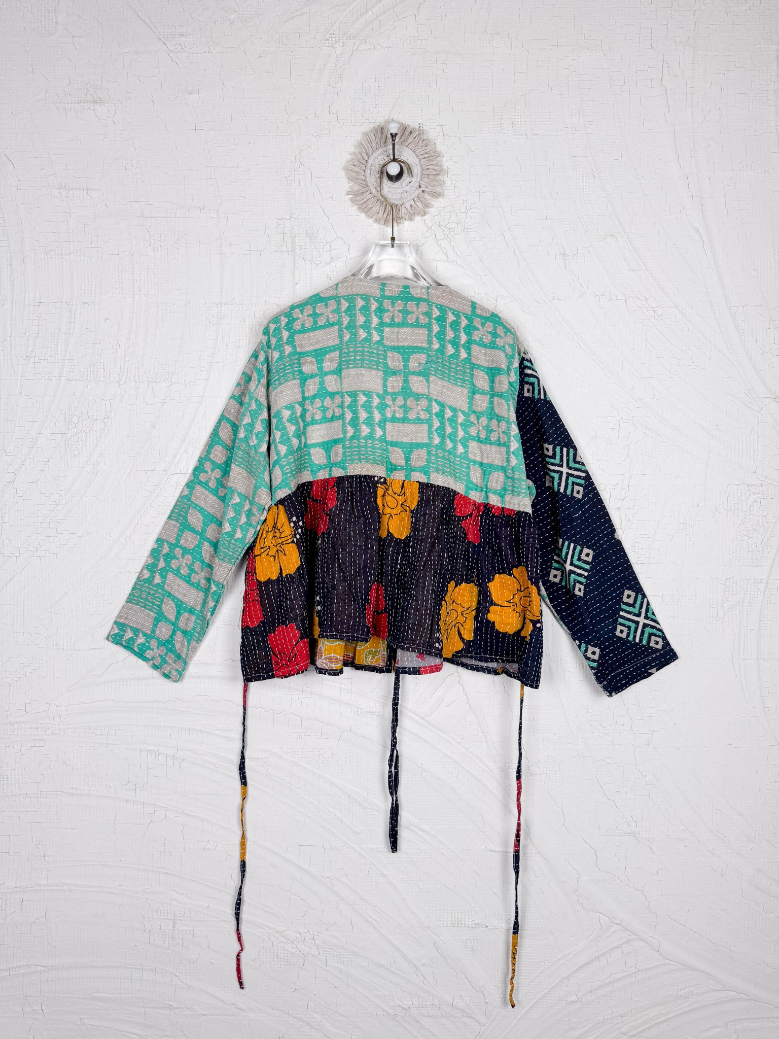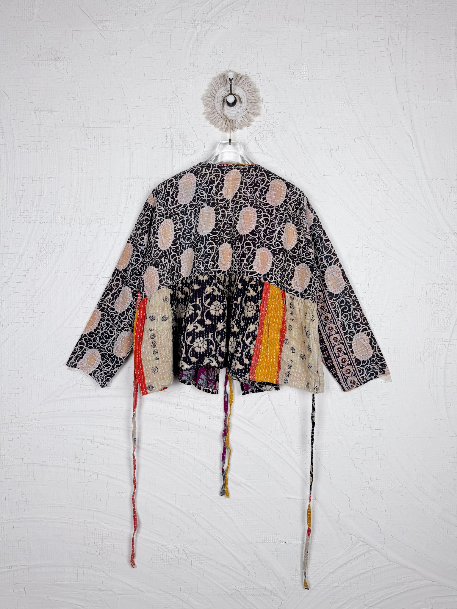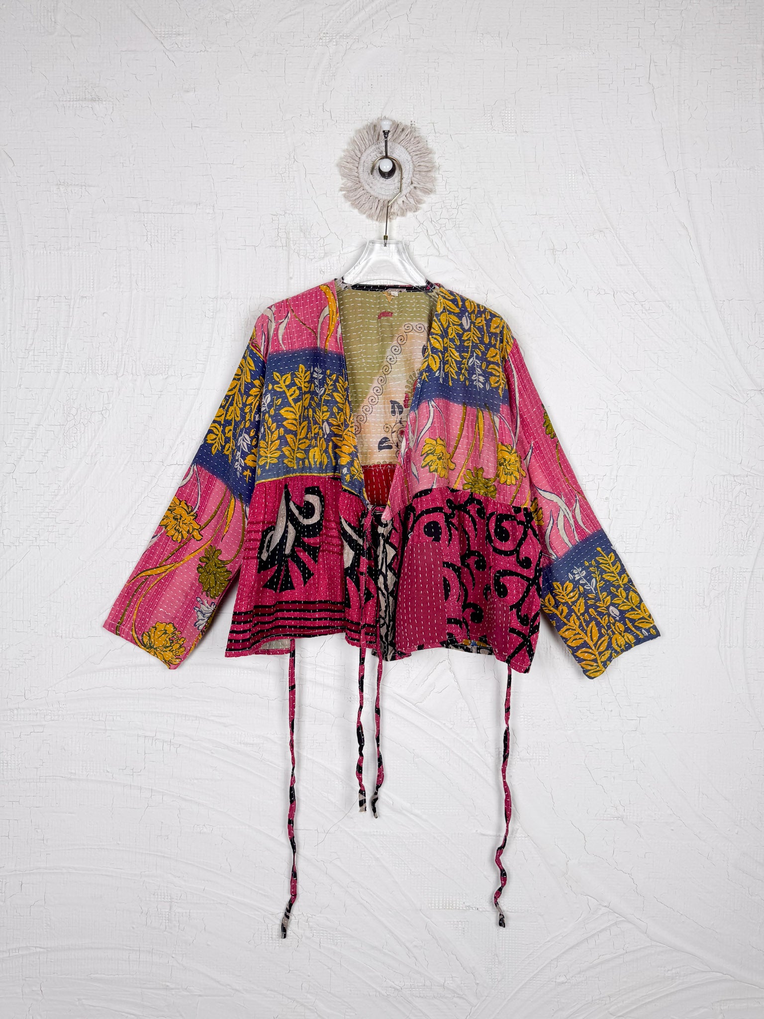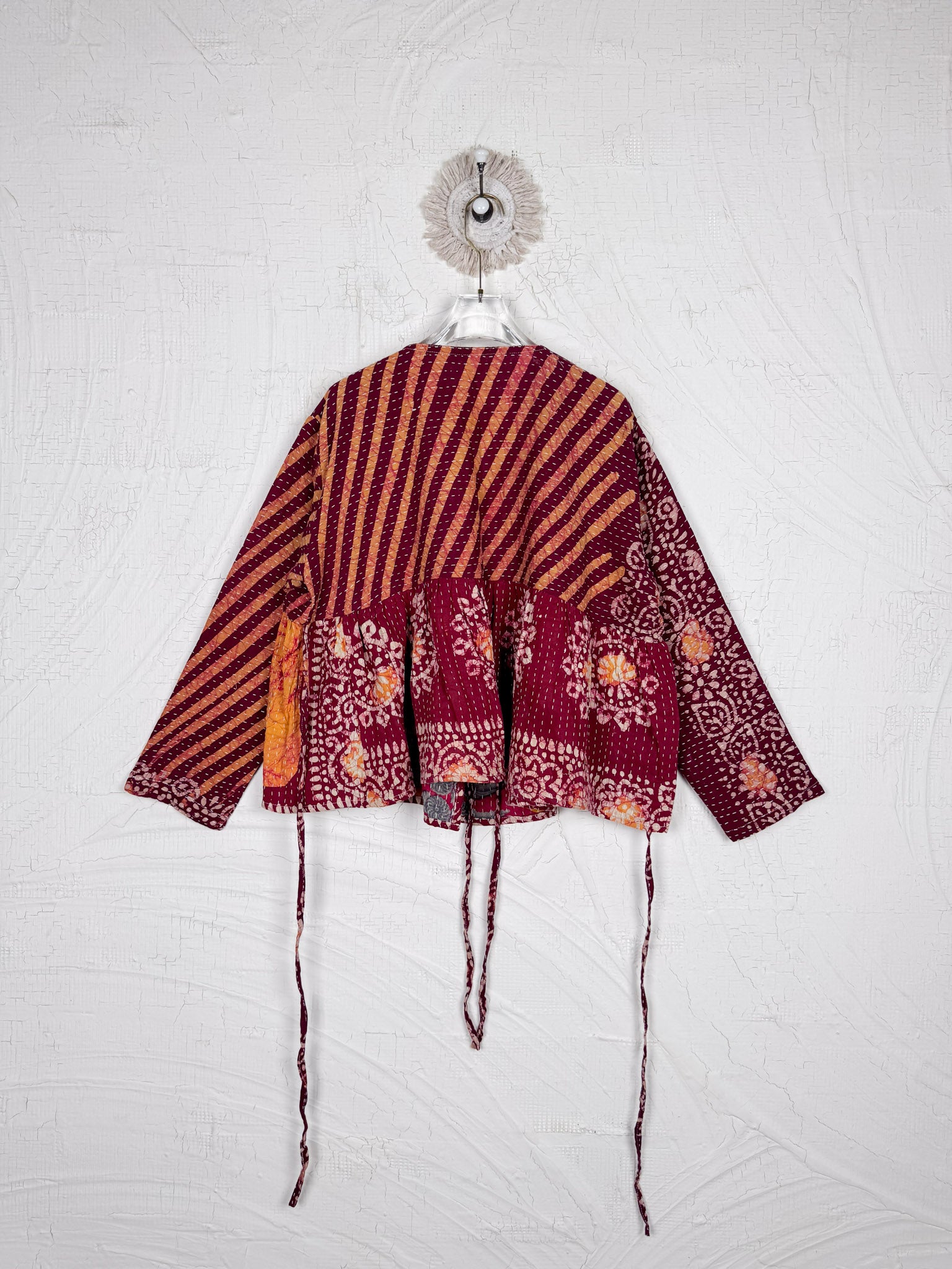 This ONE-OF-A-KIND Kantha Angiya Top, crafted from vintage Kantha, is a vibrant, hand-stitched piece of wearable art. Its V- neck, Balloon sleeve with frill design flatters all figures, offering a versatile and comfortable addition that tells a story.