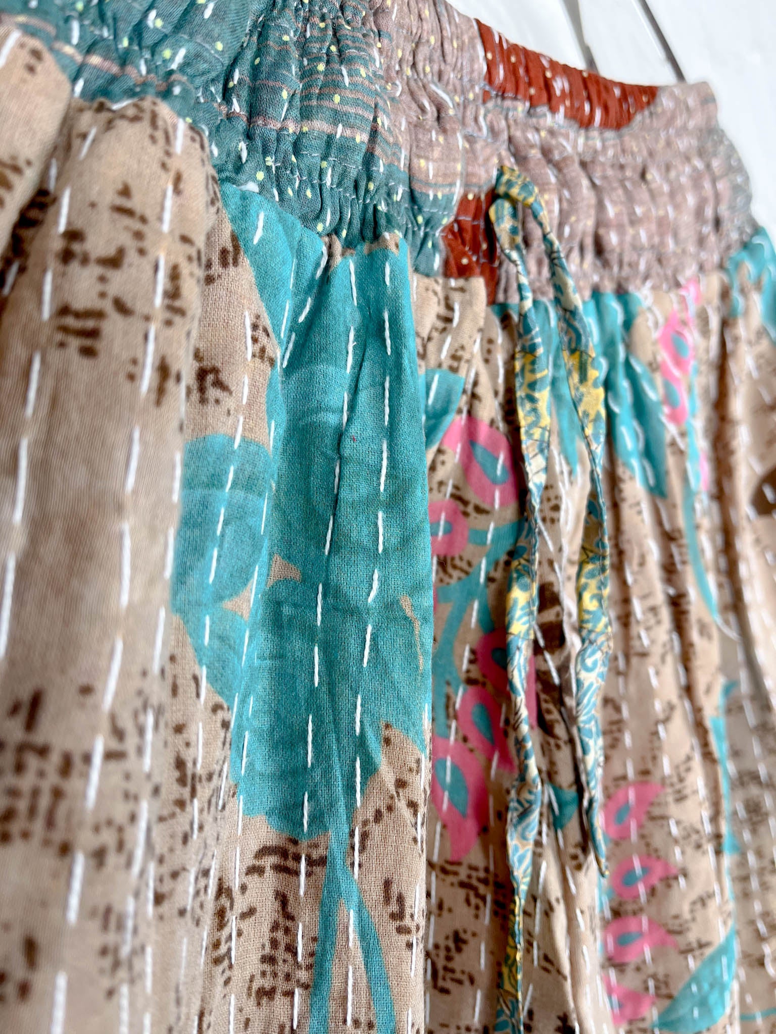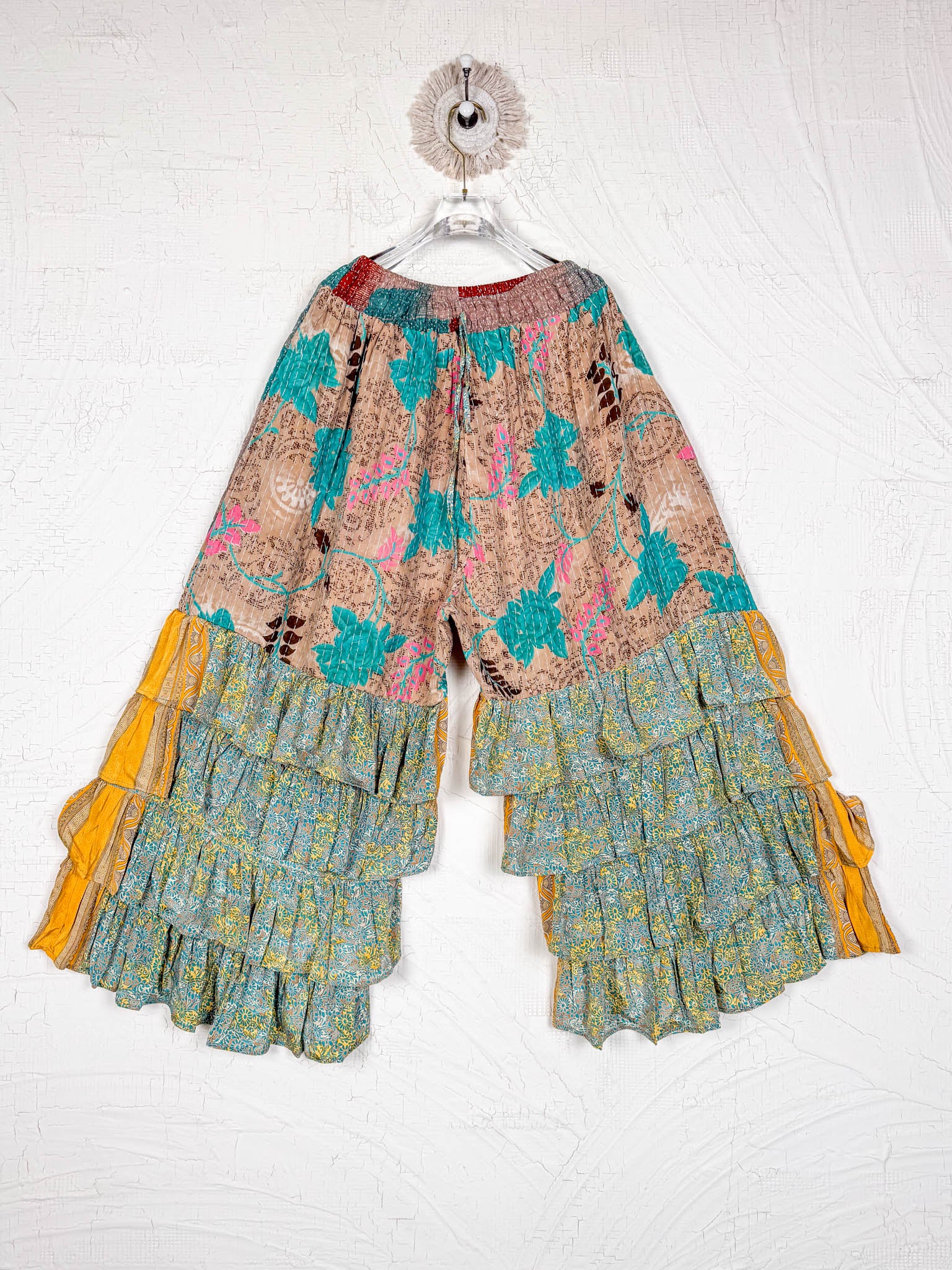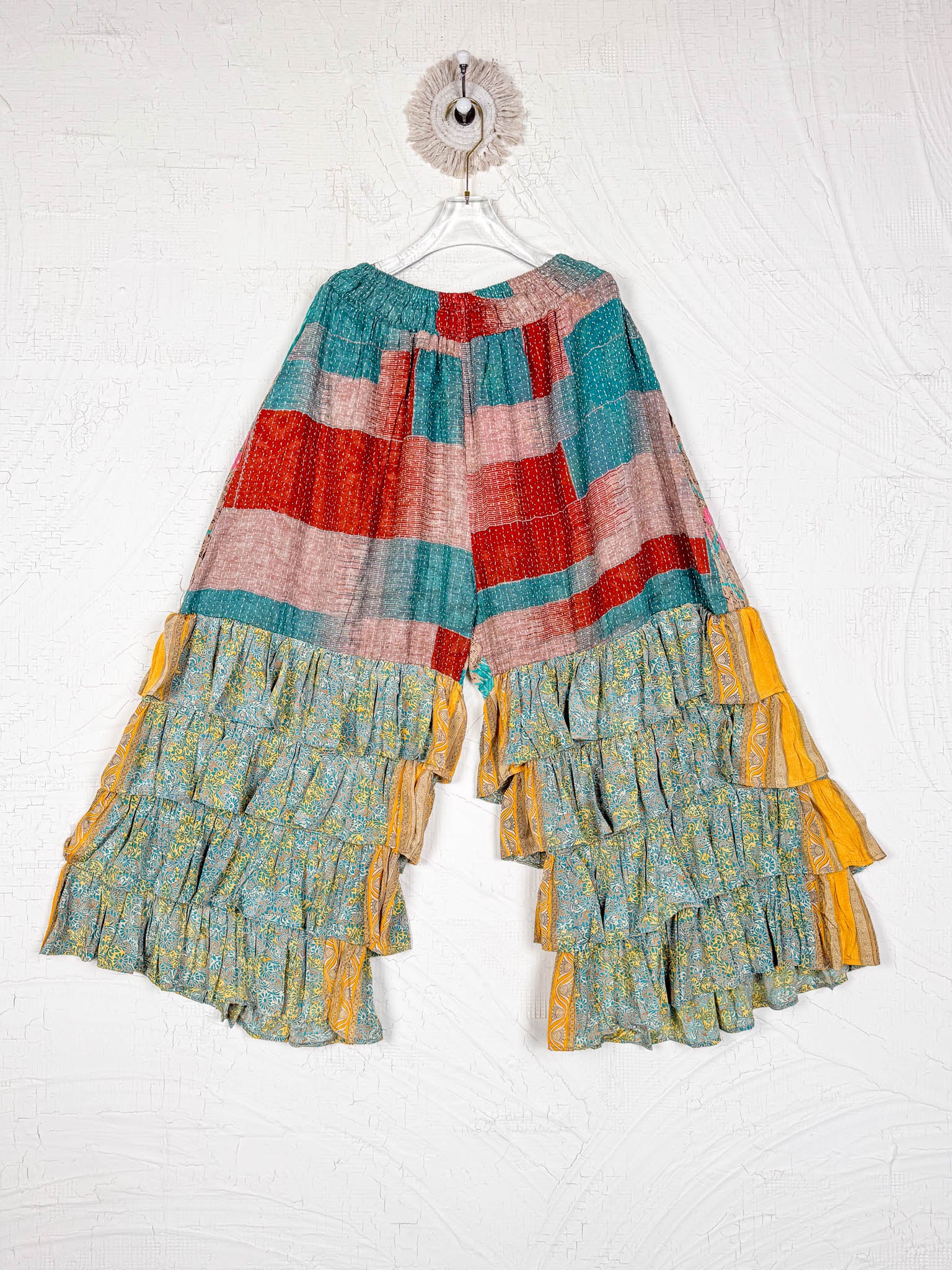Imagine slipping into the embrace of vintage Kantha and Vintage Silk, reborn into these exquisite Frill Pants. These pants move and dance along with you! Allowing your Playful feminine essence to shine. Each delicate stitch of Kantha is a testament to time-honoured artistry and vibrant floral prints, breathing life and unique texture into the fabric. Feel the answer as you walk! These aren't just pants but a blend of traditional handwork and contemporary styling, where the gentle sway of silk meets the intricate beauty of Kantha, enhancing your every movement with grace and charm.