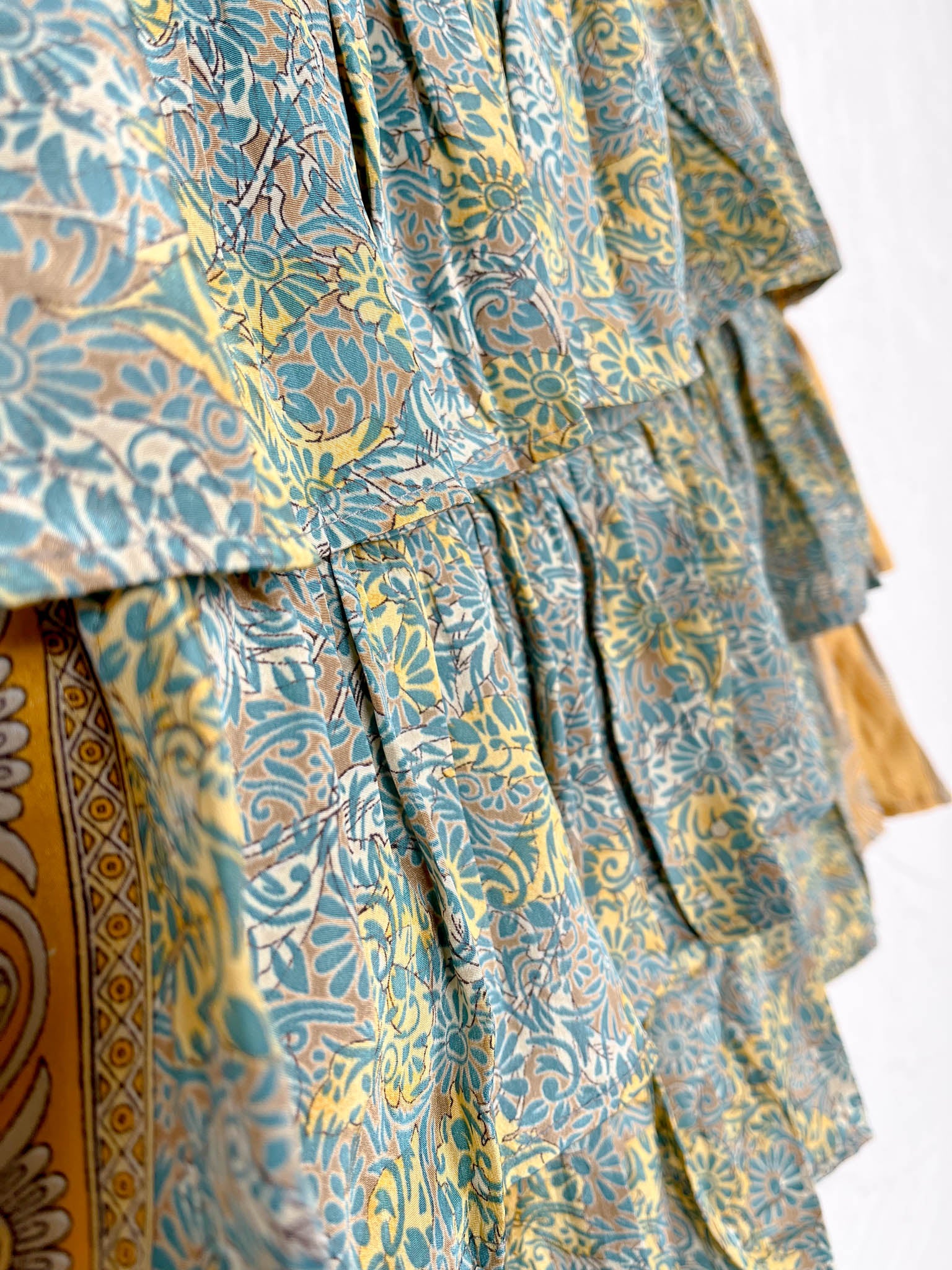 this is vintage silk. we take Indian sarees, which are often worn by people in different regions so the sarees consist of different prints and colours representing traditional values and vintage prints. we take the silk from Indian pre-loved sarees to make dresses