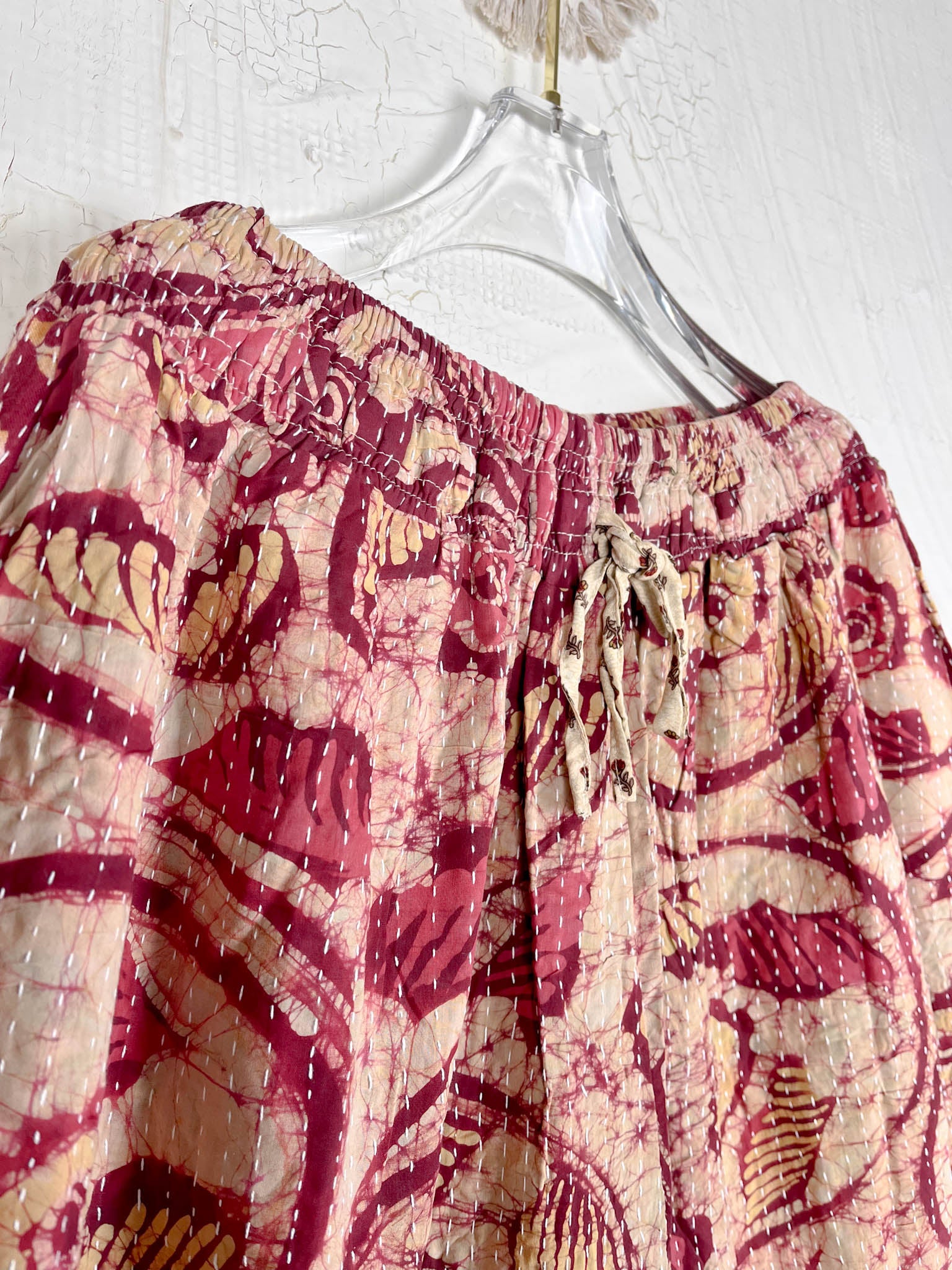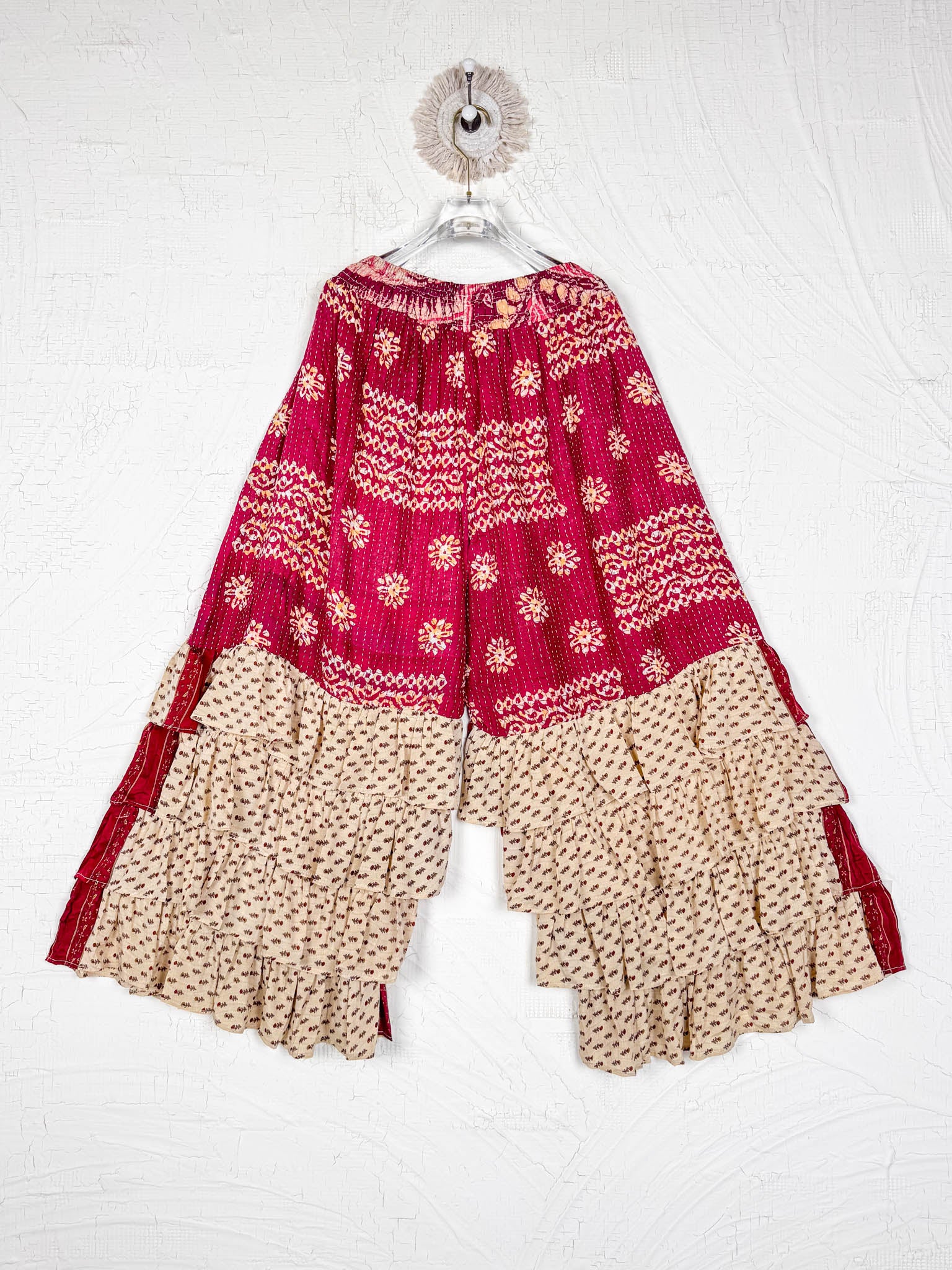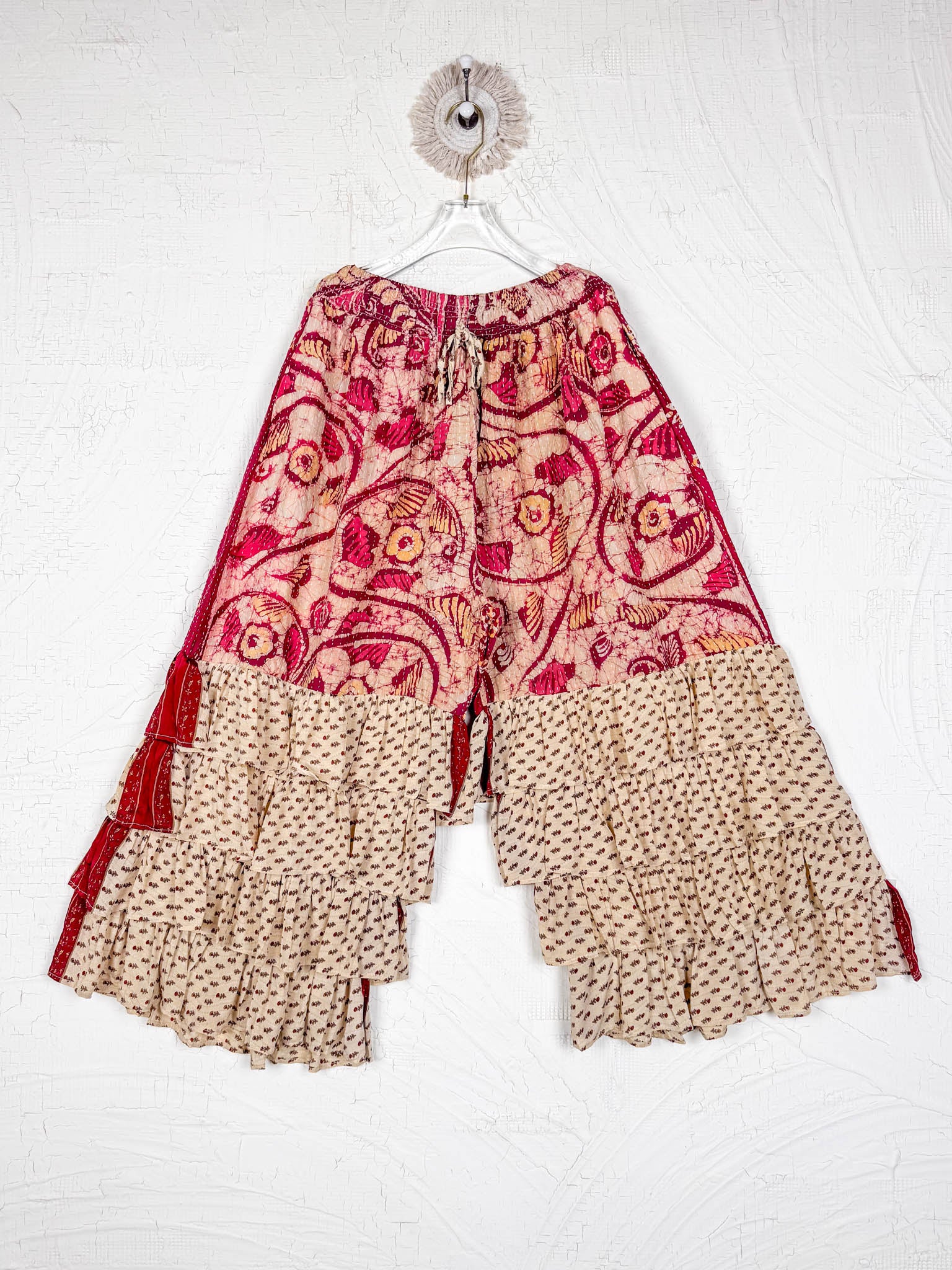 Imagine slipping into the embrace of vintage Kantha and Vintage Silk, reborn into these exquisite Frill Pants. These pants move and dance along with you! Allowing your Playful feminine essence to shine. Each delicate stitch of Kantha is a testament to time-honoured artistry and vibrant floral prints, breathing life and unique texture into the fabric. Feel the answer as you walk! These aren't just pants but a blend of traditional handwork and contemporary styling, where the gentle sway of silk meets the intricate beauty of Kantha, enhancing your every movement with grace and charm.