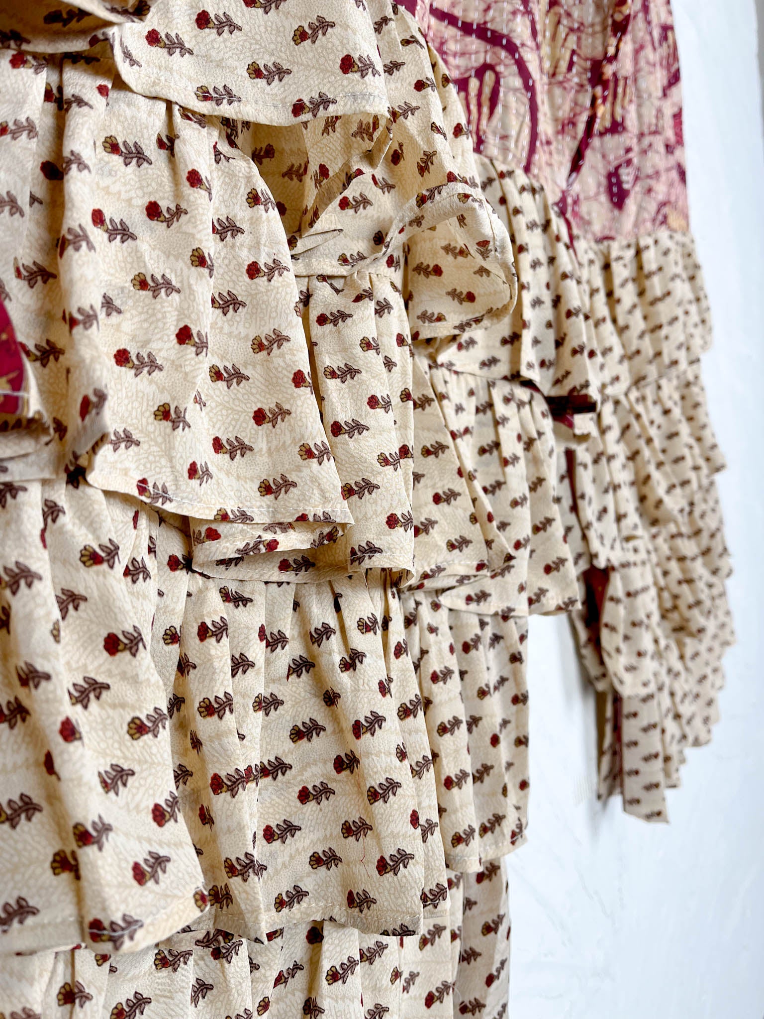 this is vintage silk. we take Indian sarees, which are often worn by people in different regions so the sarees consist of different prints and colours representing traditional values and vintage prints. we take the silk from Indian pre-loved sarees to make dresses