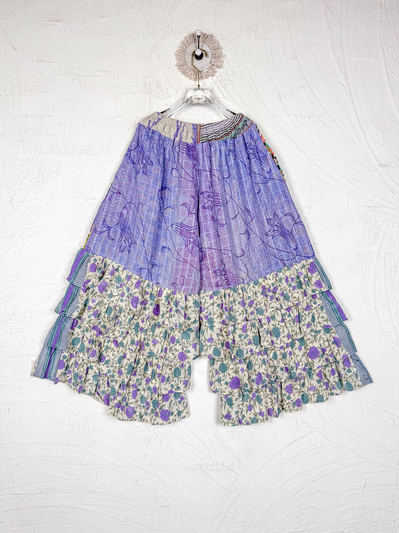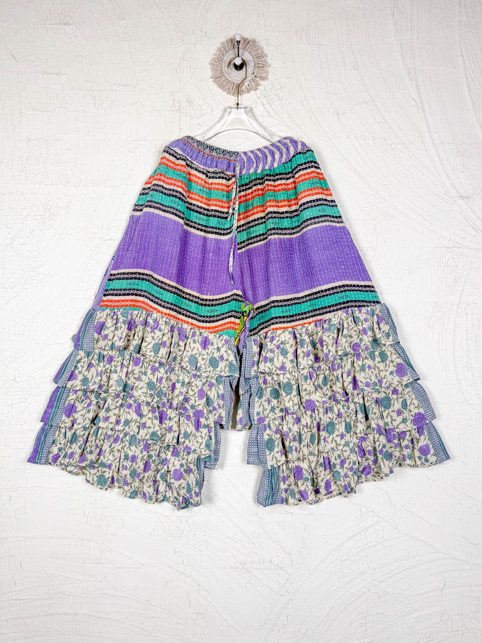 Imagine slipping into the embrace of vintage Kantha and Vintage Silk, reborn into these exquisite Frill Pants. These pants move and dance along with you! Allowing your Playful feminine essence to shine. Each delicate stitch of Kantha is a testament to time-honoured artistry and vibrant floral prints, breathing life and unique texture into the fabric. Feel the answer as you walk! These aren't just pants but a blend of traditional handwork and contemporary styling, where the gentle sway of silk meets the intricate beauty of Kantha, enhancing your every movement with grace and charm.