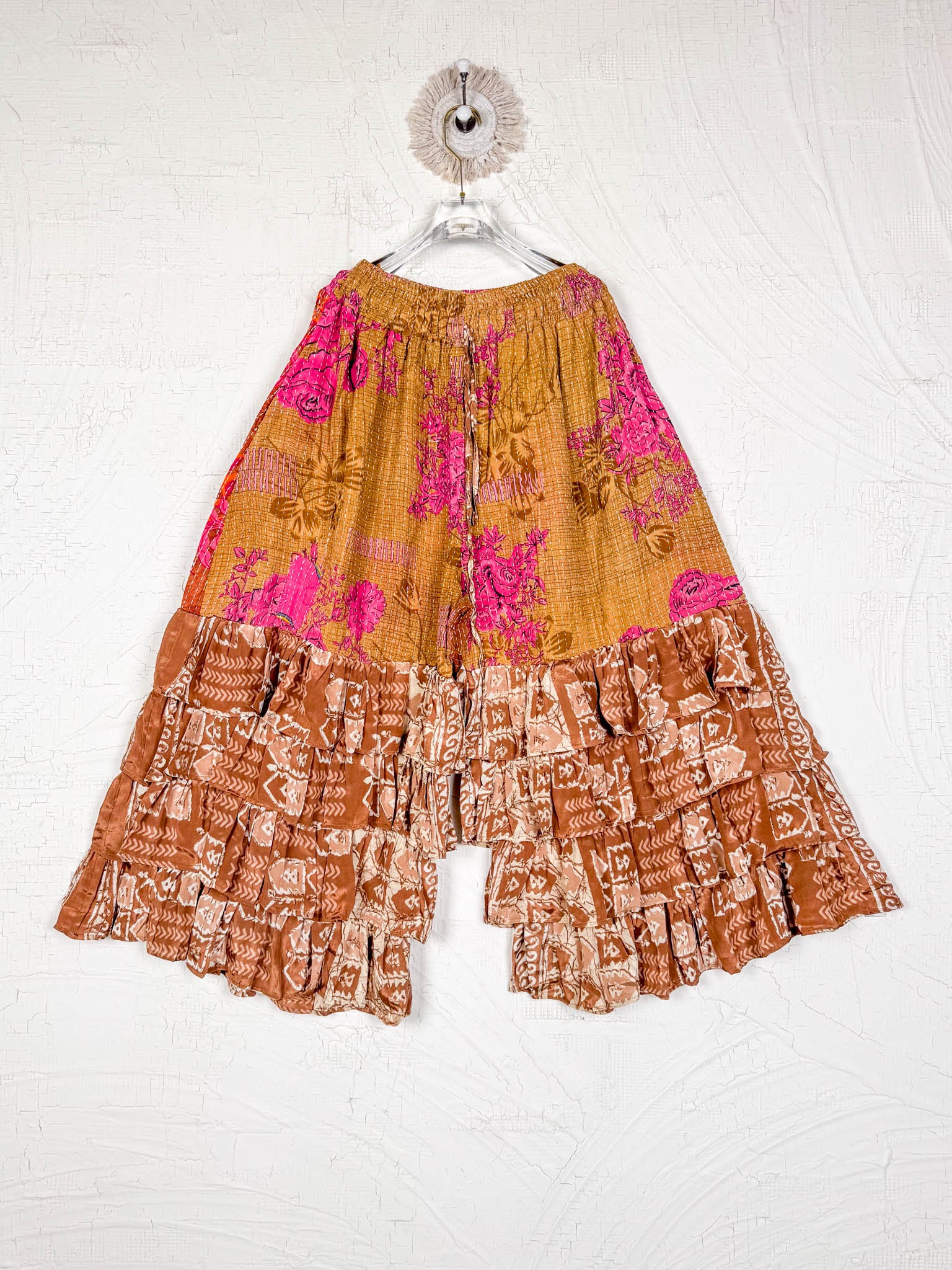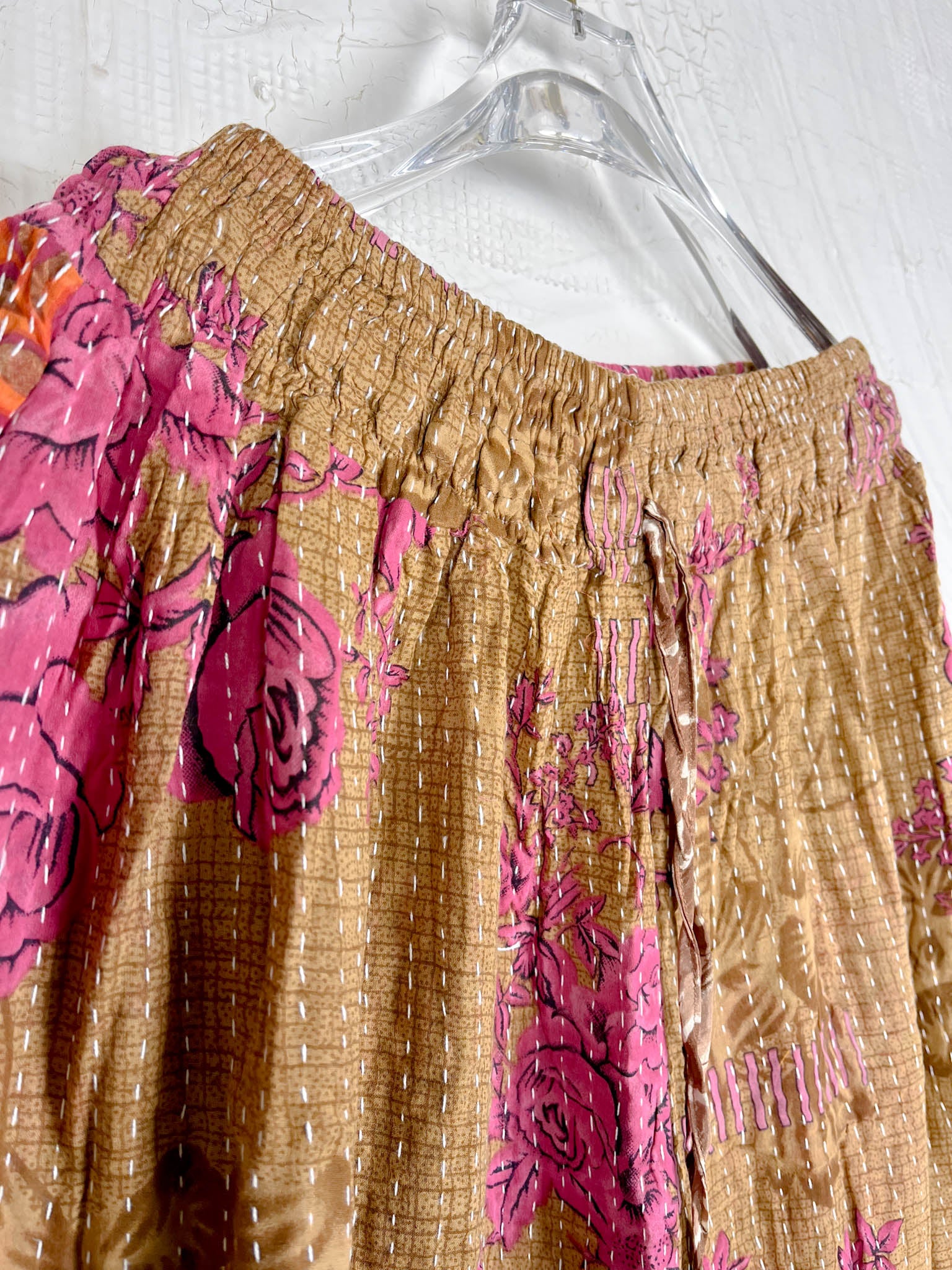 Imagine slipping into the embrace of vintage Kantha and Vintage Silk, reborn into these exquisite Frill Pants. These pants move and dance along with you! Allowing your Playful feminine essence to shine. Each delicate stitch of Kantha is a testament to time-honoured artistry and vibrant floral prints, breathing life and unique texture into the fabric. Feel the answer as you walk! These aren't just pants but a blend of traditional handwork and contemporary styling, where the gentle sway of silk meets the intricate beauty of Kantha, enhancing your every movement with grace and charm.