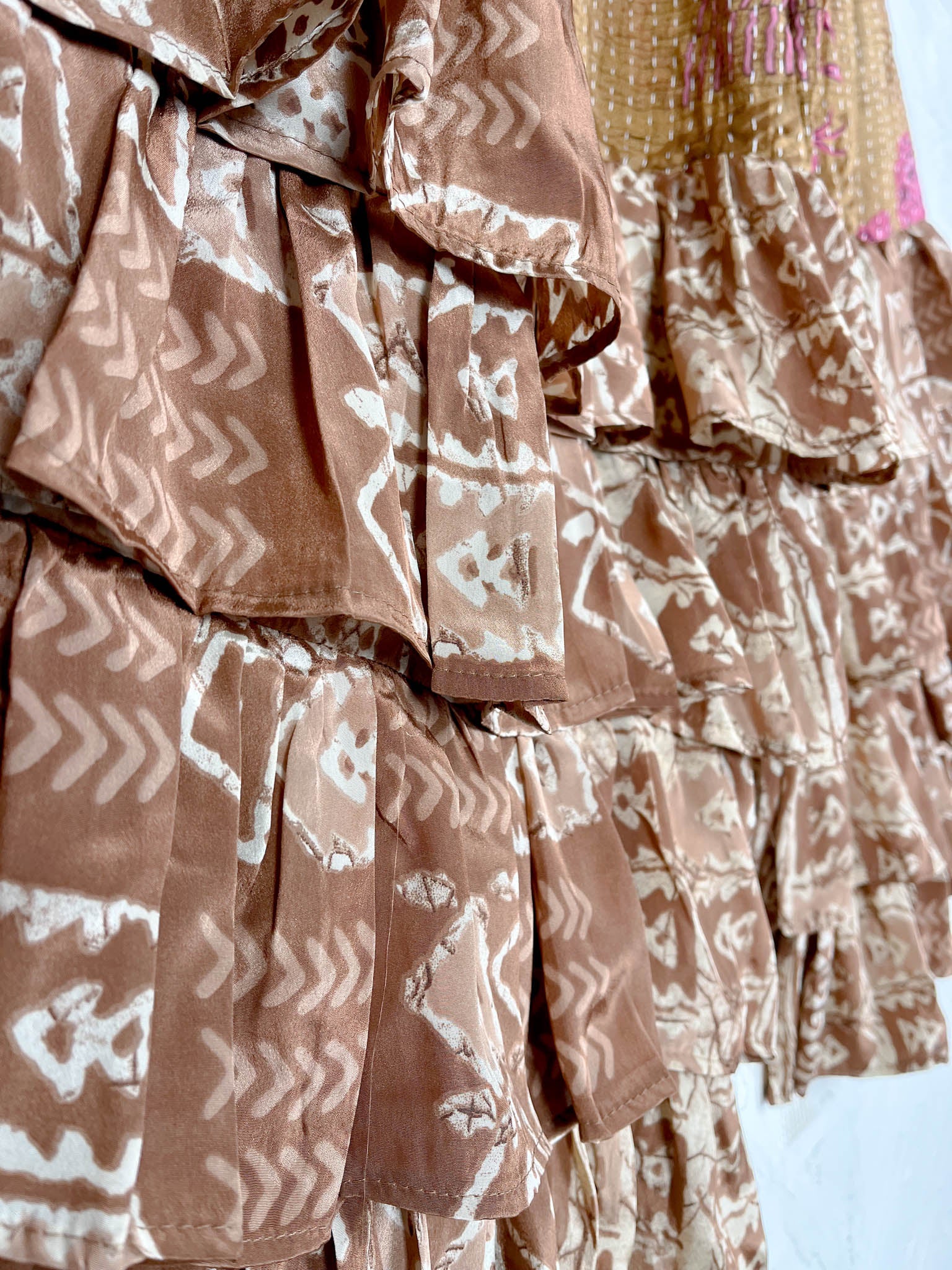 How does this beauty move? As you walk or twirl, the flowy silk cascades into playful frills at the hem, creating an enchanting wave with every step you take!