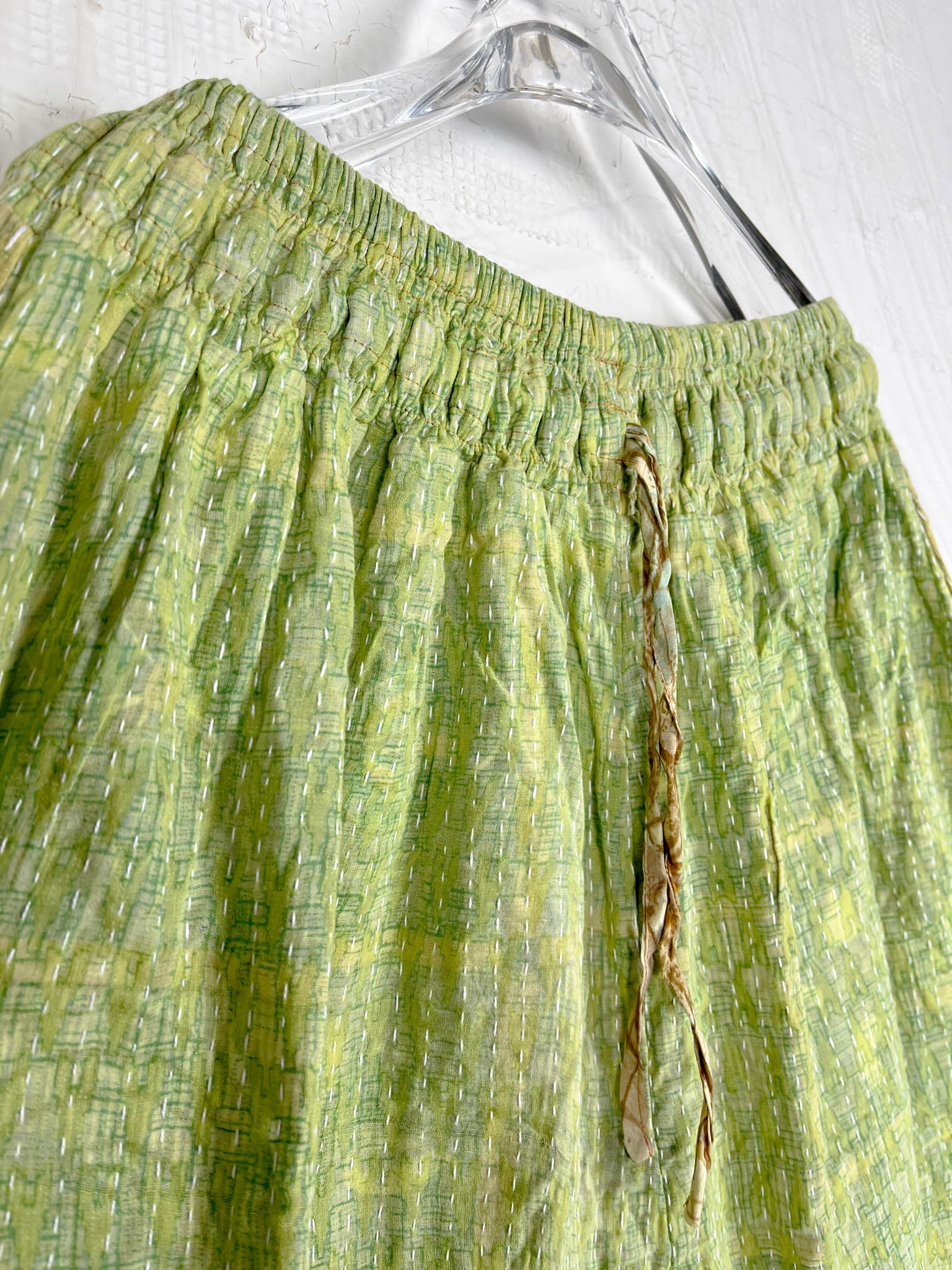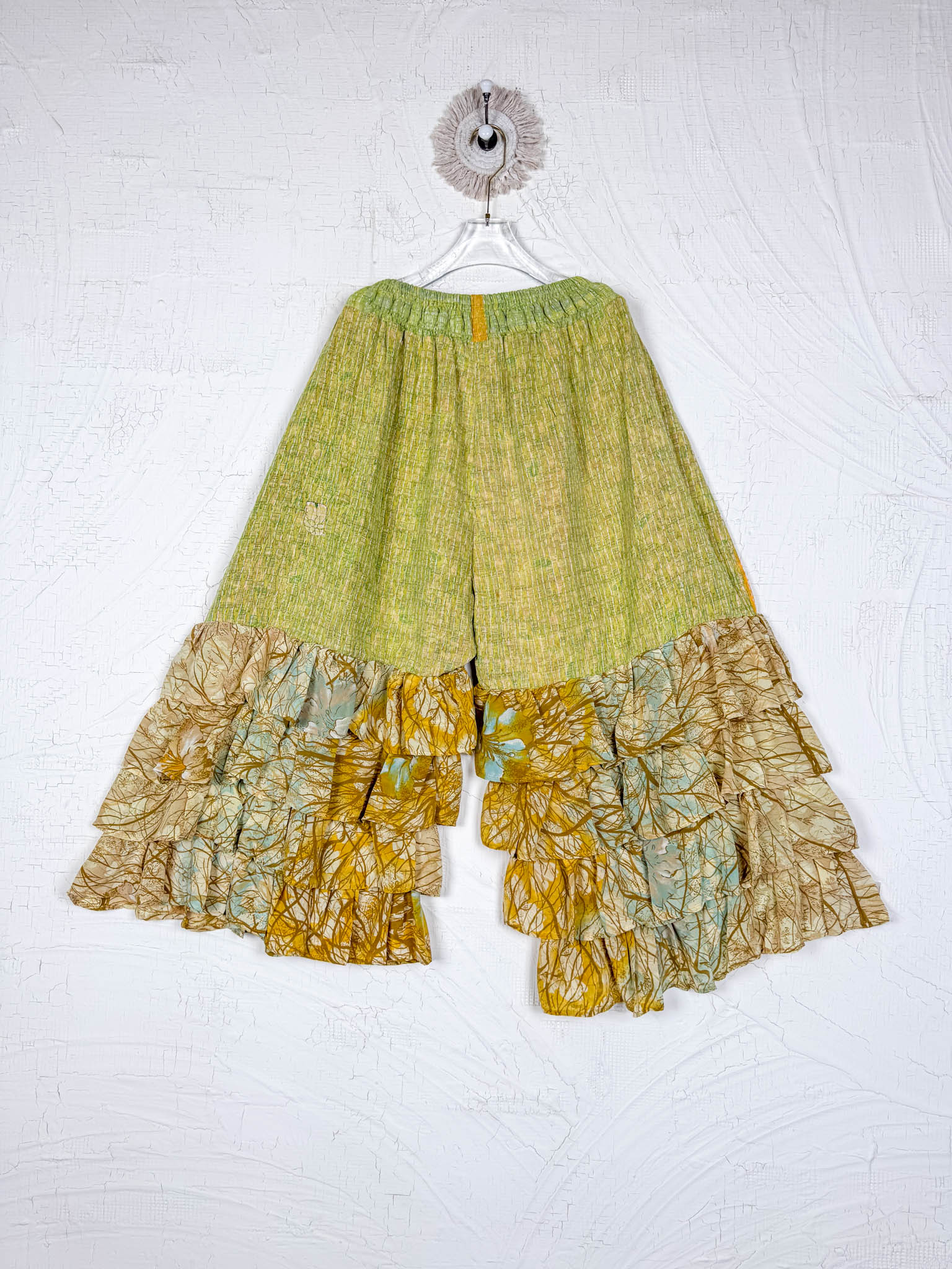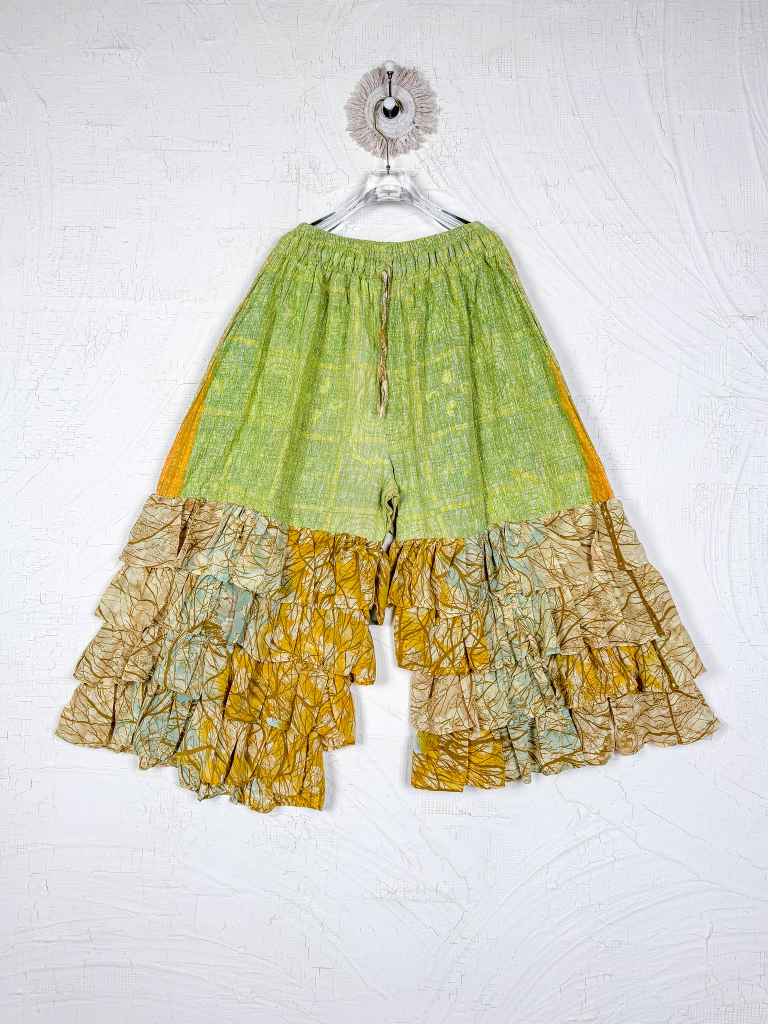 Imagine slipping into the embrace of vintage Kantha and Vintage Silk, reborn into these exquisite Frill Pants. These pants move and dance along with you! Allowing your Playful feminine essence to shine. Each delicate stitch of Kantha is a testament to time-honoured artistry and vibrant floral prints, breathing life and unique texture into the fabric. Feel the answer as you walk! These aren't just pants but a blend of traditional handwork and contemporary styling, where the gentle sway of silk meets the intricate beauty of Kantha, enhancing your every movement with grace and charm.