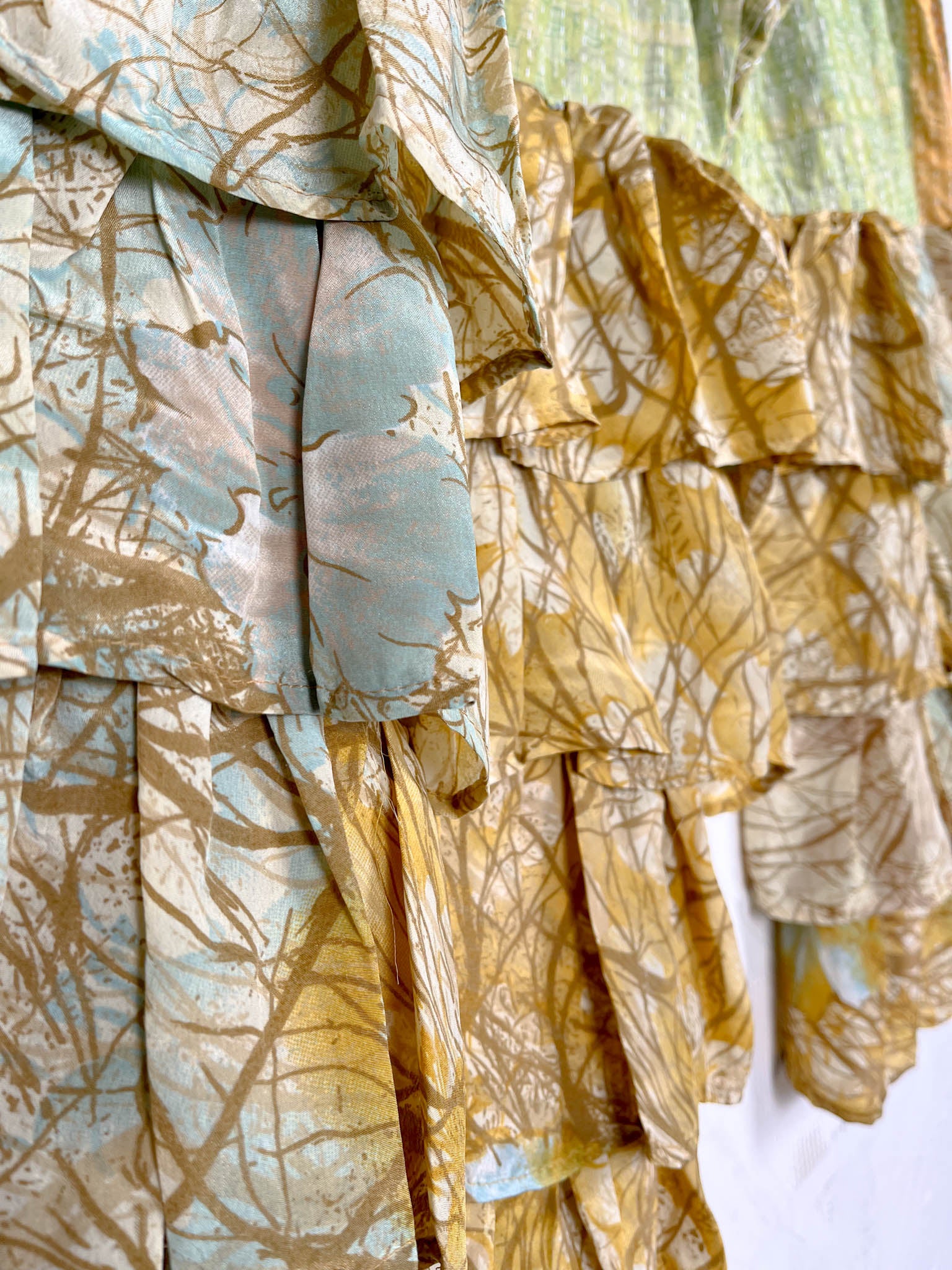 this is vintage silk. we take Indian sarees, which are often worn by people in different regions so the sarees consist of different prints and colours representing traditional values and vintage prints. we take the silk from Indian pre-loved sarees to make dresses