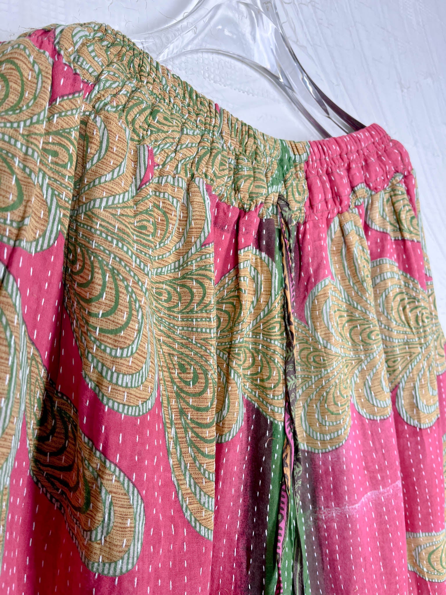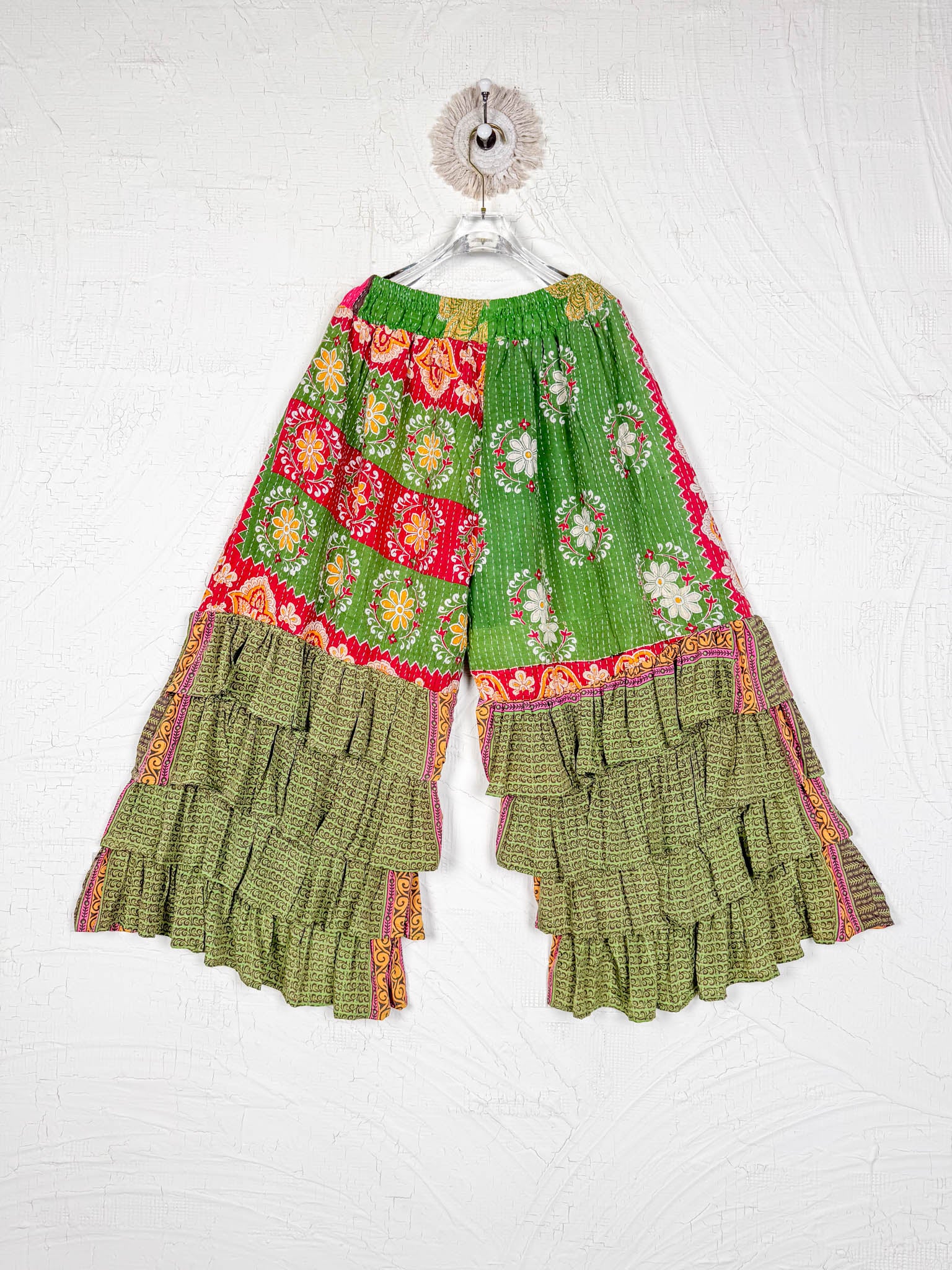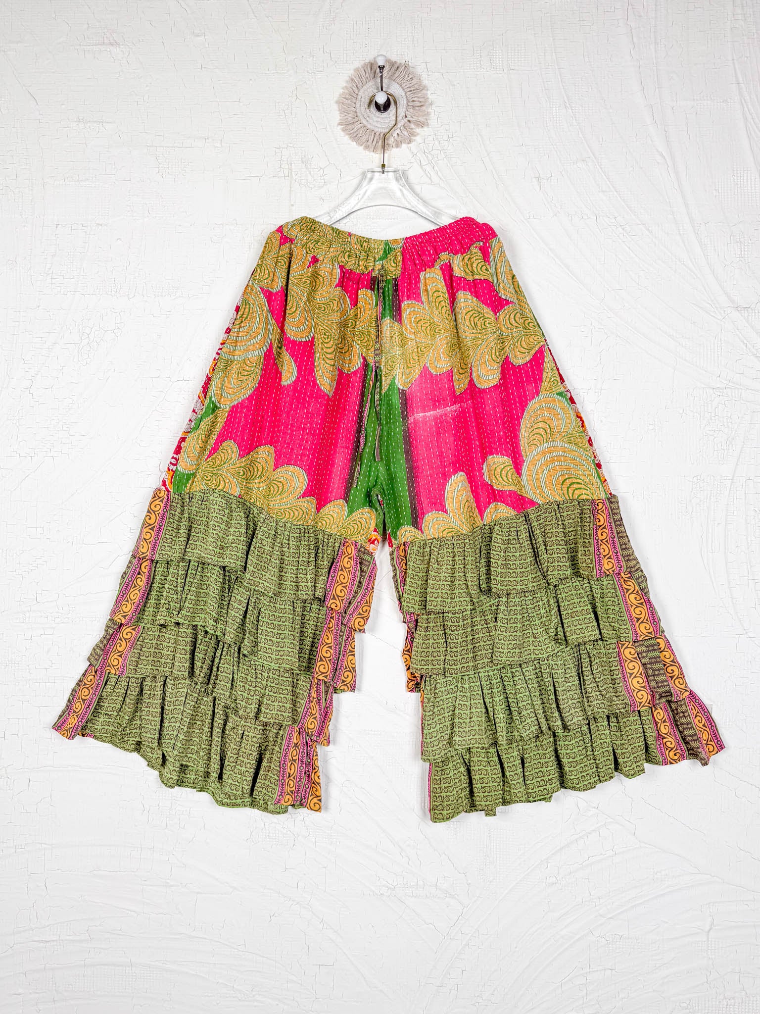 Imagine slipping into the embrace of vintage Kantha and Vintage Silk, reborn into these exquisite Frill Pants. These pants move and dance along with you! Allowing your Playful feminine essence to shine. Each delicate stitch of Kantha is a testament to time-honoured artistry and vibrant floral prints, breathing life and unique texture into the fabric. Feel the answer as you walk! These aren't just pants but a blend of traditional handwork and contemporary styling, where the gentle sway of silk meets the intricate beauty of Kantha, enhancing your every movement with grace and charm.
