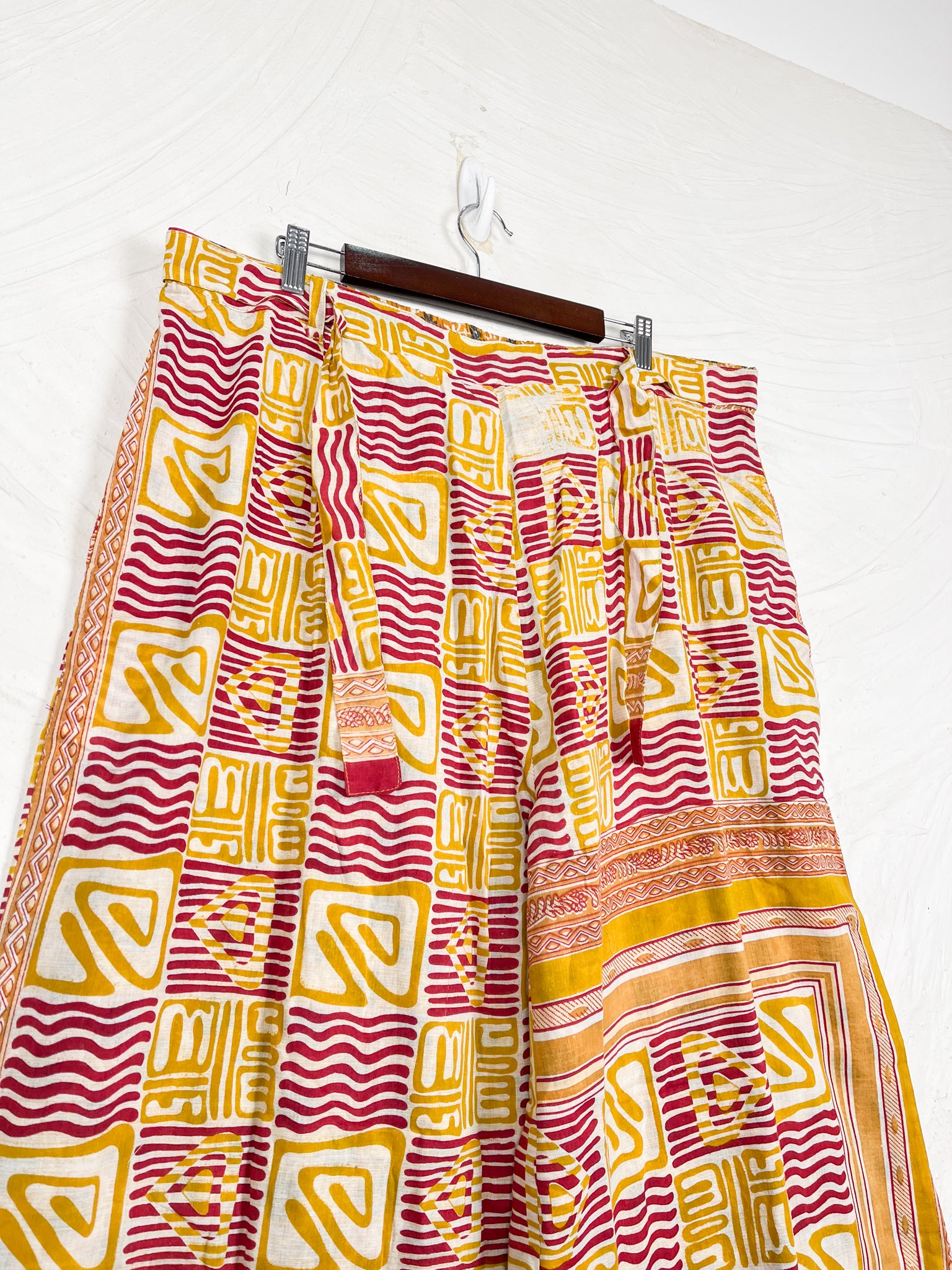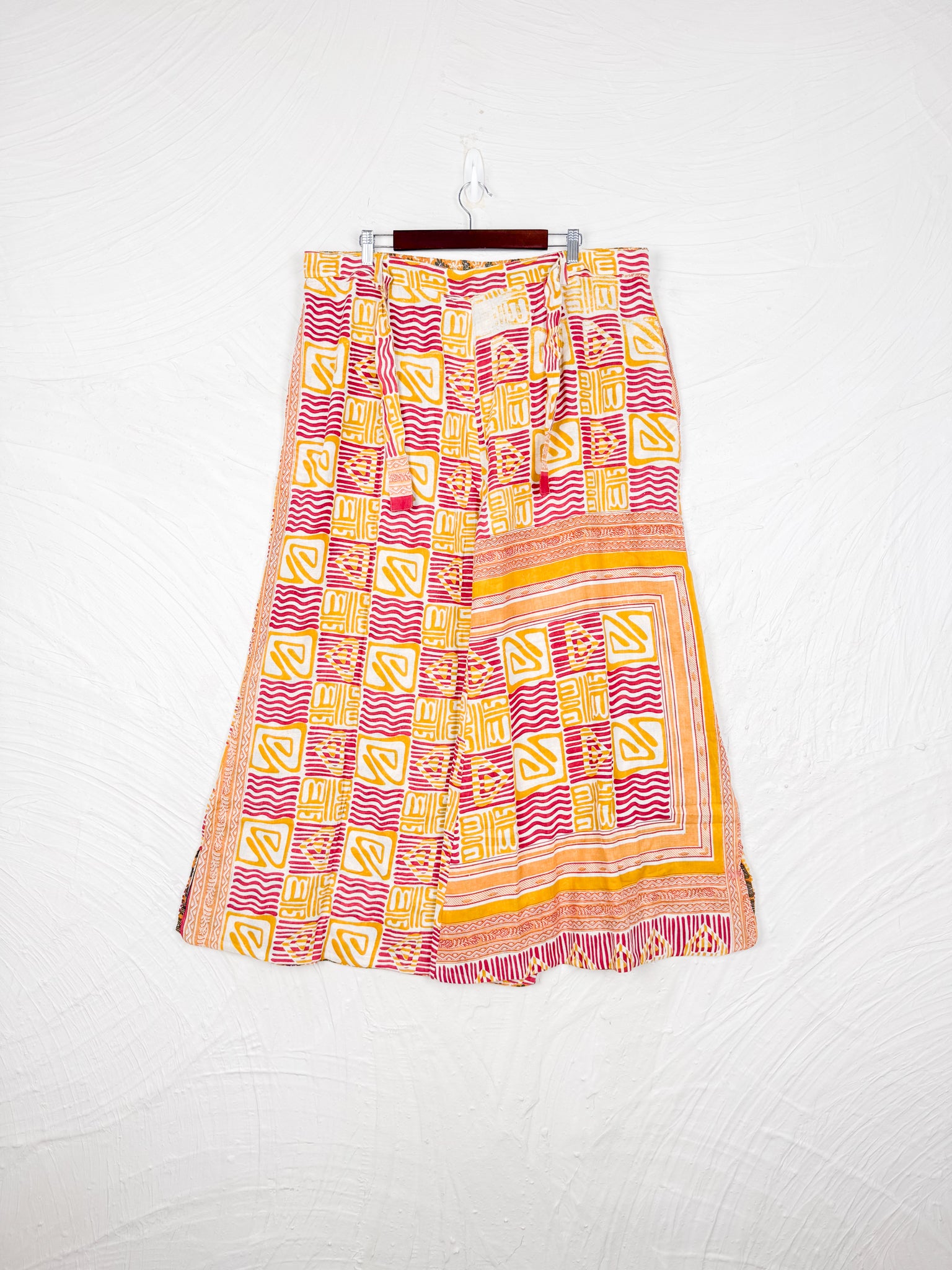 Made from vintage cotton sarees featuring traditional floral prints and vibrant hues, these pants are a celebration of timeless design. Their loose, flowing wide legs ensure ultimate comfort and freedom of movement, while the Adjustable front tie waistband with back-half elastic gives you control for desired fit.