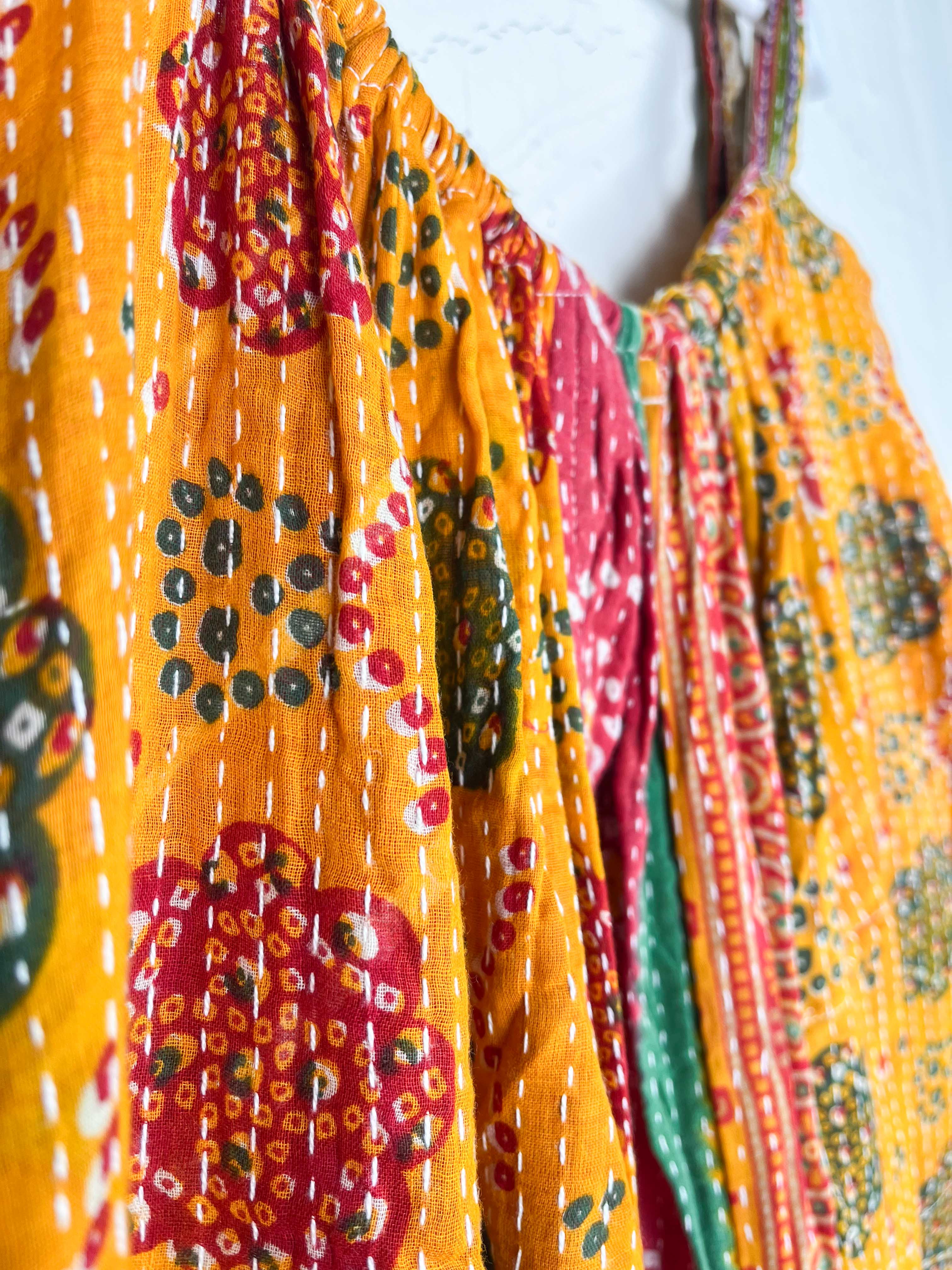 Dare to be unique and beautiful in this beautiful kantha jumpsuit, a blend of timeless artistry and free-spirited design. We combined the rich heritage of vintage Kantha work with the patchwork, creating a piece that's as unique as you are. Crafted from soft Kantha cotton, each patchwork detail carries a whisper of history, while the captivating matching patchwork bursts forth in stunning colors. The delicate square-neck with its tie closure offers a touch of personal style and breathable comfort. Long, wide legs enhance the relaxed, bohemian silhouette, perfect for expressing your inner wanderer. This jumpsuit flows effortlessly, designed to embrace your body with ease and confidence. The subtle texture of the Kantha stitches adds a handcrafted charm, a reminder to embrace your playful and authentic self.