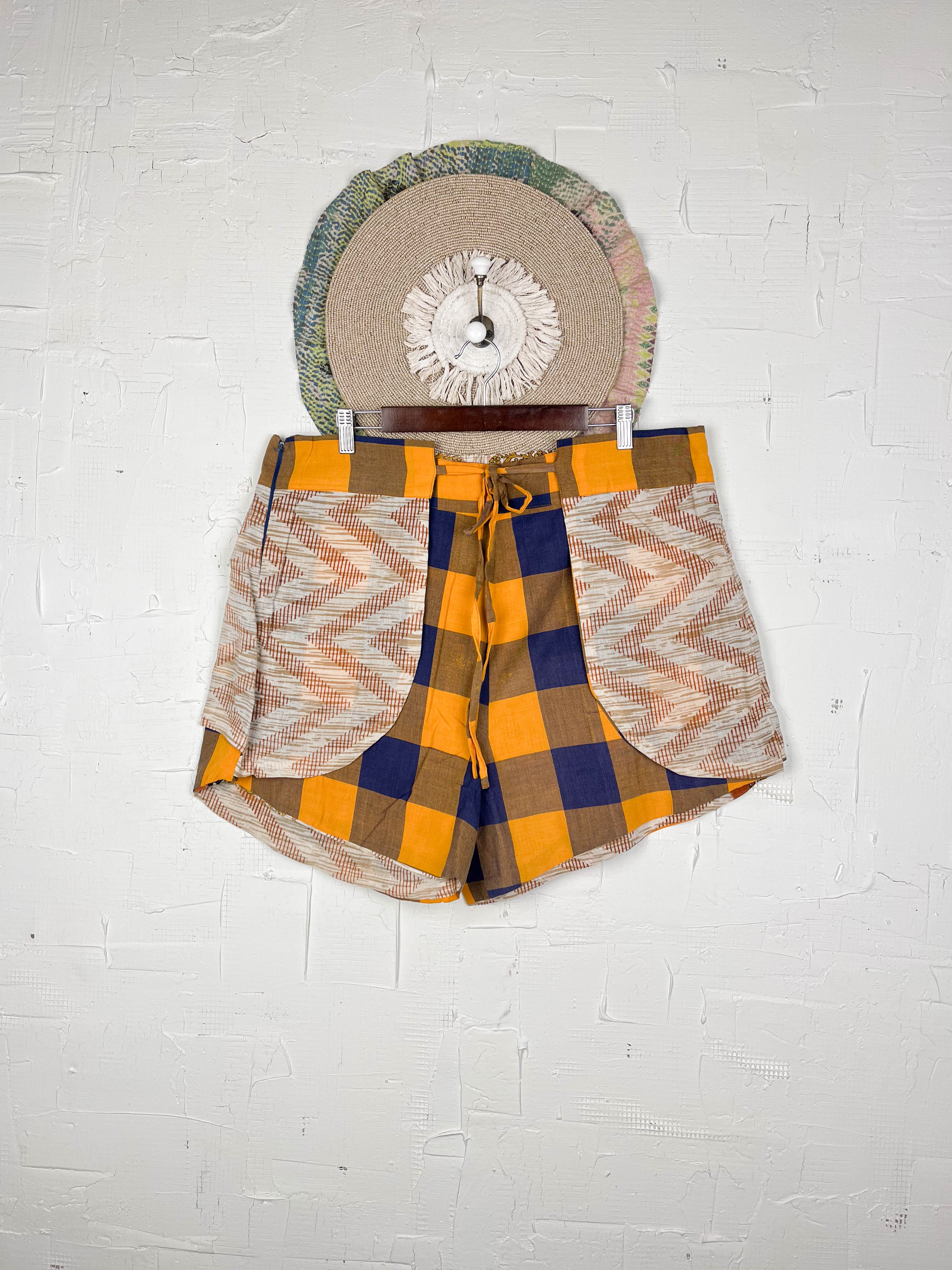 With the unique wrap style, they offer a perfect, adjustable fit that flatters every shape and size, secured with a stylish tie belt. The delightful combination of different prints and patchwork creates a fresh and playful look, ready for sunny adventures. Available in three sizes, these shorts are a celebration of individuality and joyful style