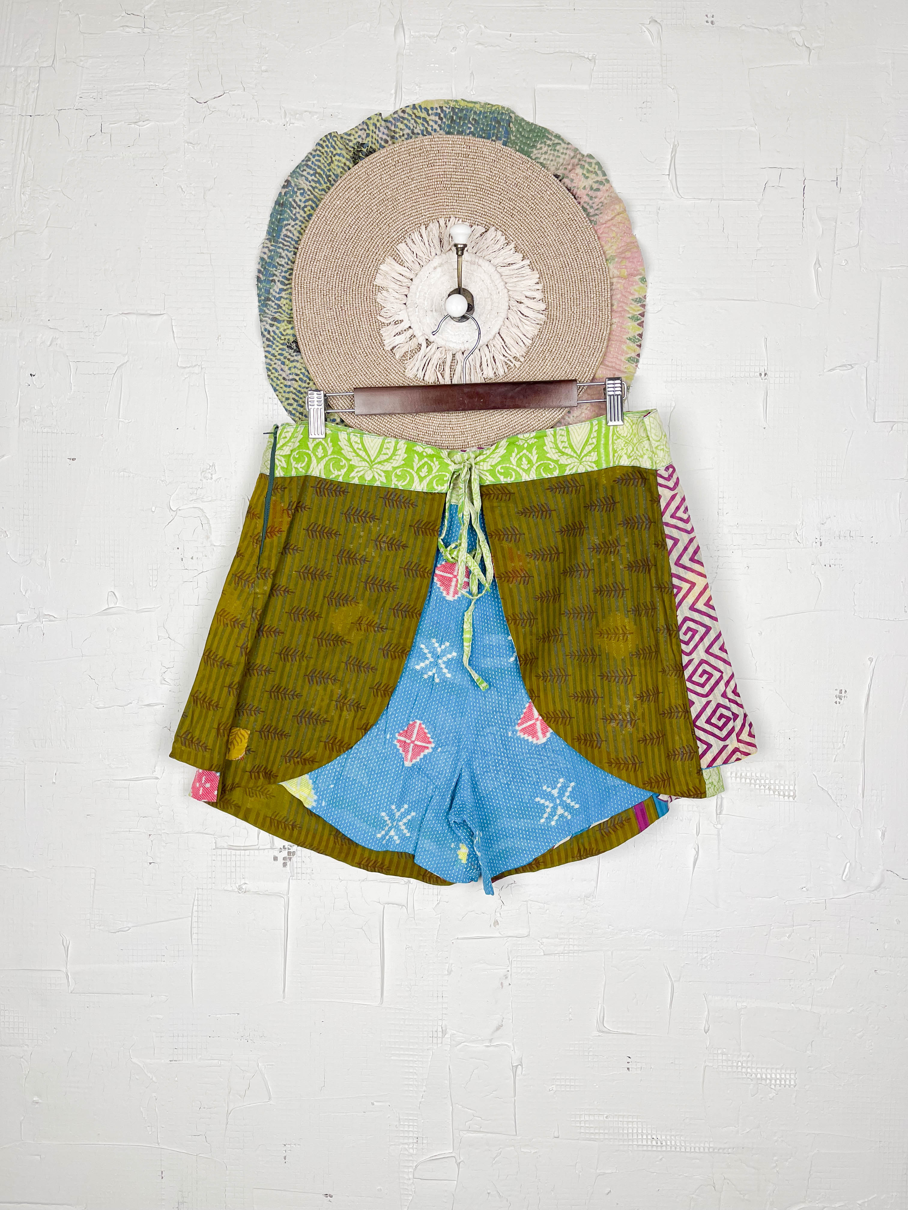 With the unique wrap style, they offer a perfect, adjustable fit that flatters every shape and size, secured with a stylish tie belt. The delightful combination of different prints and patchwork creates a fresh and playful look, ready for sunny adventures. Available in three sizes, these shorts are a celebration of individuality and joyful style