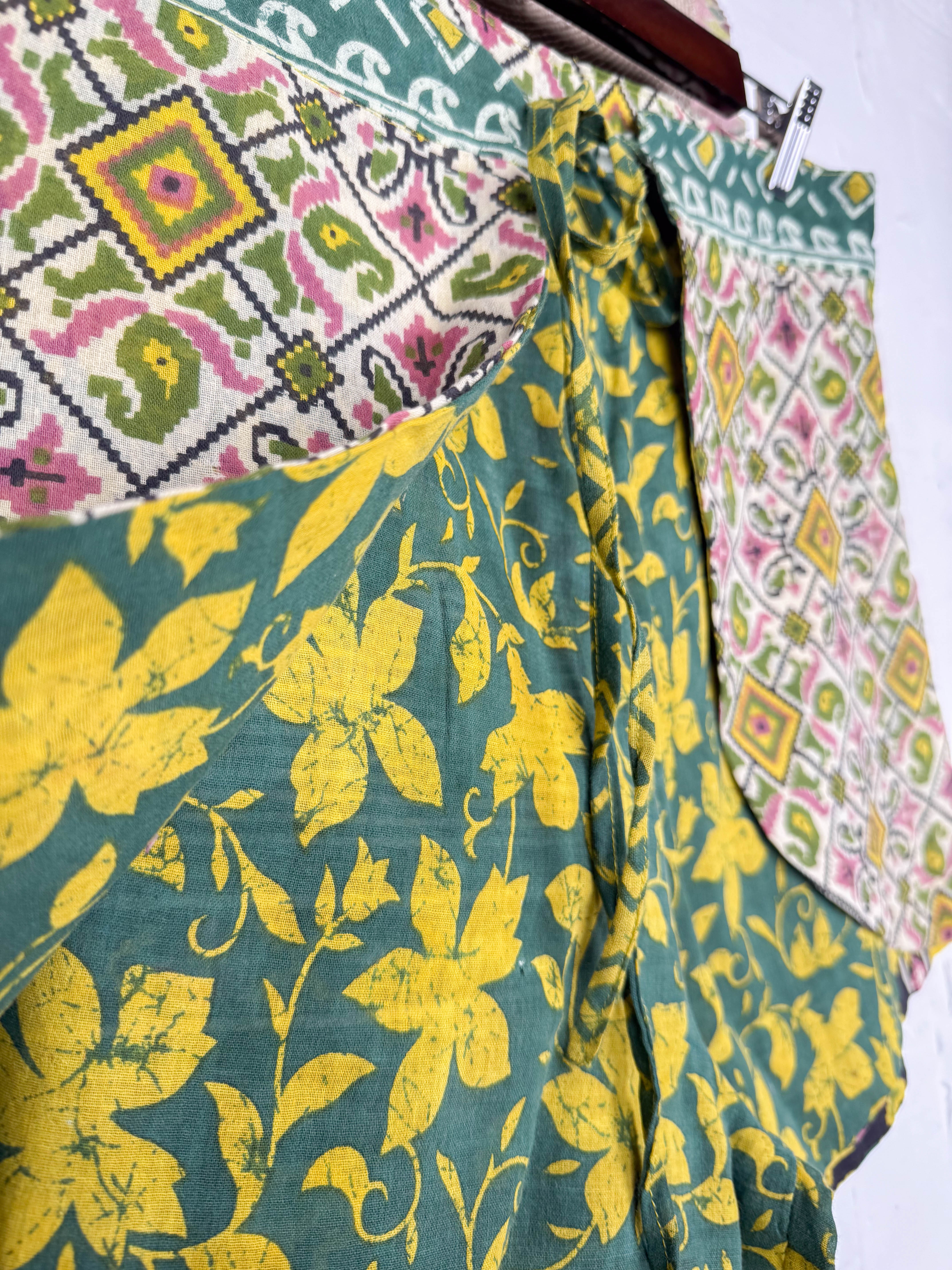 With the unique wrap style, they offer a perfect, adjustable fit that flatters every shape and size, secured with a stylish tie belt. The delightful combination of different prints and patchwork creates a fresh and playful look, ready for sunny adventures. Available in three sizes, these shorts are a celebration of individuality and joyful style