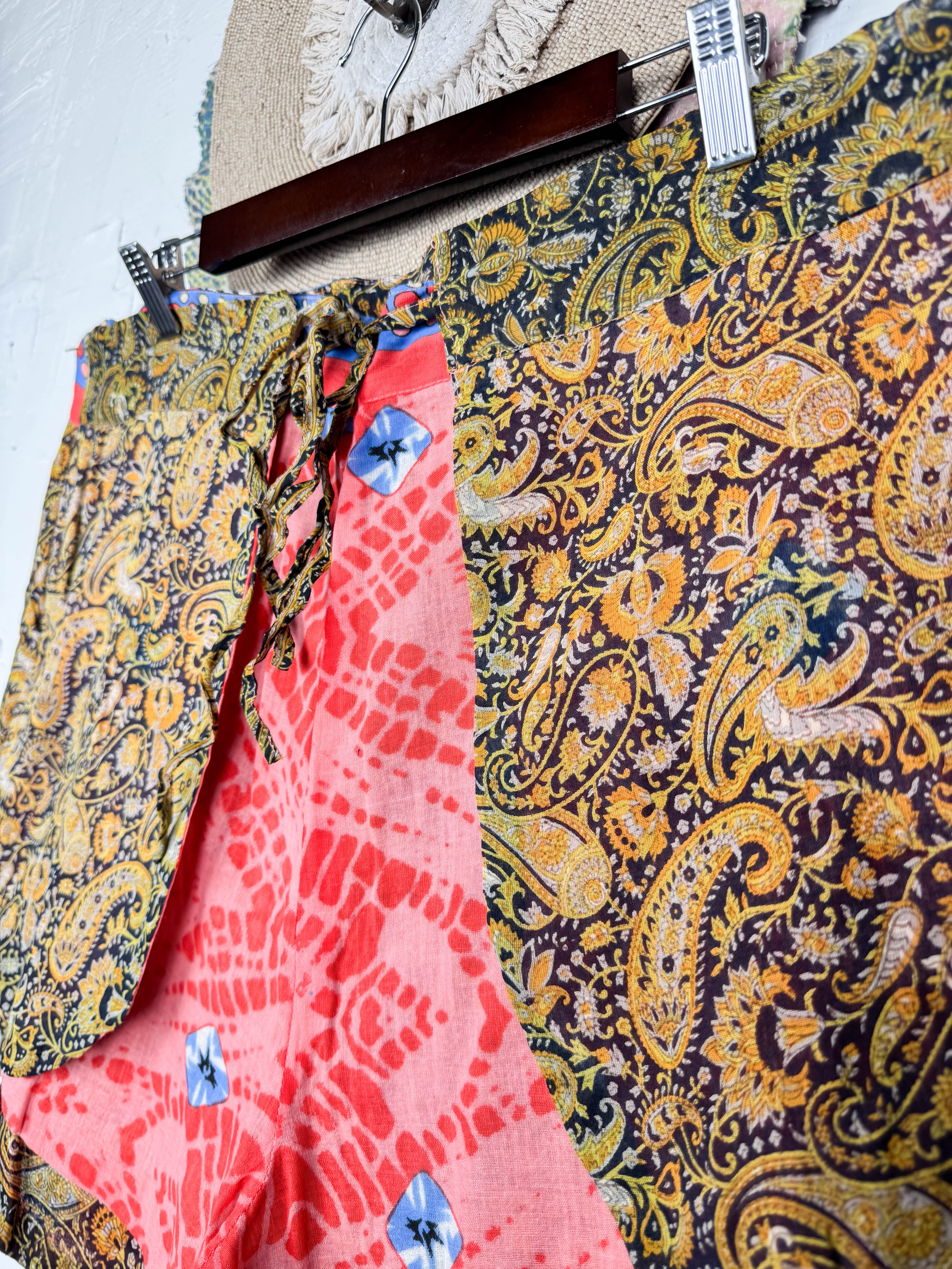 With the unique wrap style, they offer a perfect, adjustable fit that flatters every shape and size, secured with a stylish tie belt. The delightful combination of different prints and patchwork creates a fresh and playful look, ready for sunny adventures. Available in three sizes, these shorts are a celebration of individuality and joyful style