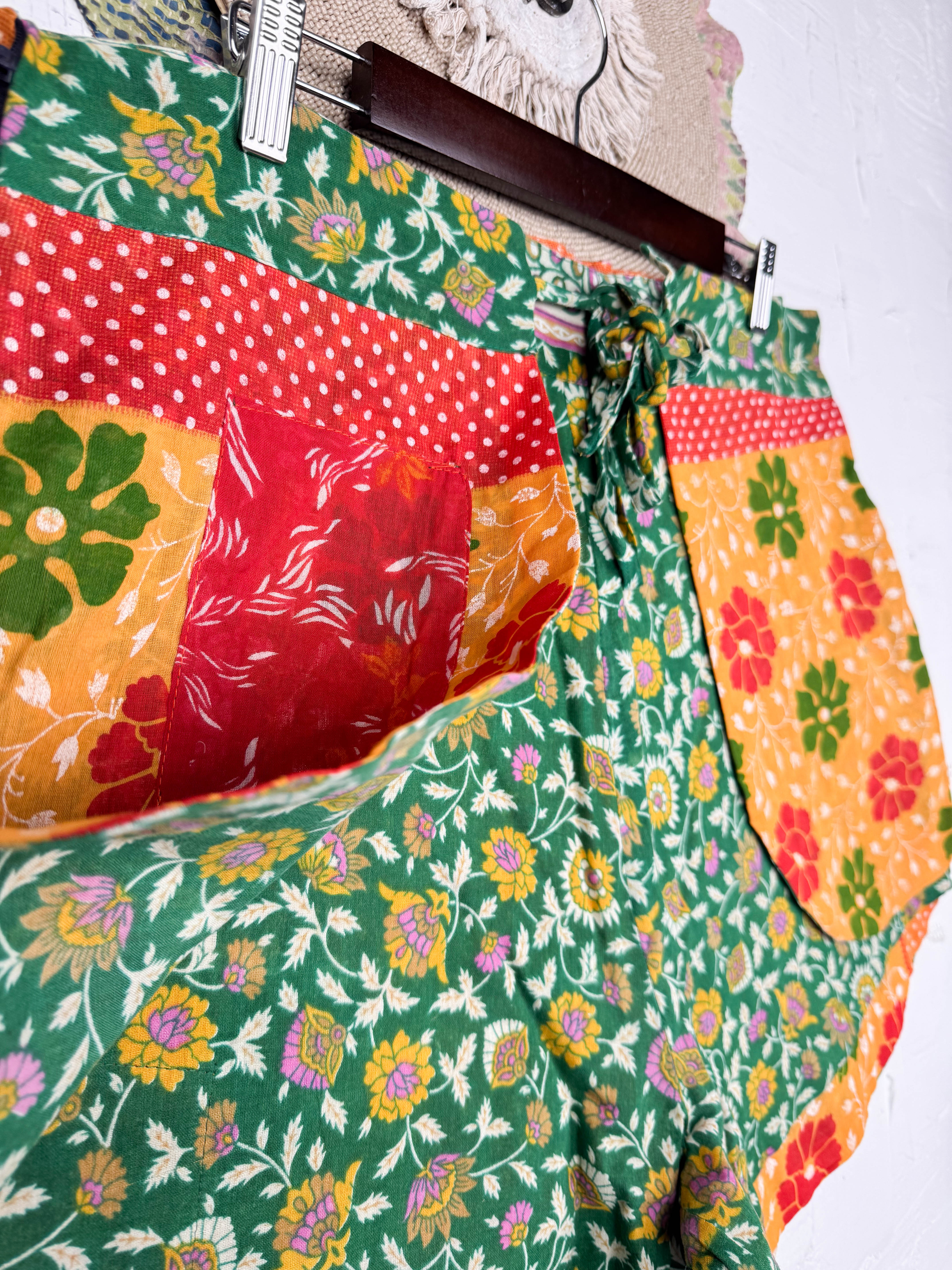 With the unique wrap style, they offer a perfect, adjustable fit that flatters every shape and size, secured with a stylish tie belt. The delightful combination of different prints and patchwork creates a fresh and playful look, ready for sunny adventures. Available in three sizes, these shorts are a celebration of individuality and joyful style