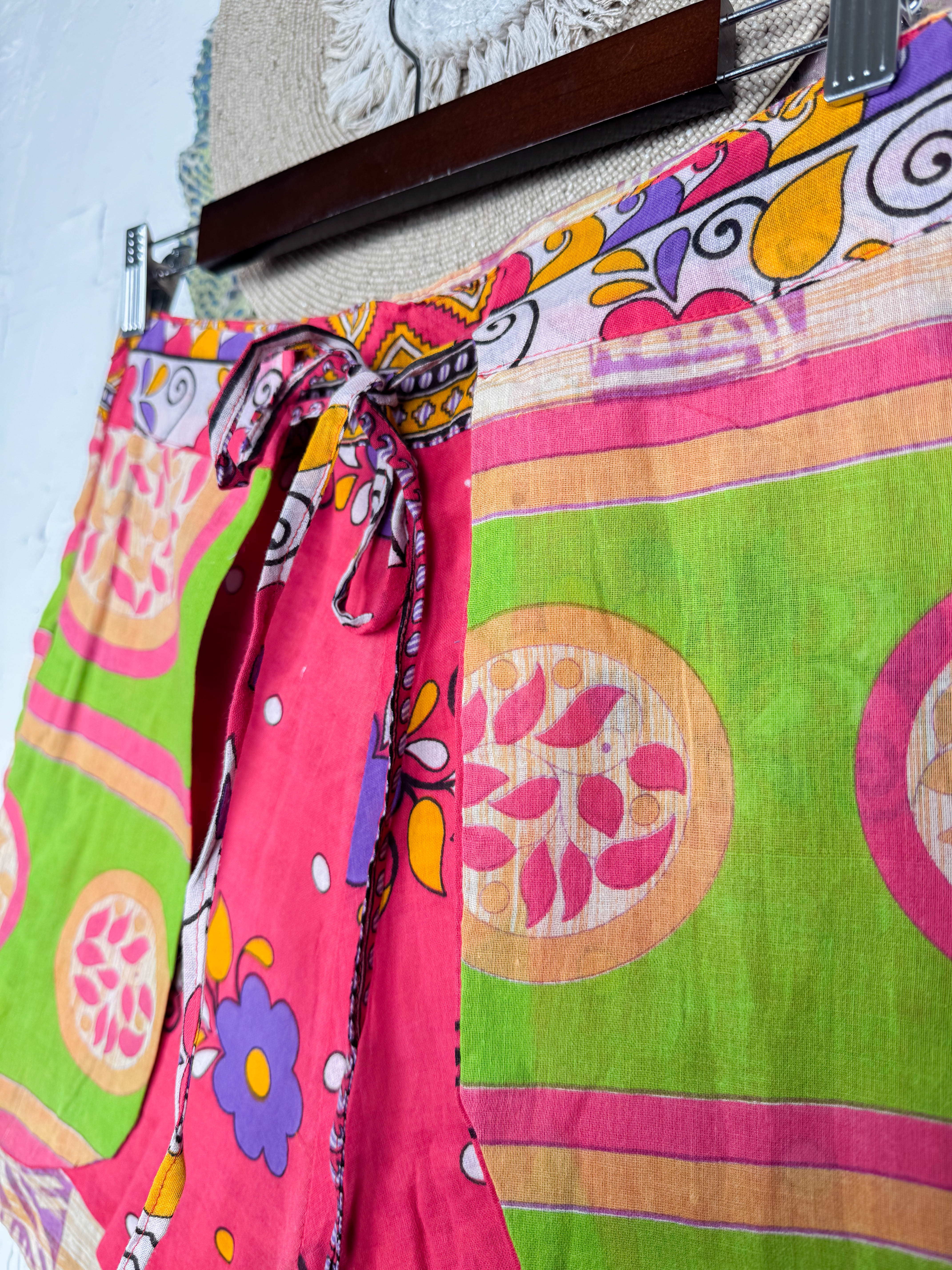 With the unique wrap style, they offer a perfect, adjustable fit that flatters every shape and size, secured with a stylish tie belt. The delightful combination of different prints and patchwork creates a fresh and playful look, ready for sunny adventures. Available in three sizes, these shorts are a celebration of individuality and joyful style