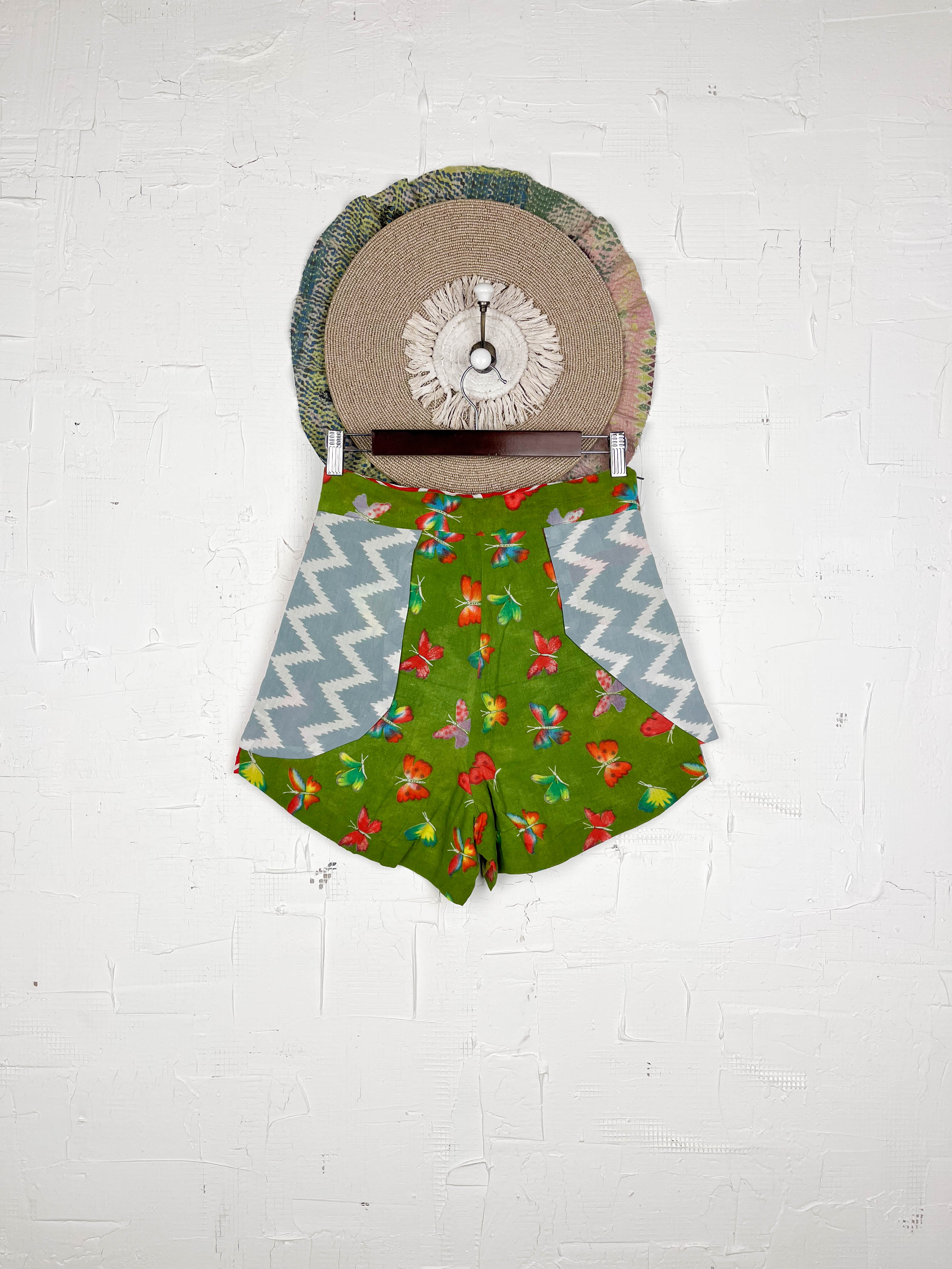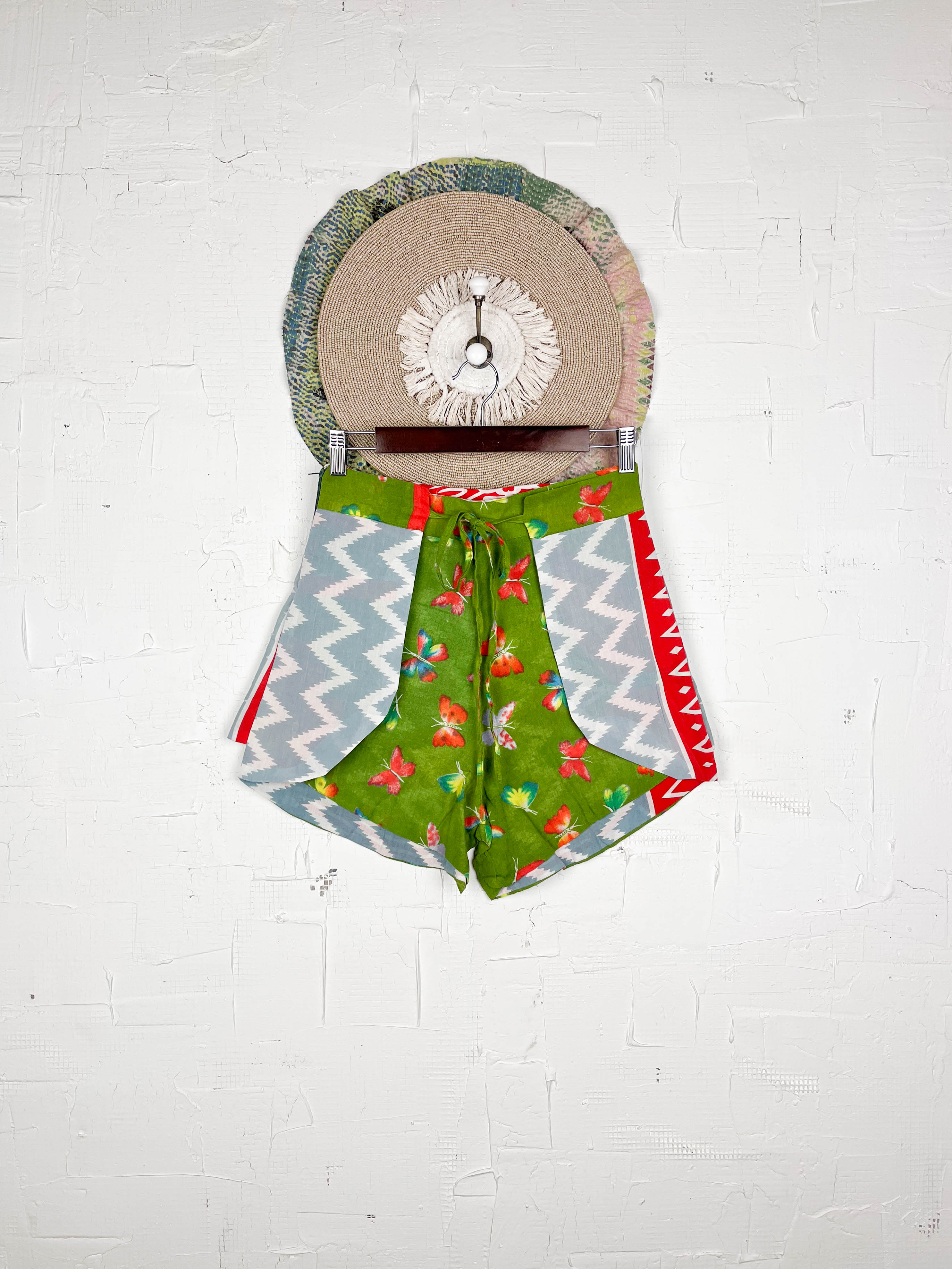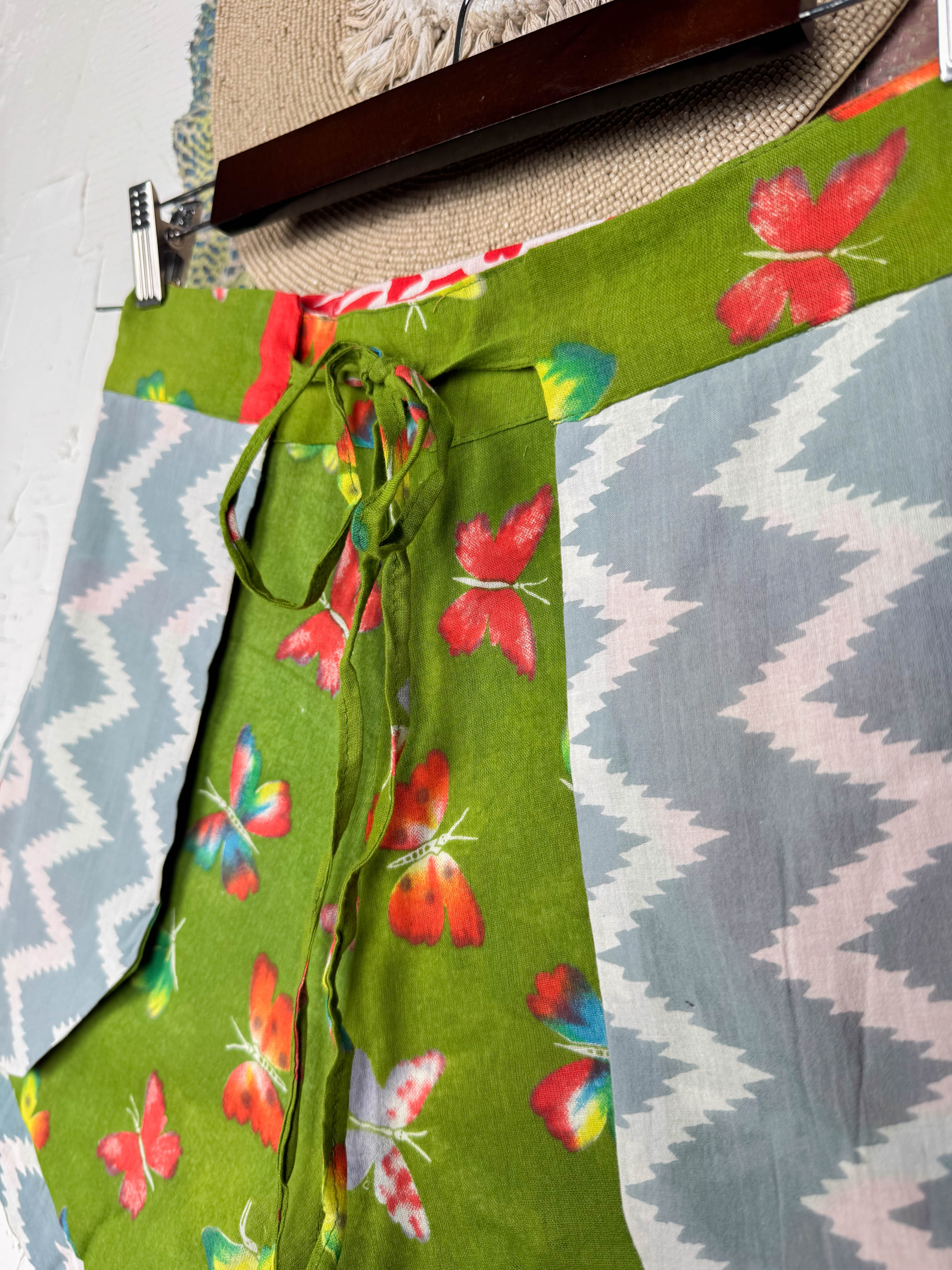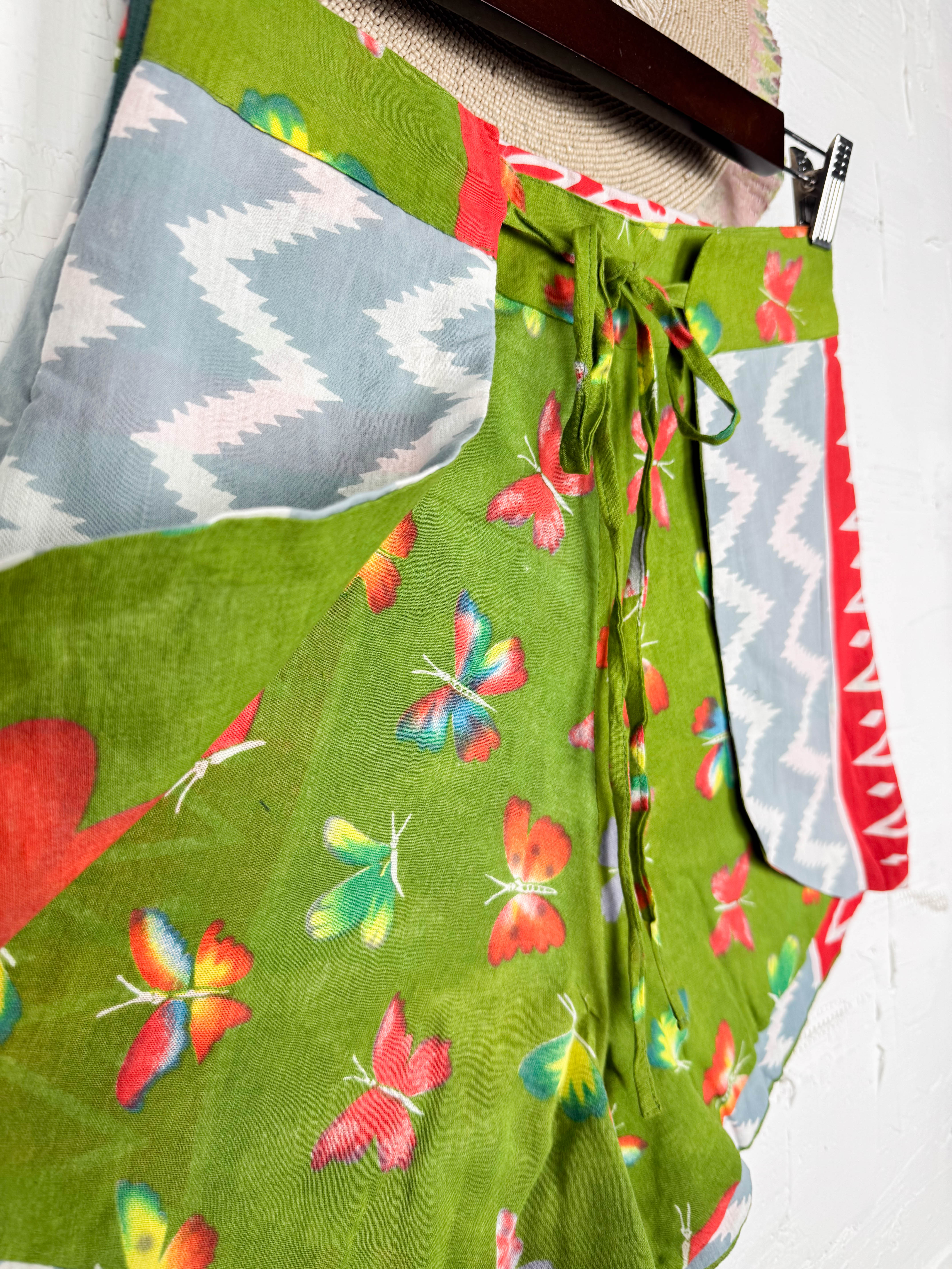 With the unique wrap style, they offer a perfect, adjustable fit that flatters every shape and size, secured with a stylish tie belt. The delightful combination of different prints and patchwork creates a fresh and playful look, ready for sunny adventures. Available in three sizes, these shorts are a celebration of individuality and joyful style