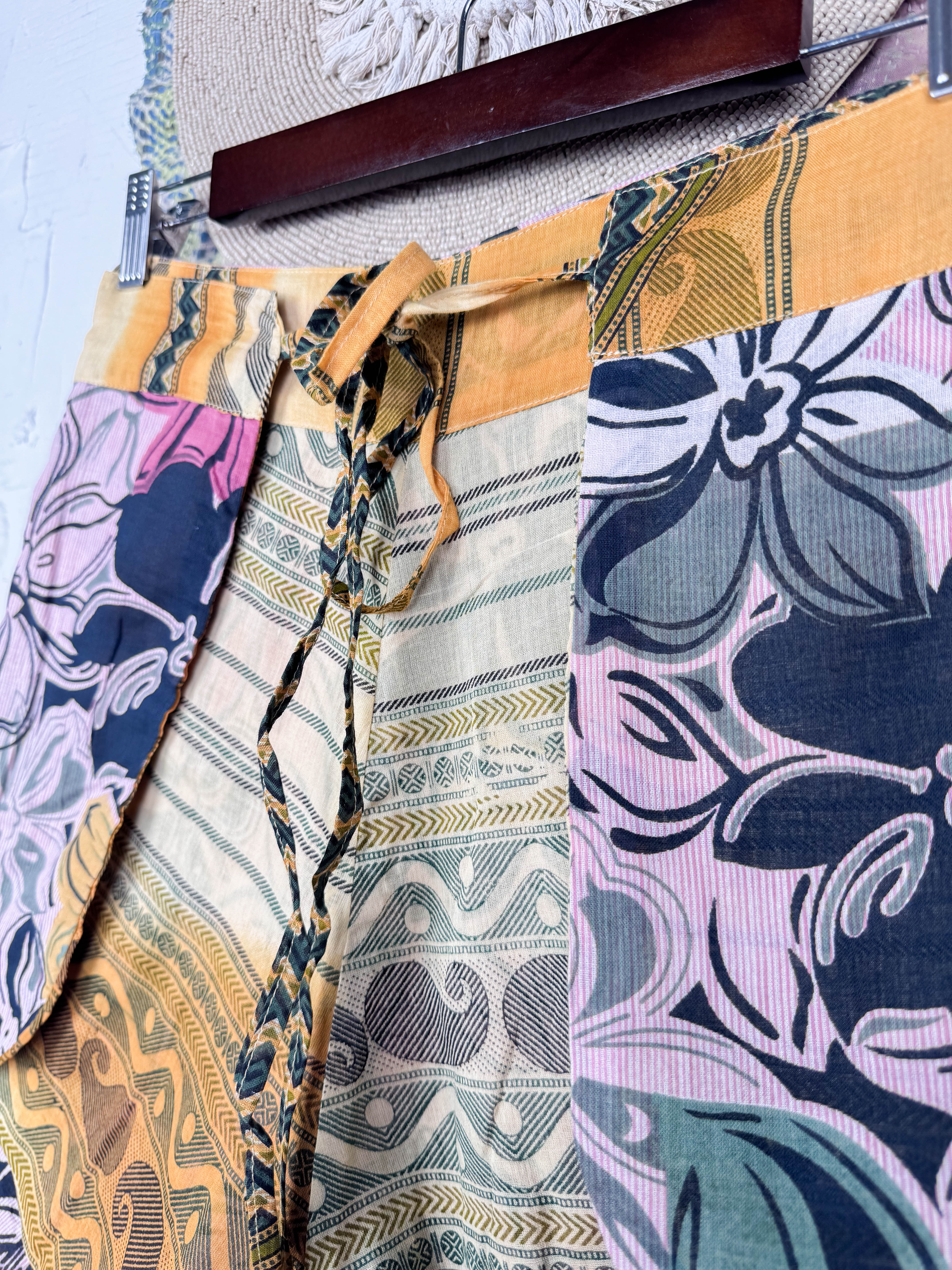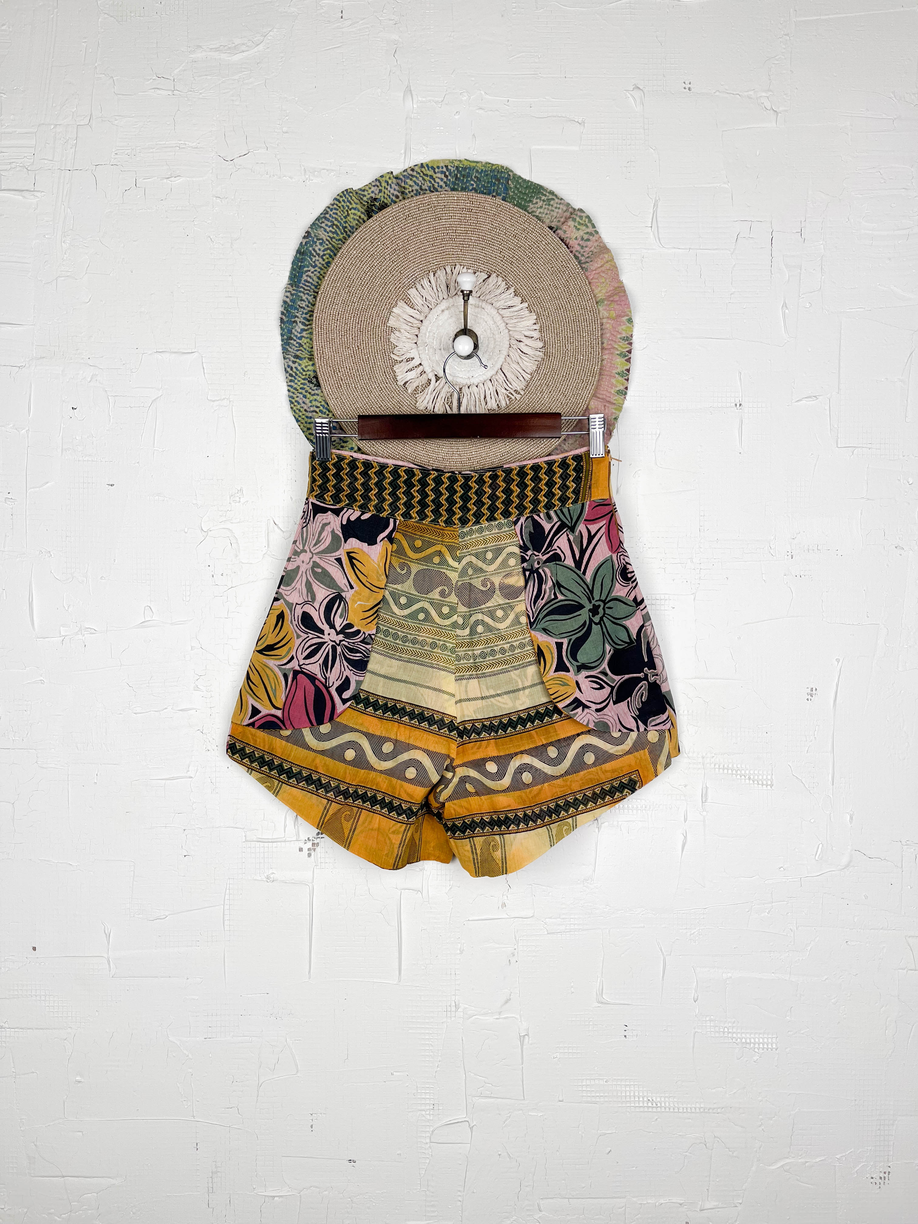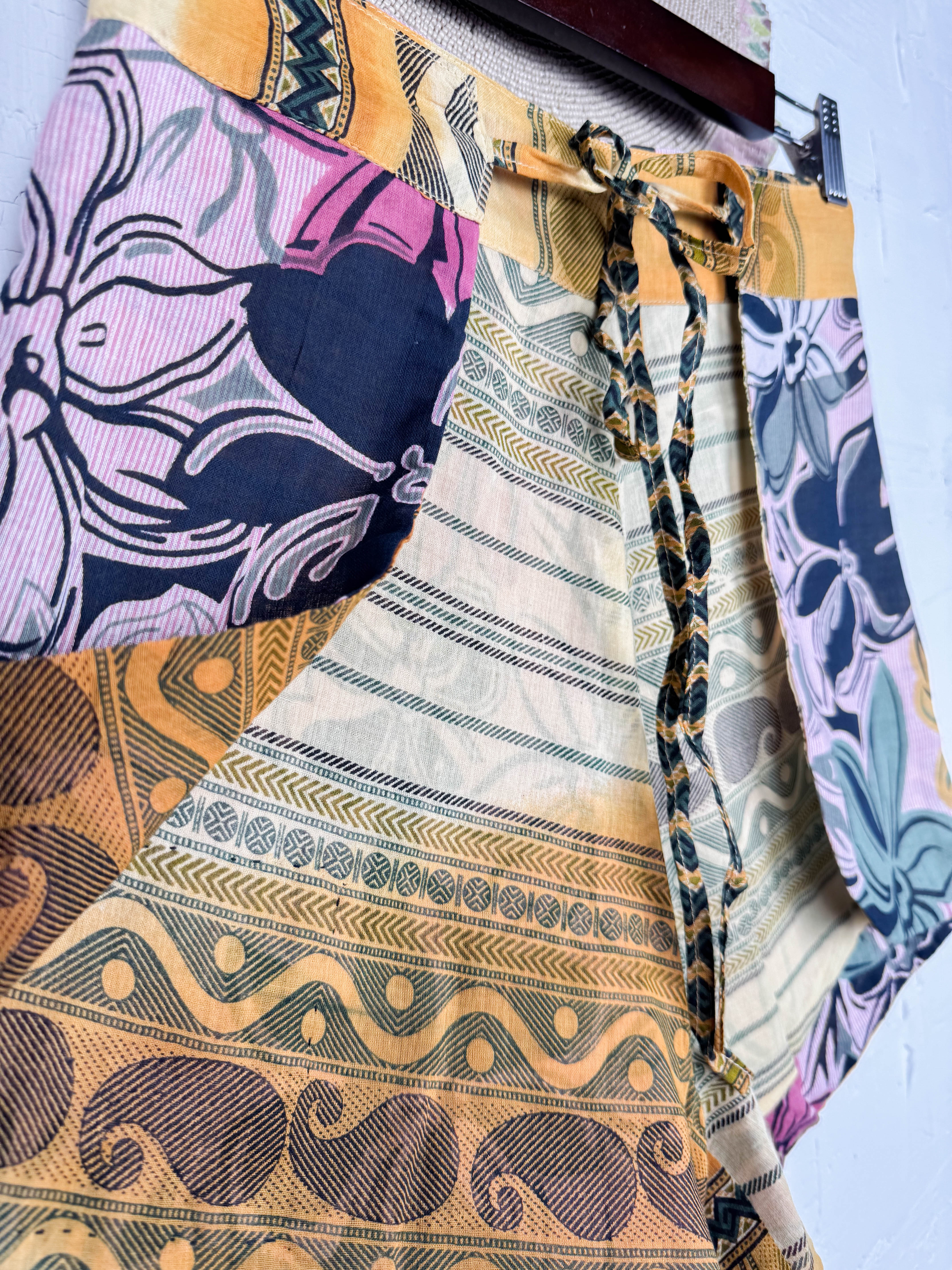 With the unique wrap style, they offer a perfect, adjustable fit that flatters every shape and size, secured with a stylish tie belt. The delightful combination of different prints and patchwork creates a fresh and playful look, ready for sunny adventures. Available in three sizes, these shorts are a celebration of individuality and joyful style