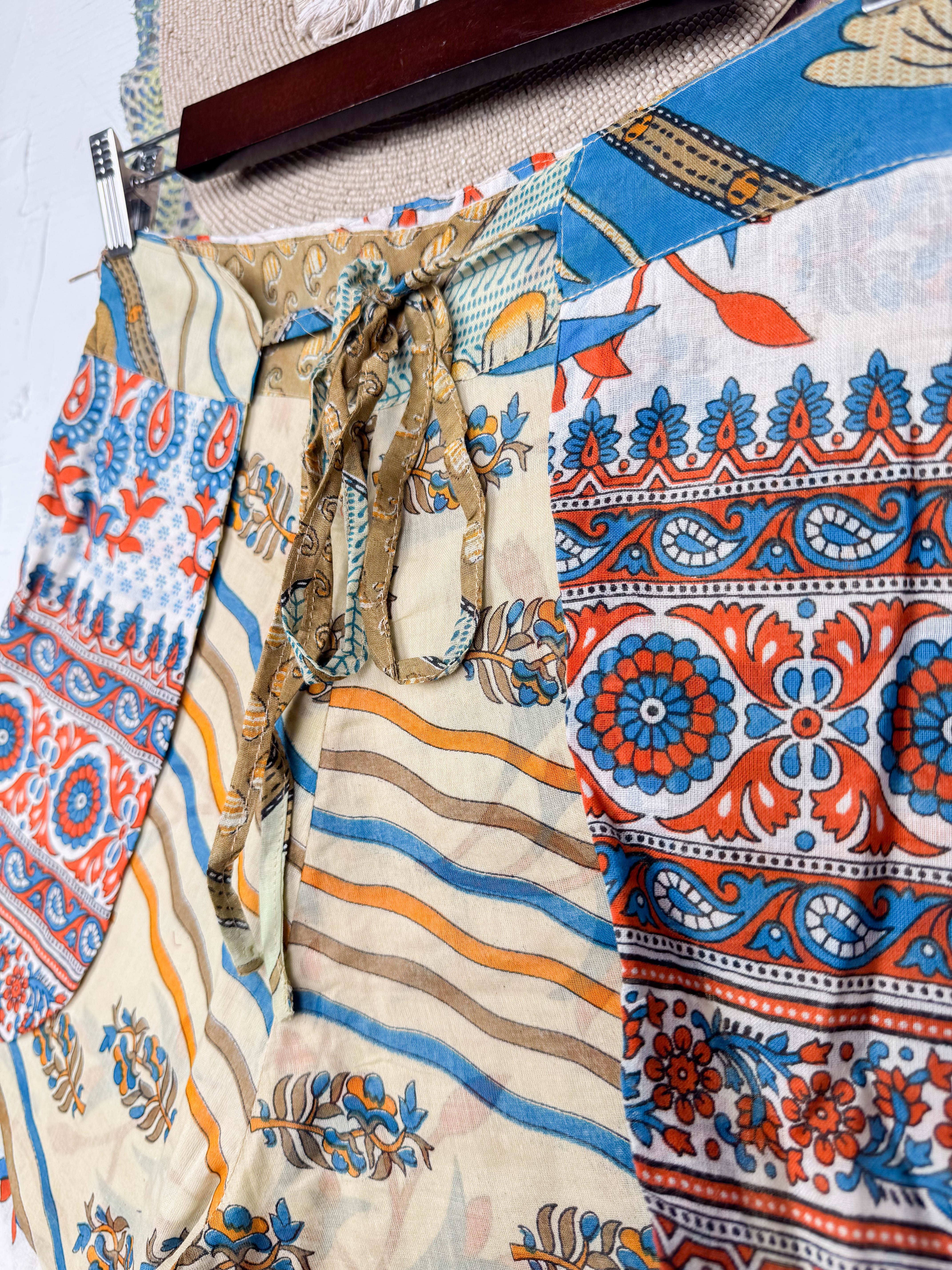 With the unique wrap style, they offer a perfect, adjustable fit that flatters every shape and size, secured with a stylish tie belt. The delightful combination of different prints and patchwork creates a fresh and playful look, ready for sunny adventures. Available in three sizes, these shorts are a celebration of individuality and joyful style