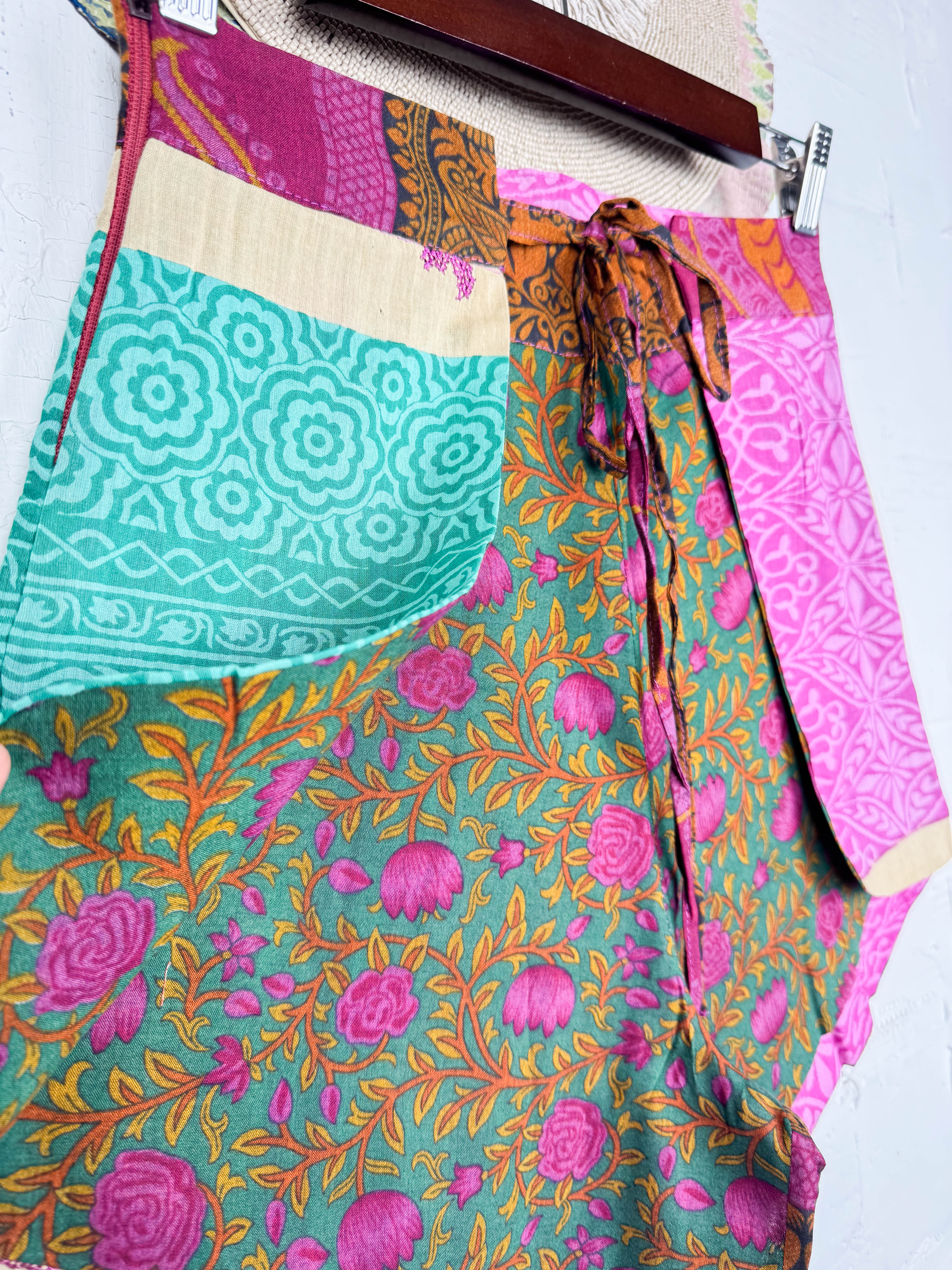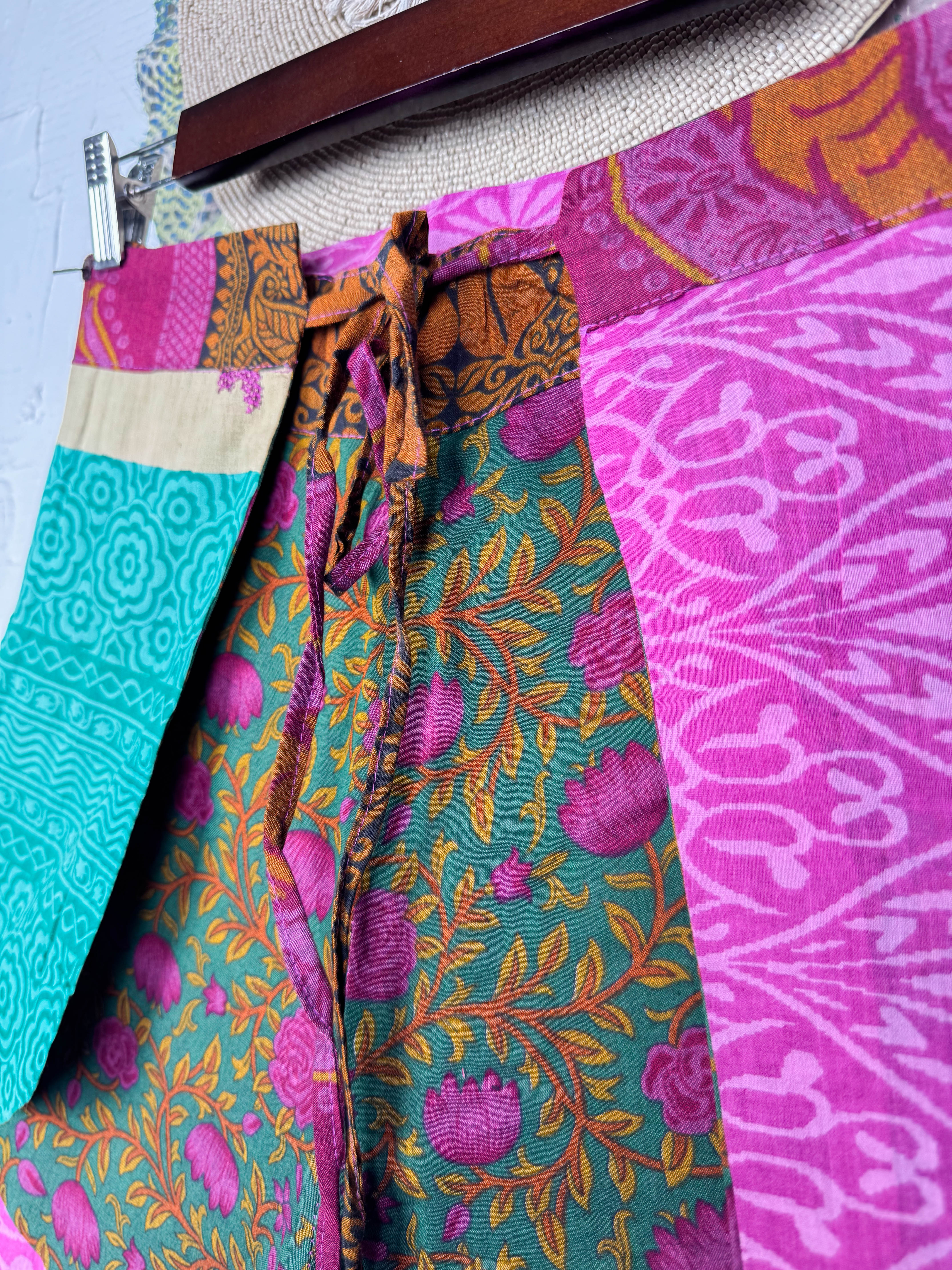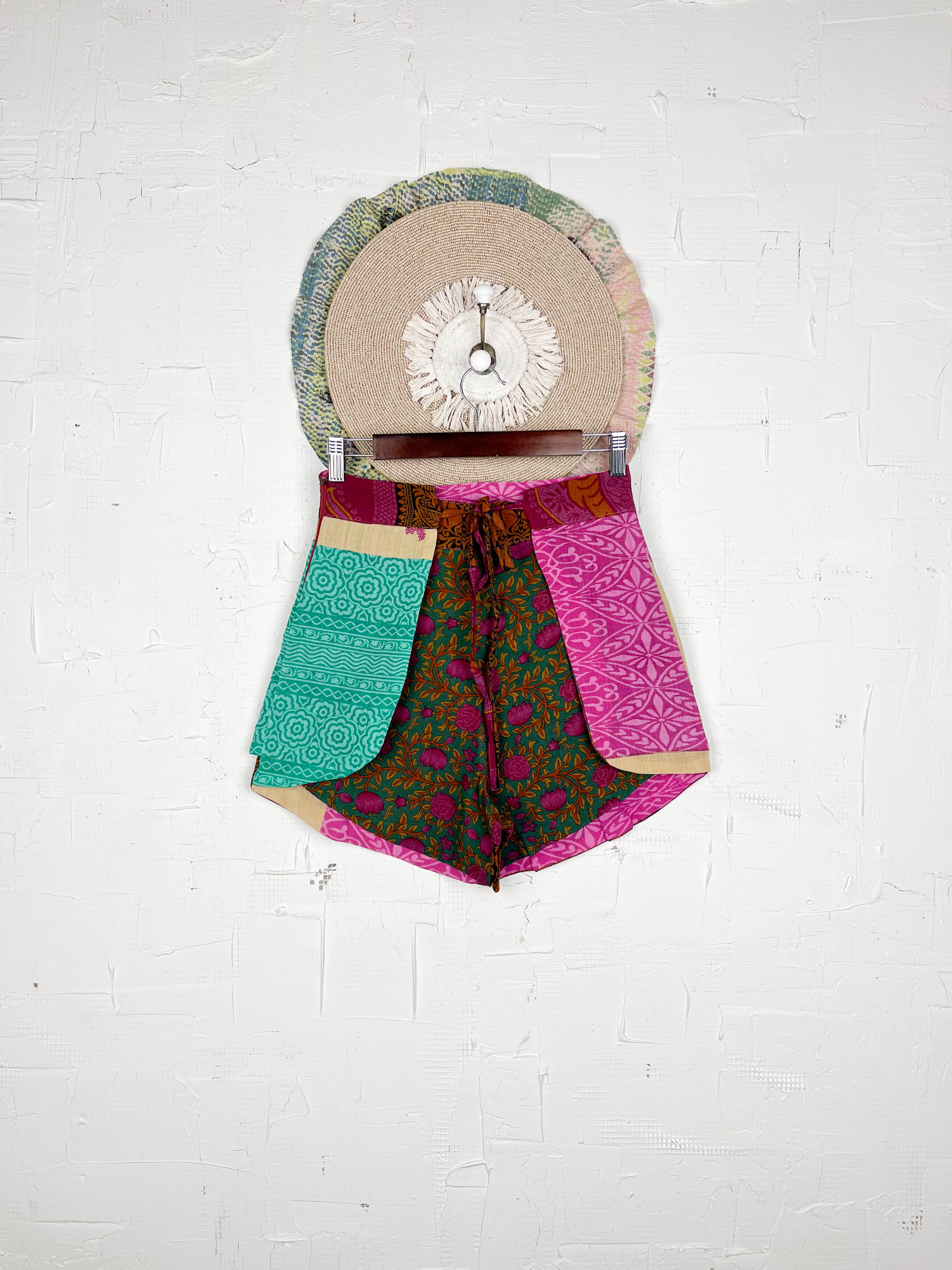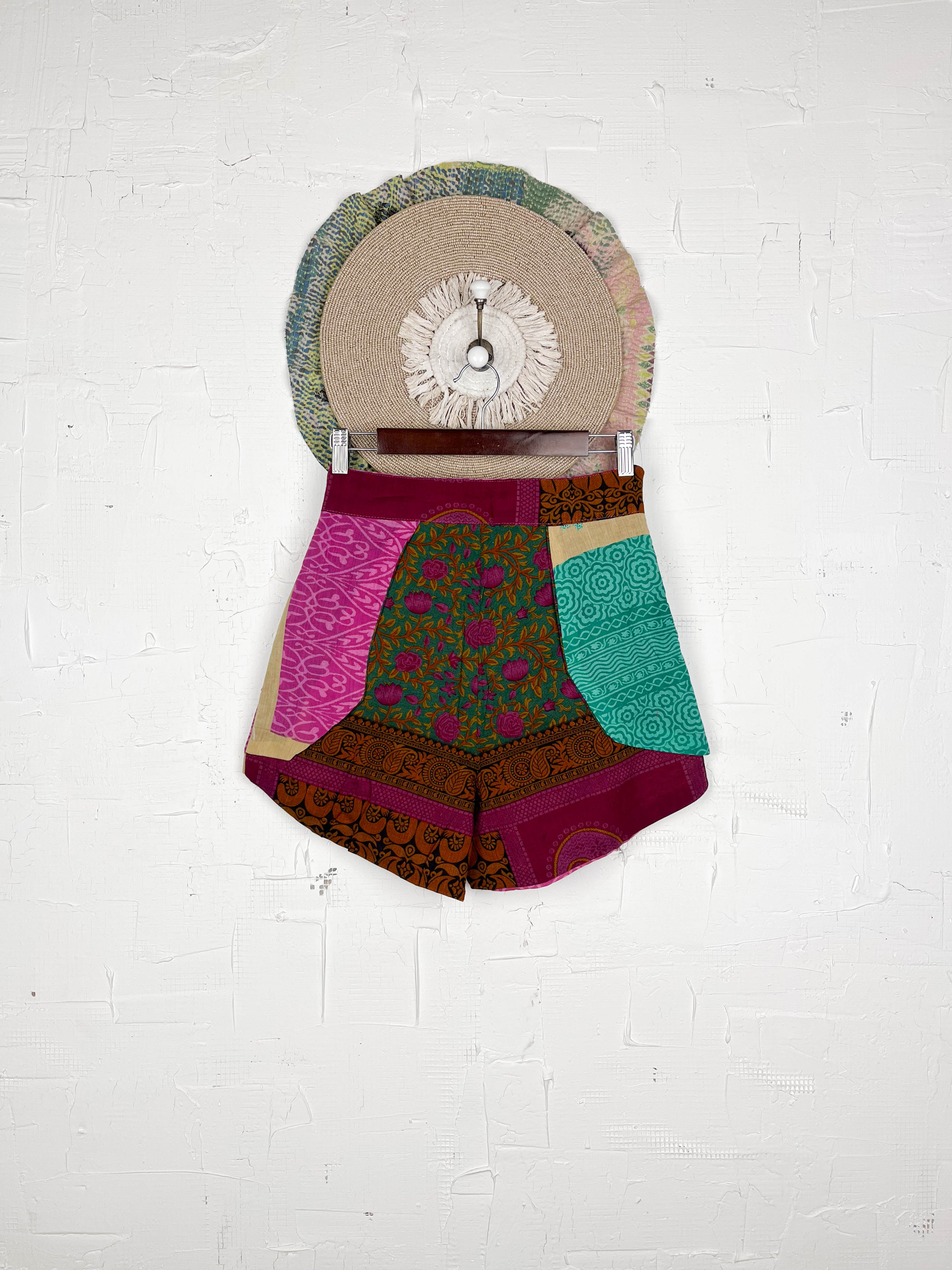 With the unique wrap style, they offer a perfect, adjustable fit that flatters every shape and size, secured with a stylish tie belt. The delightful combination of different prints and patchwork creates a fresh and playful look, ready for sunny adventures. Available in three sizes, these shorts are a celebration of individuality and joyful style