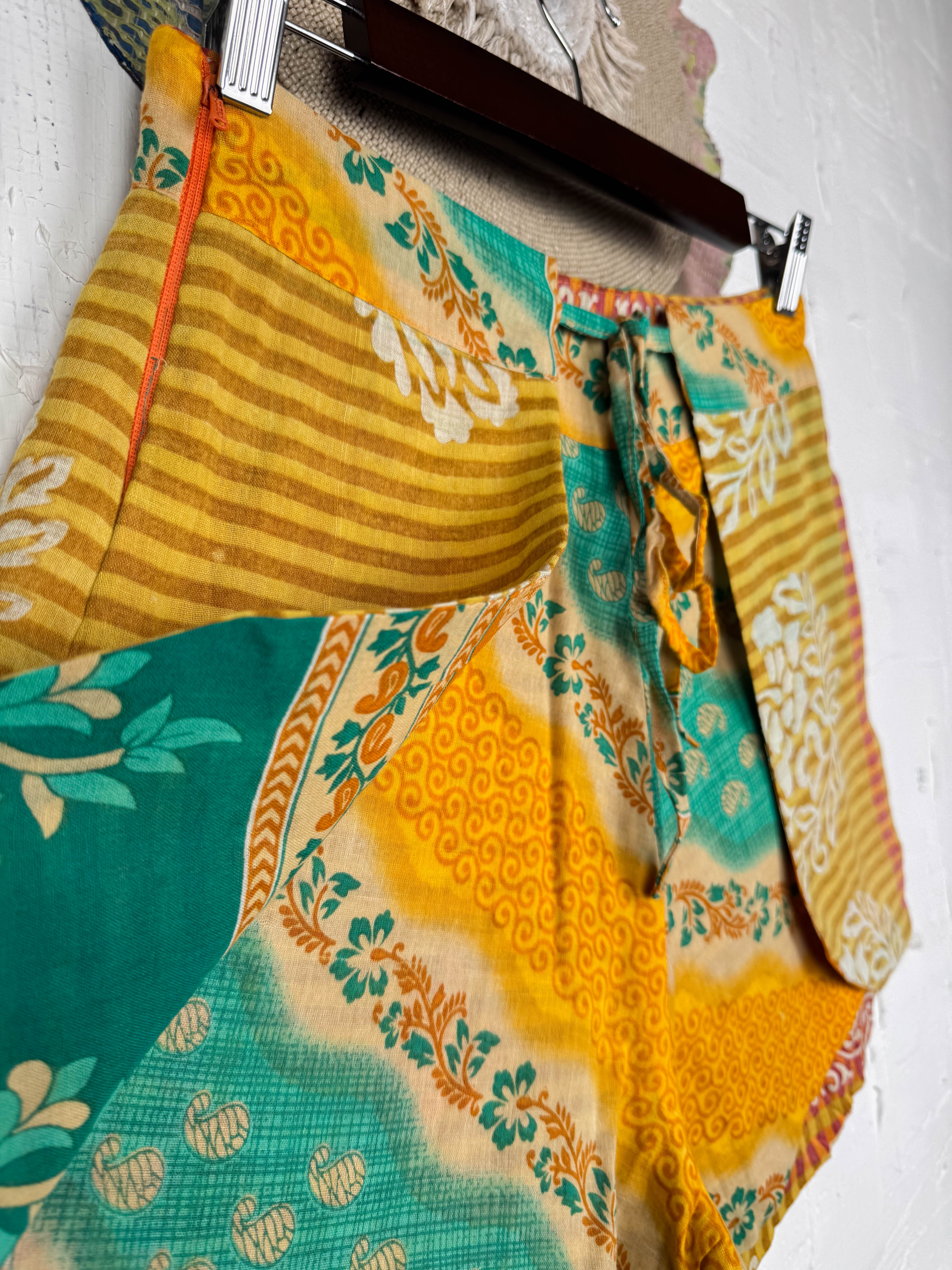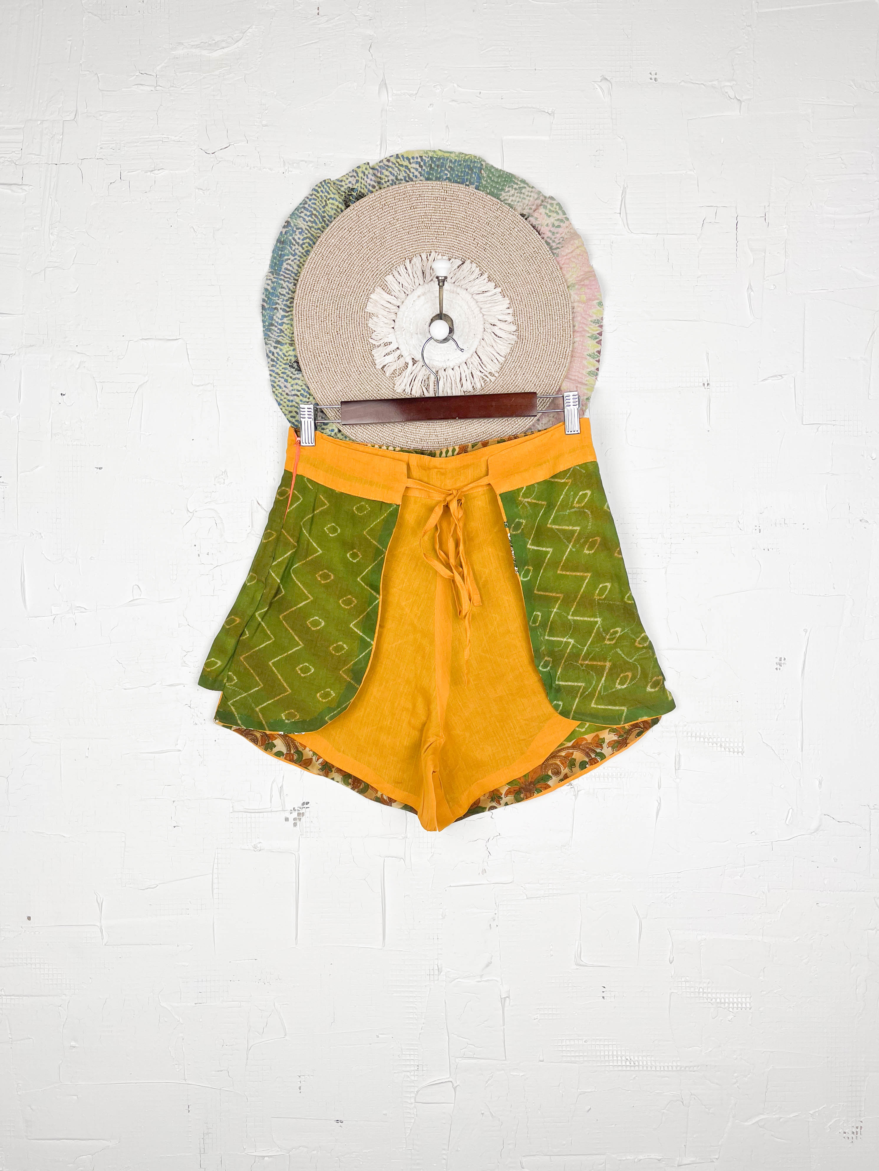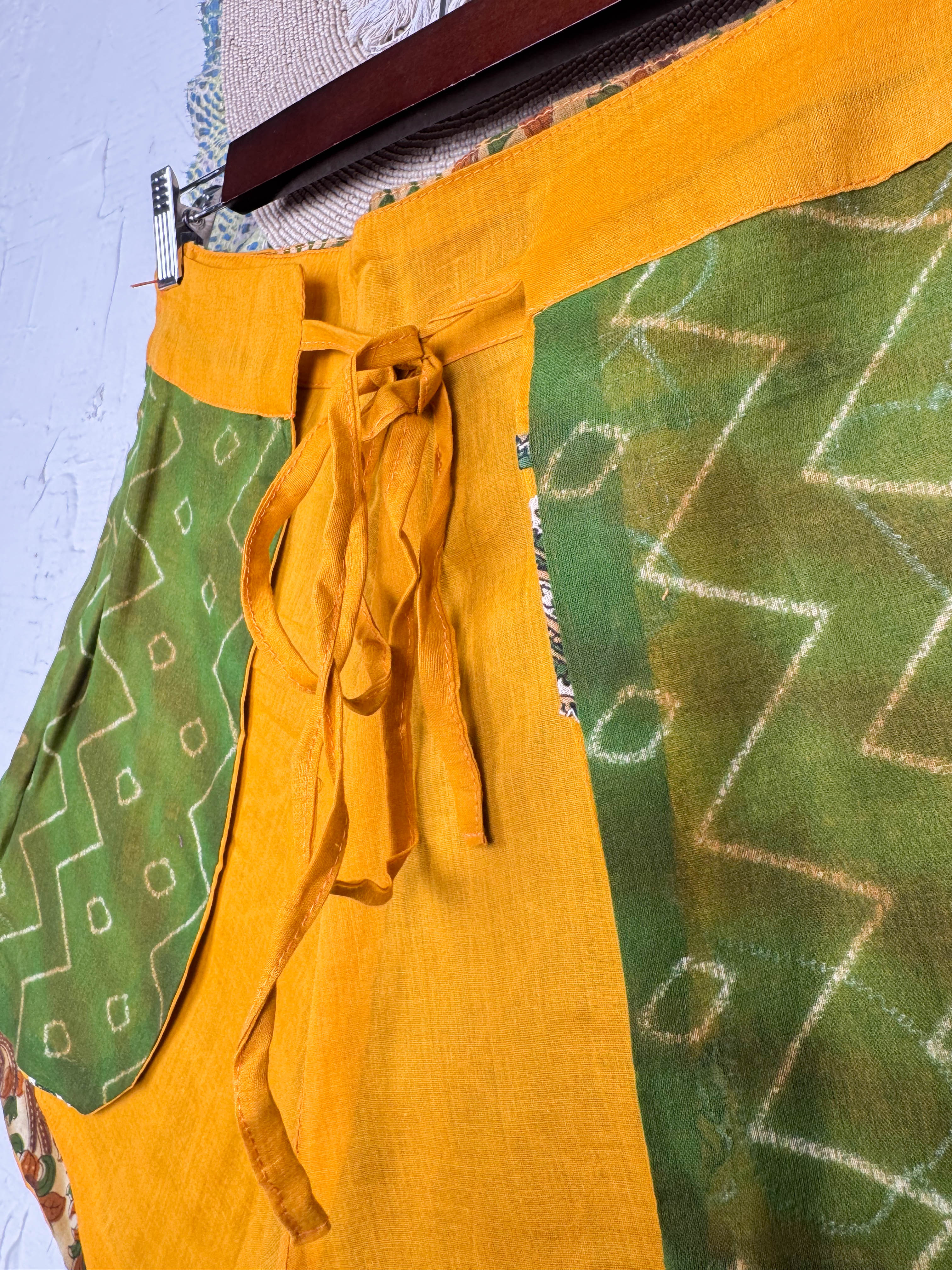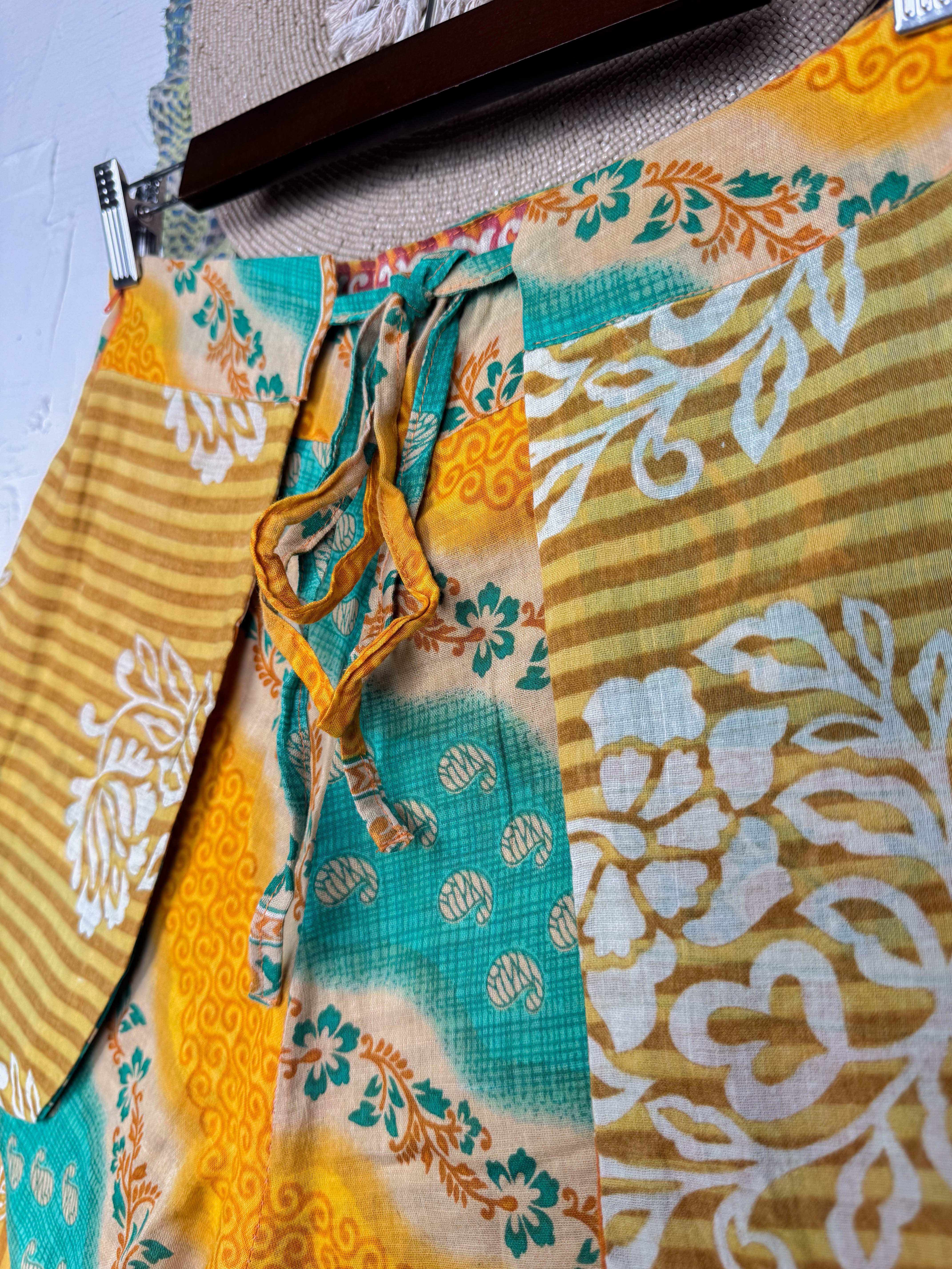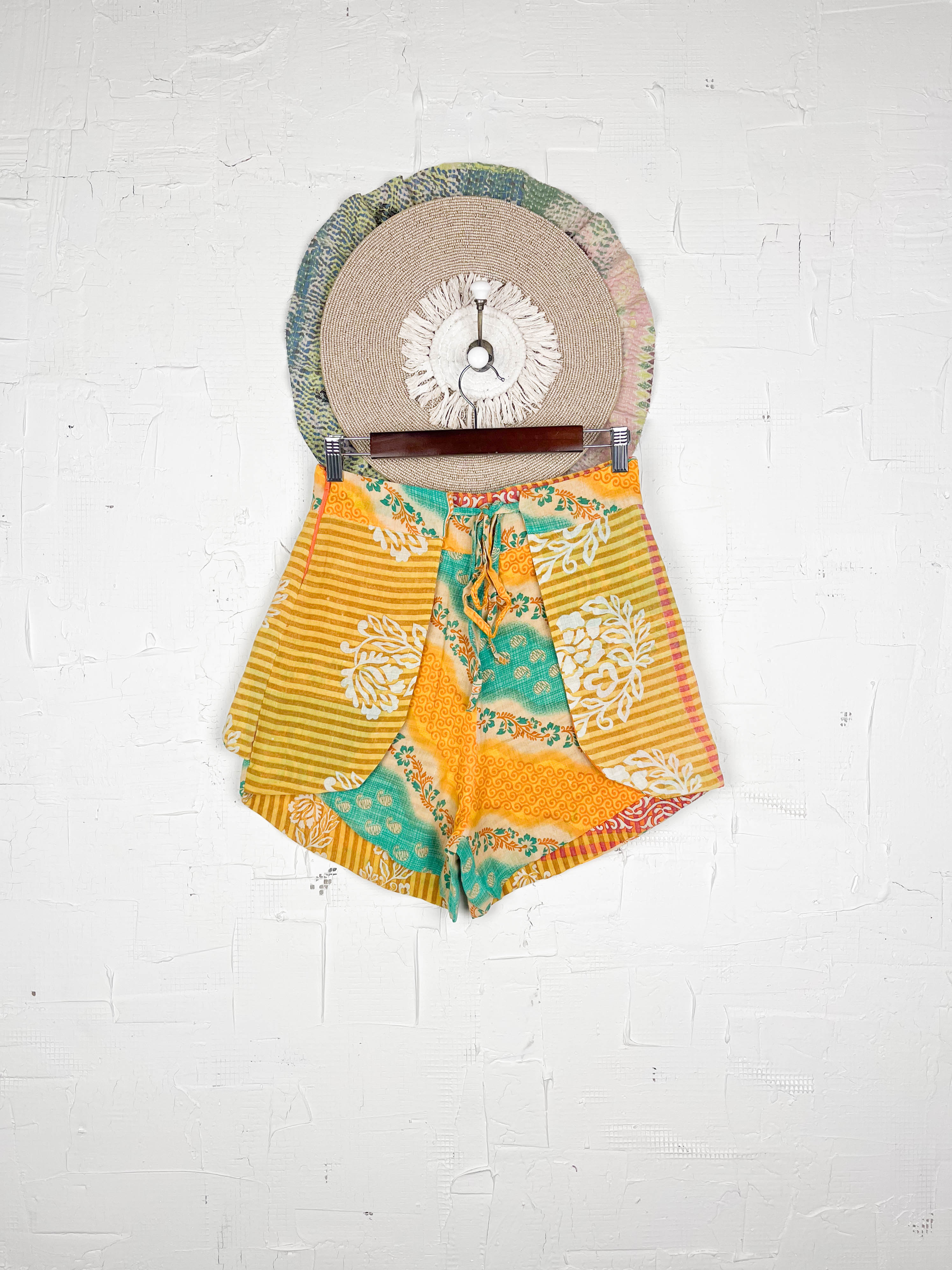 With the unique wrap style, they offer a perfect, adjustable fit that flatters every shape and size, secured with a stylish tie belt. The delightful combination of different prints and patchwork creates a fresh and playful look, ready for sunny adventures. Available in three sizes, these shorts are a celebration of individuality and joyful style