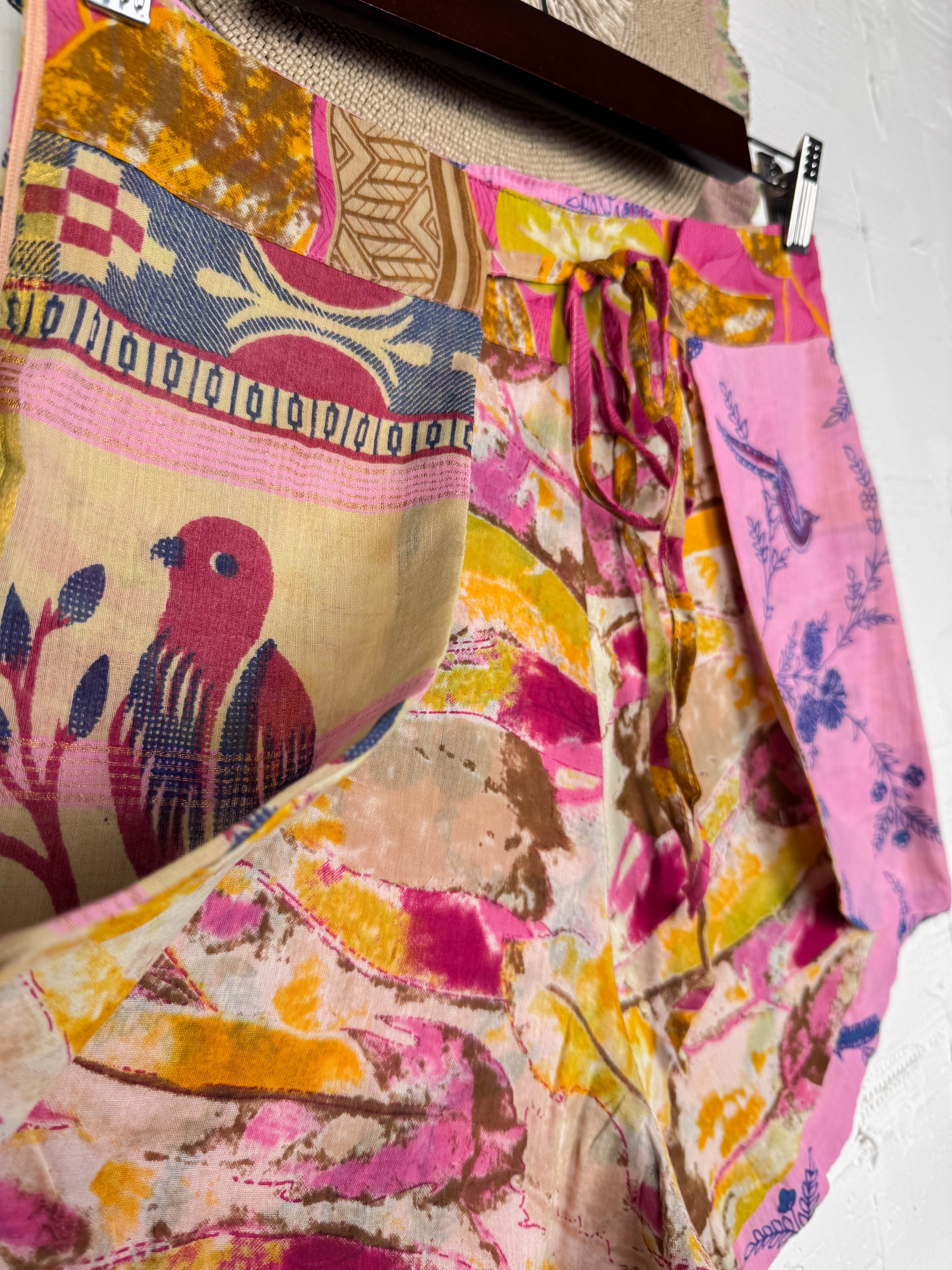 With the unique wrap style, they offer a perfect, adjustable fit that flatters every shape and size, secured with a stylish tie belt. The delightful combination of different prints and patchwork creates a fresh and playful look, ready for sunny adventures. Available in three sizes, these shorts are a celebration of individuality and joyful style