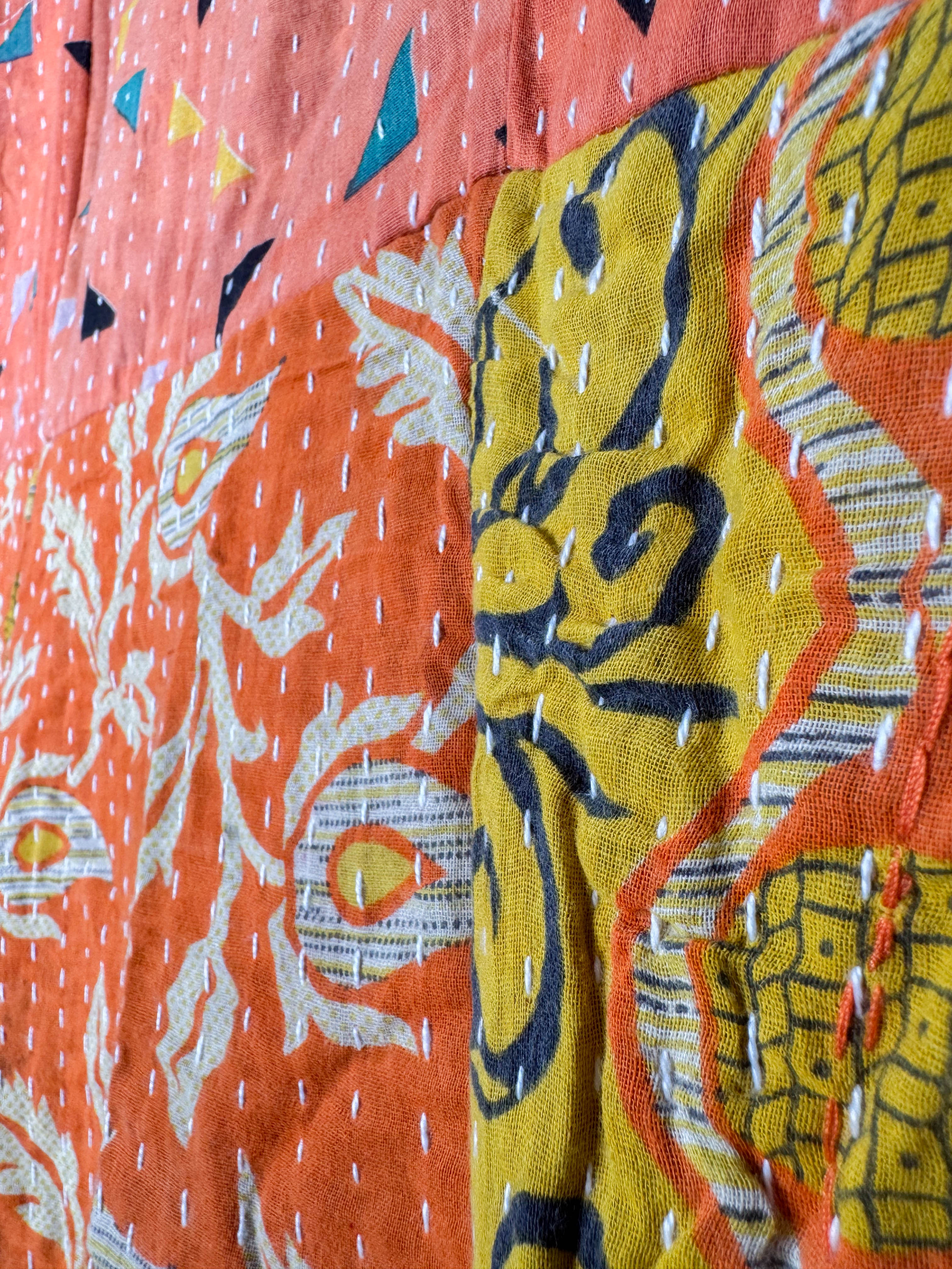 Envelop yourself in the artistry of this vintage Kantha dress. Each running stitch tells a story across the lightweight fabric, creating a unique texture and a beautifully airy feel. A long slit graces the left side, adding a touch of distinctive charm. Experience the seamless harmony of traditional hand craftsmanship and everyday ease to enhance your Playful feminine essence every day!