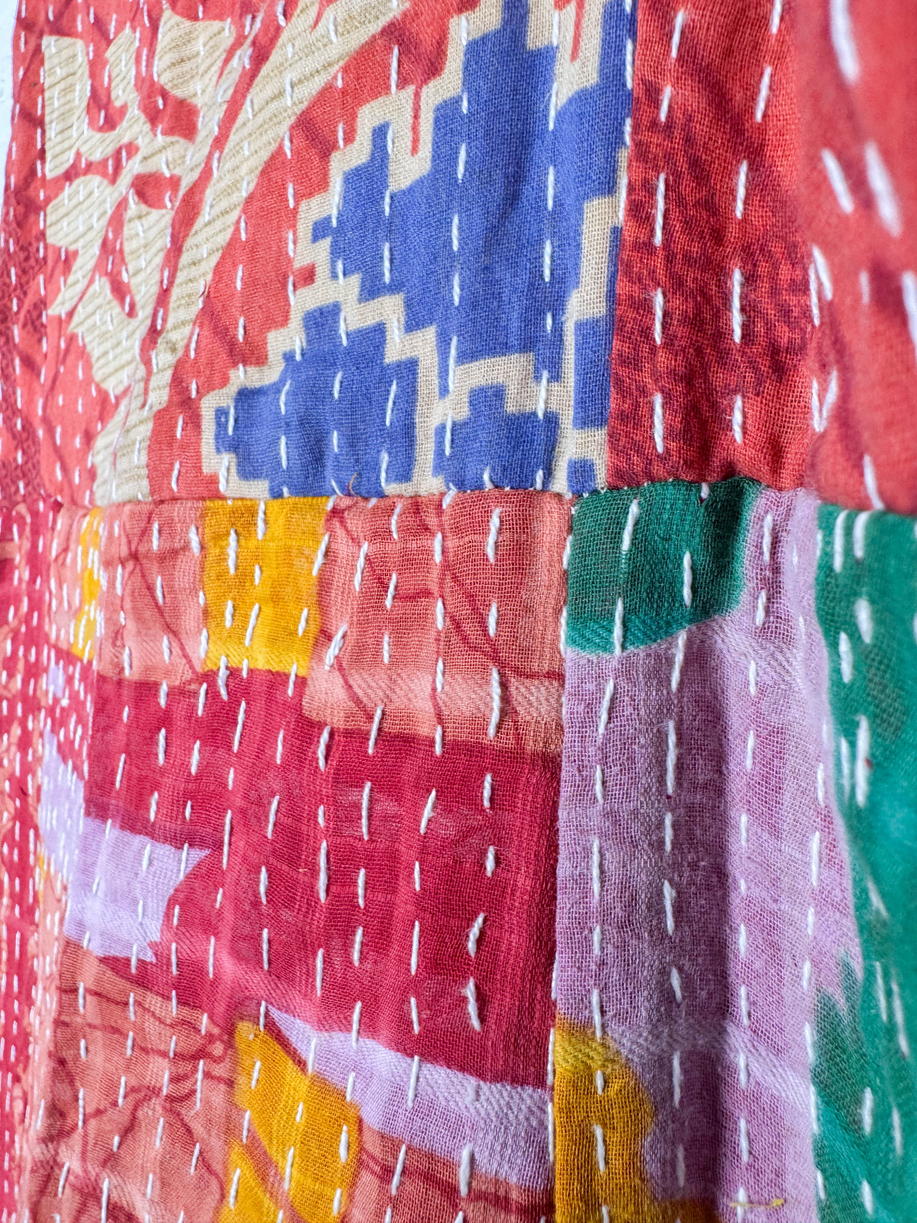 Envelop yourself in the artistry of this vintage Kantha dress. Each running stitch tells a story across the lightweight fabric, creating a unique texture and a beautifully airy feel. A long slit graces the left side, adding a touch of distinctive charm. Experience the seamless harmony of traditional hand craftsmanship and everyday ease to enhance your Playful feminine essence every day!