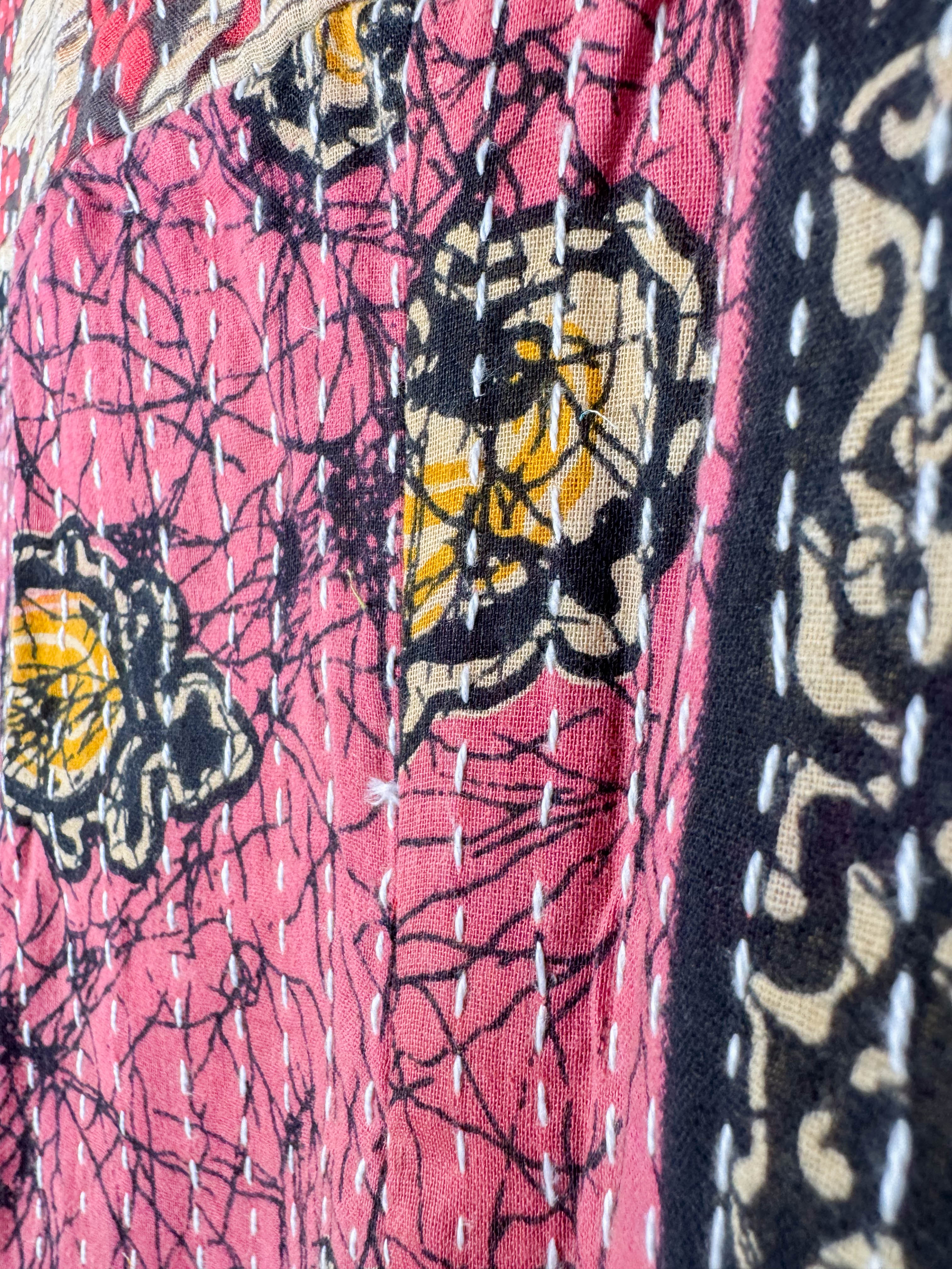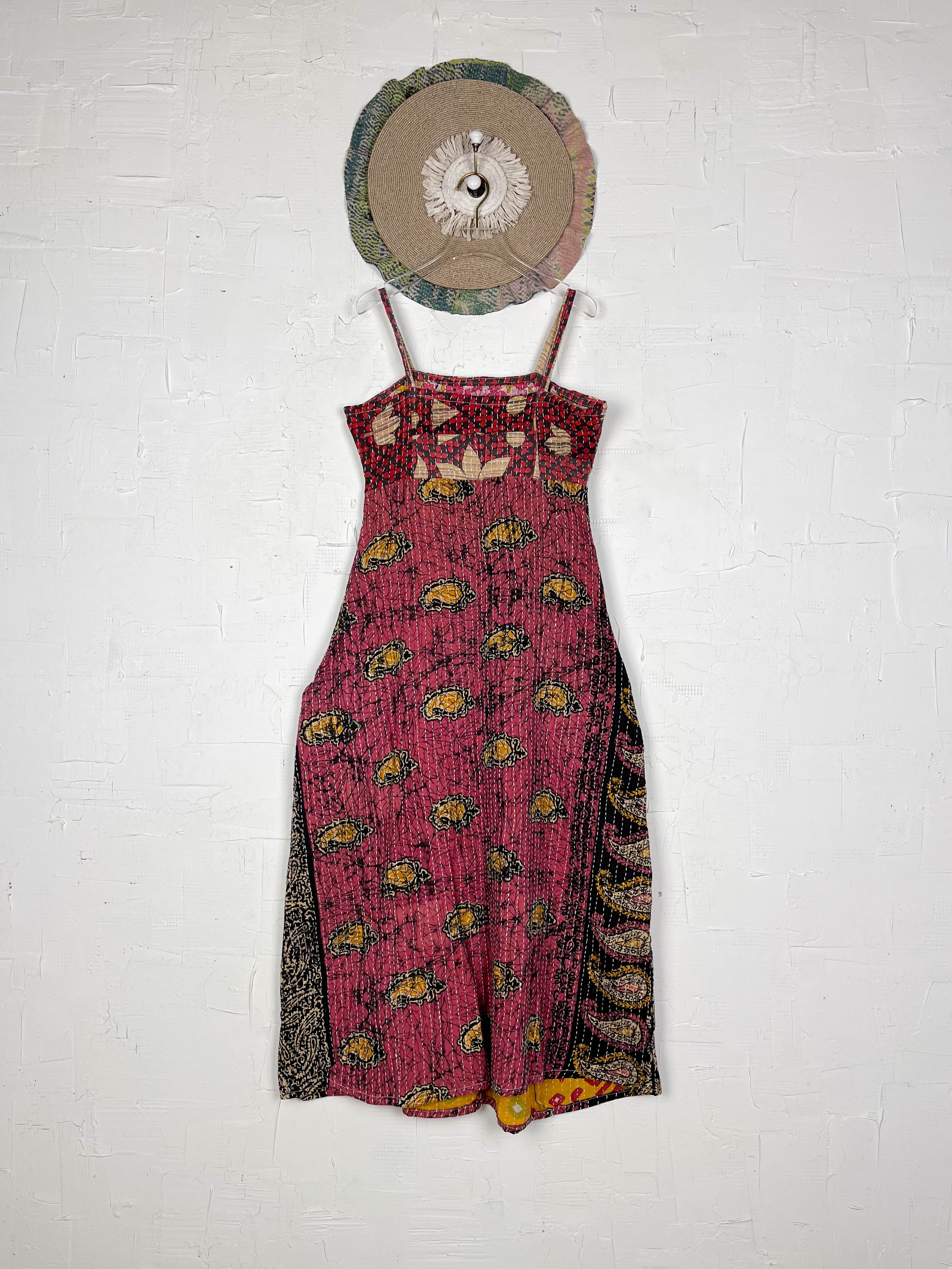 Envelop yourself in the artistry of this vintage Kantha dress. Each running stitch tells a story across the lightweight fabric, creating a unique texture and a beautifully airy feel. A long slit graces the left side, adding a touch of distinctive charm. Experience the seamless harmony of traditional hand craftsmanship and everyday ease to enhance your Playful feminine essence every day!