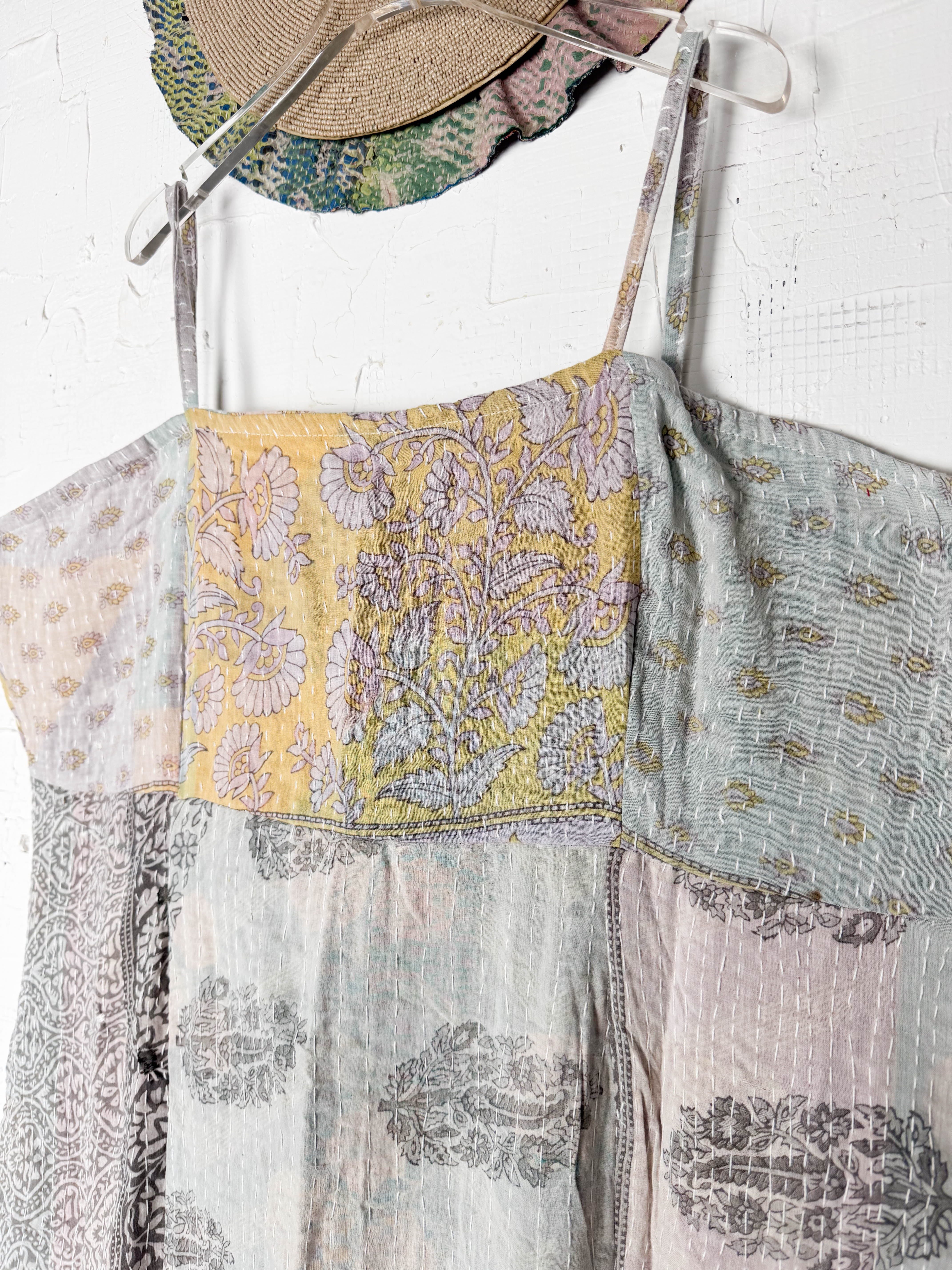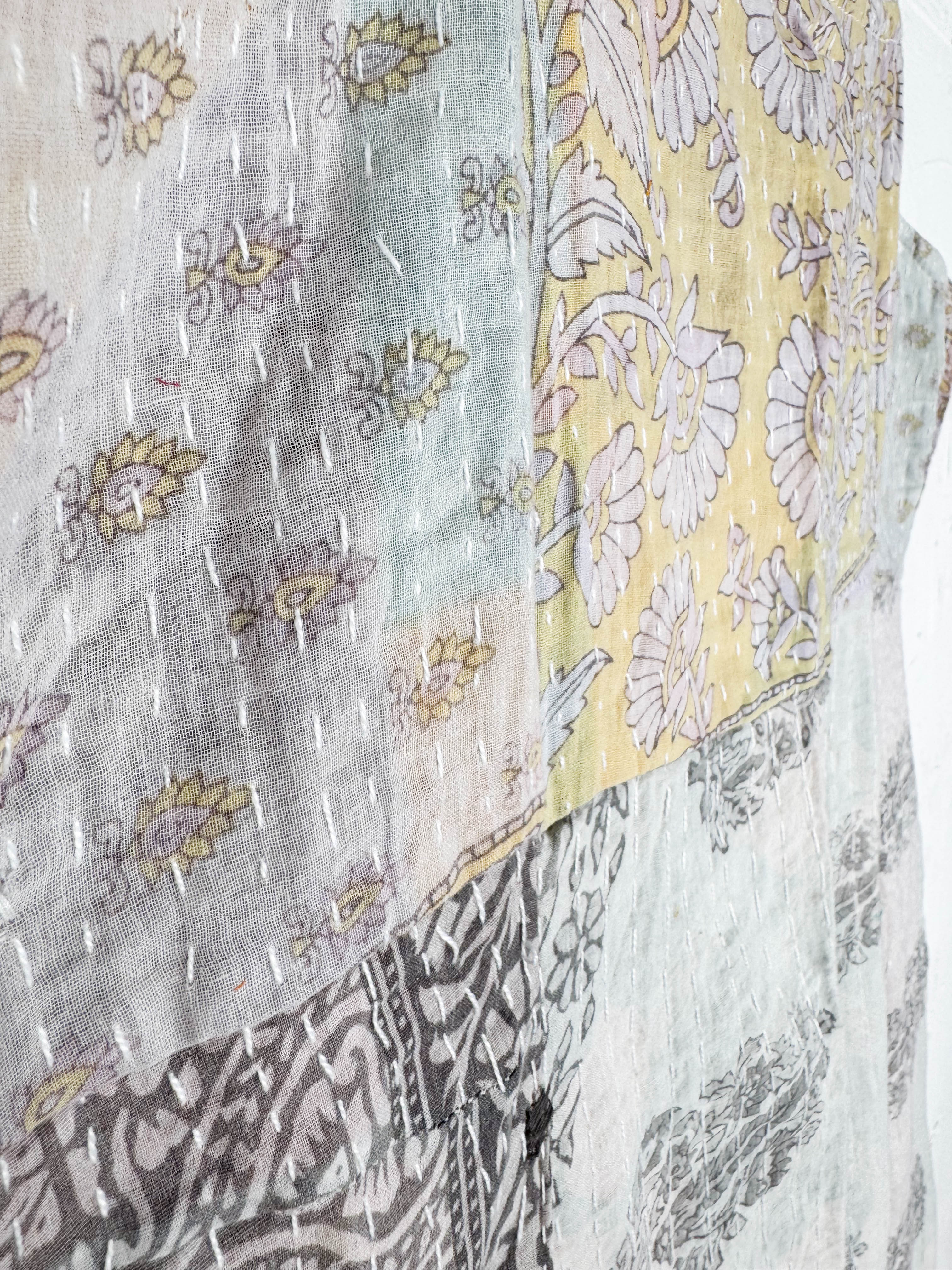 Envelop yourself in the artistry of this vintage Kantha dress. Each running stitch tells a story across the lightweight fabric, creating a unique texture and a beautifully airy feel. A long slit graces the left side, adding a touch of distinctive charm. Experience the seamless harmony of traditional hand craftsmanship and everyday ease to enhance your Playful feminine essence every day!