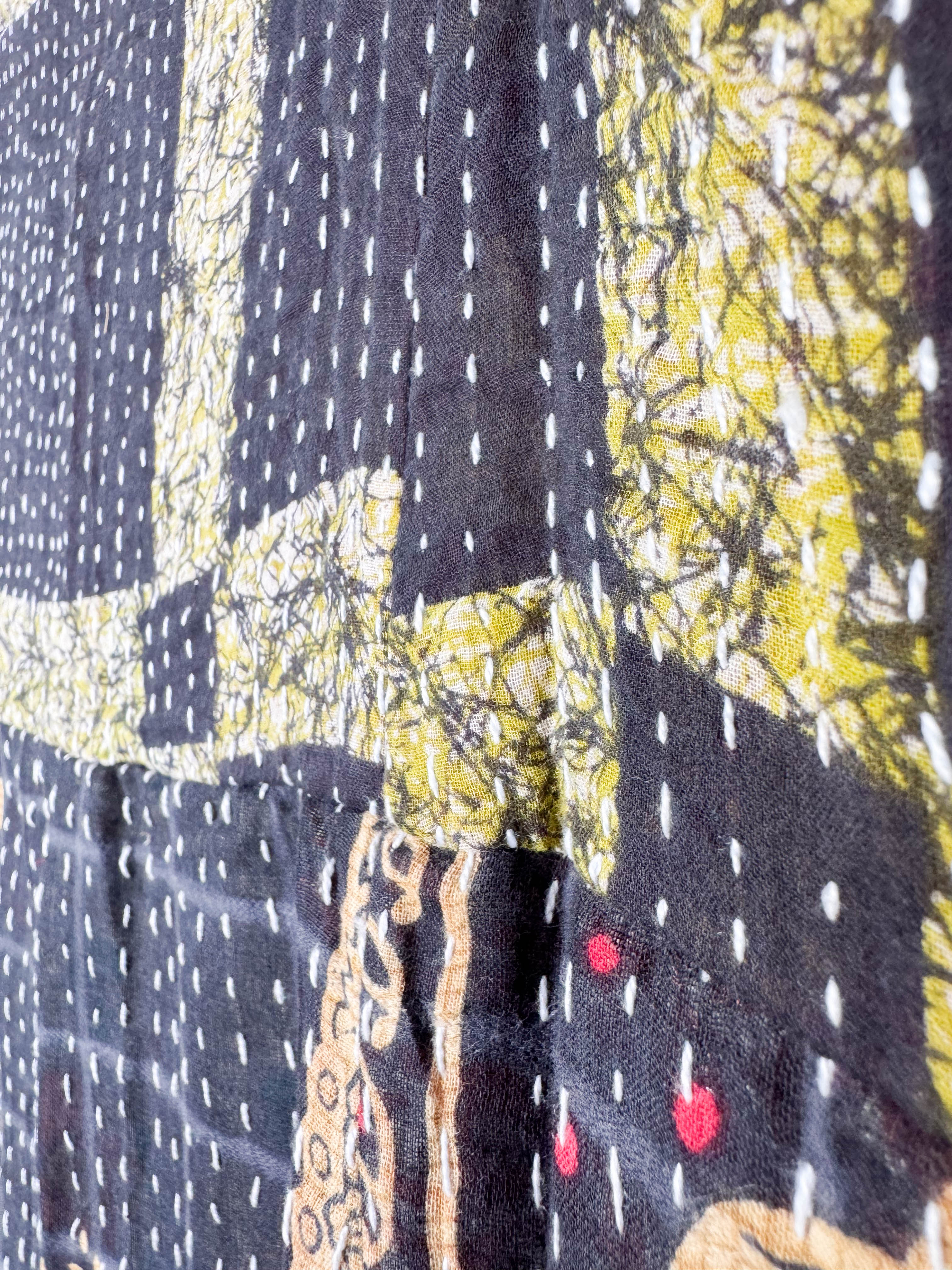 Envelop yourself in the artistry of this vintage Kantha dress. Each running stitch tells a story across the lightweight fabric, creating a unique texture and a beautifully airy feel. A long slit graces the left side, adding a touch of distinctive charm. Experience the seamless harmony of traditional hand craftsmanship and everyday ease to enhance your Playful feminine essence every day!