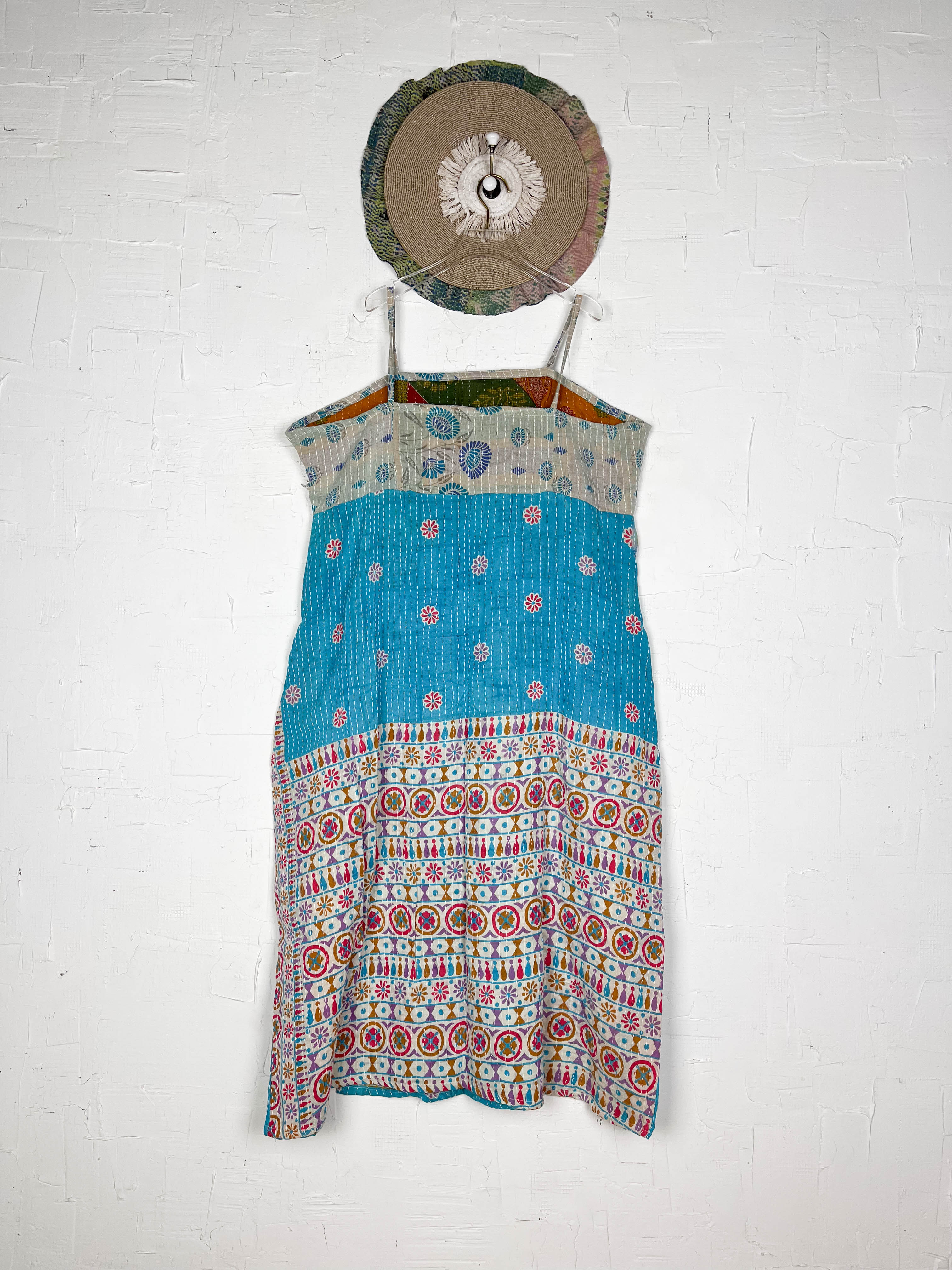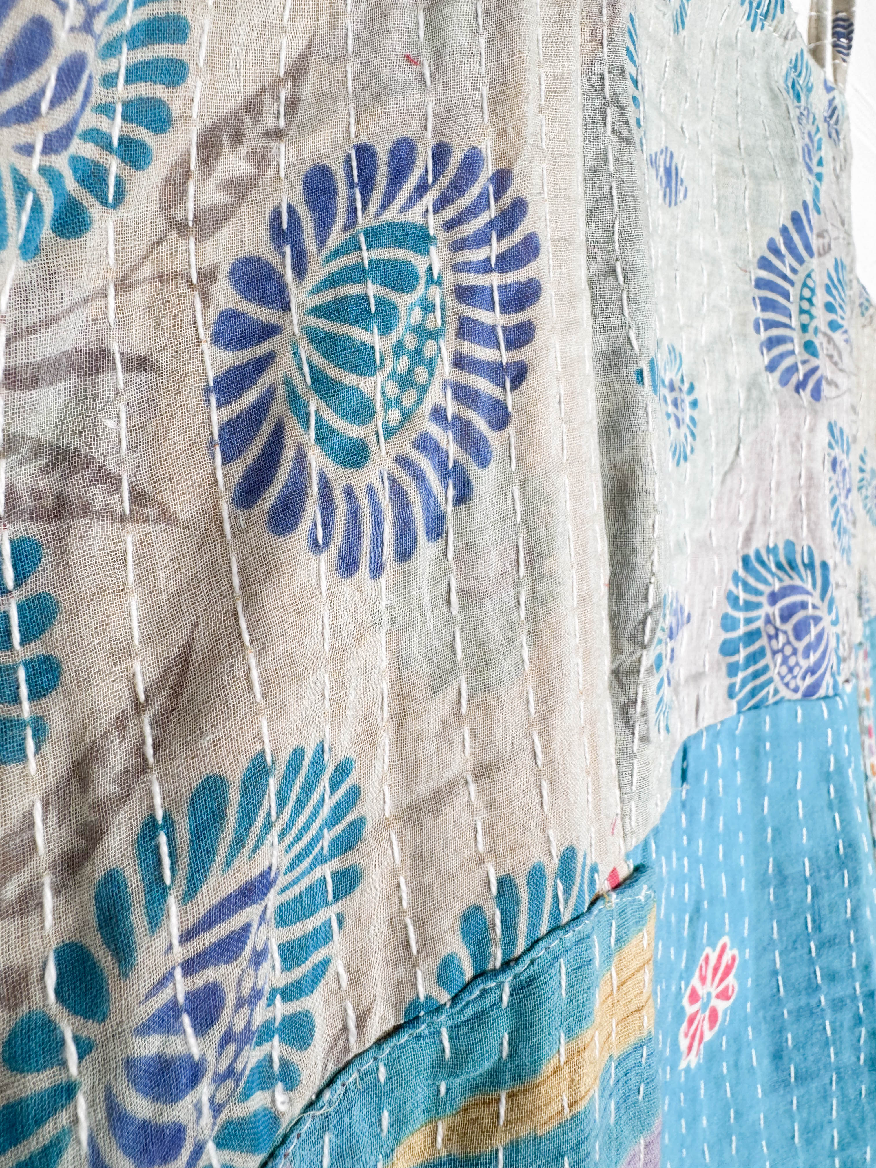 Envelop yourself in the artistry of this vintage Kantha dress. Each running stitch tells a story across the lightweight fabric, creating a unique texture and a beautifully airy feel. A long slit graces the left side, adding a touch of distinctive charm. Experience the seamless harmony of traditional hand craftsmanship and everyday ease to enhance your Playful feminine essence every day!