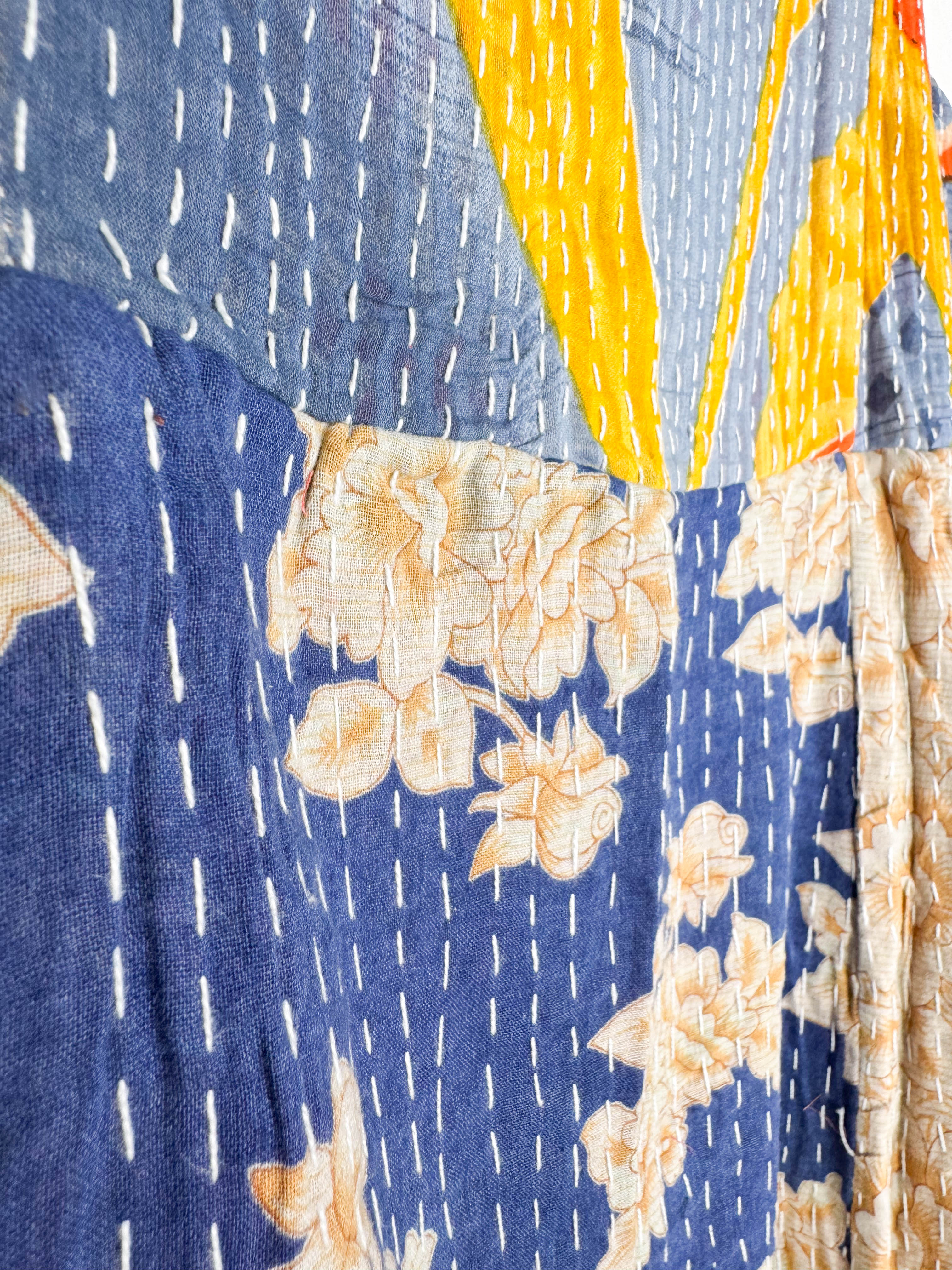 Envelop yourself in the artistry of this vintage Kantha dress. Each running stitch tells a story across the lightweight fabric, creating a unique texture and a beautifully airy feel. A long slit graces the left side, adding a touch of distinctive charm. Experience the seamless harmony of traditional hand craftsmanship and everyday ease to enhance your Playful feminine essence every day!