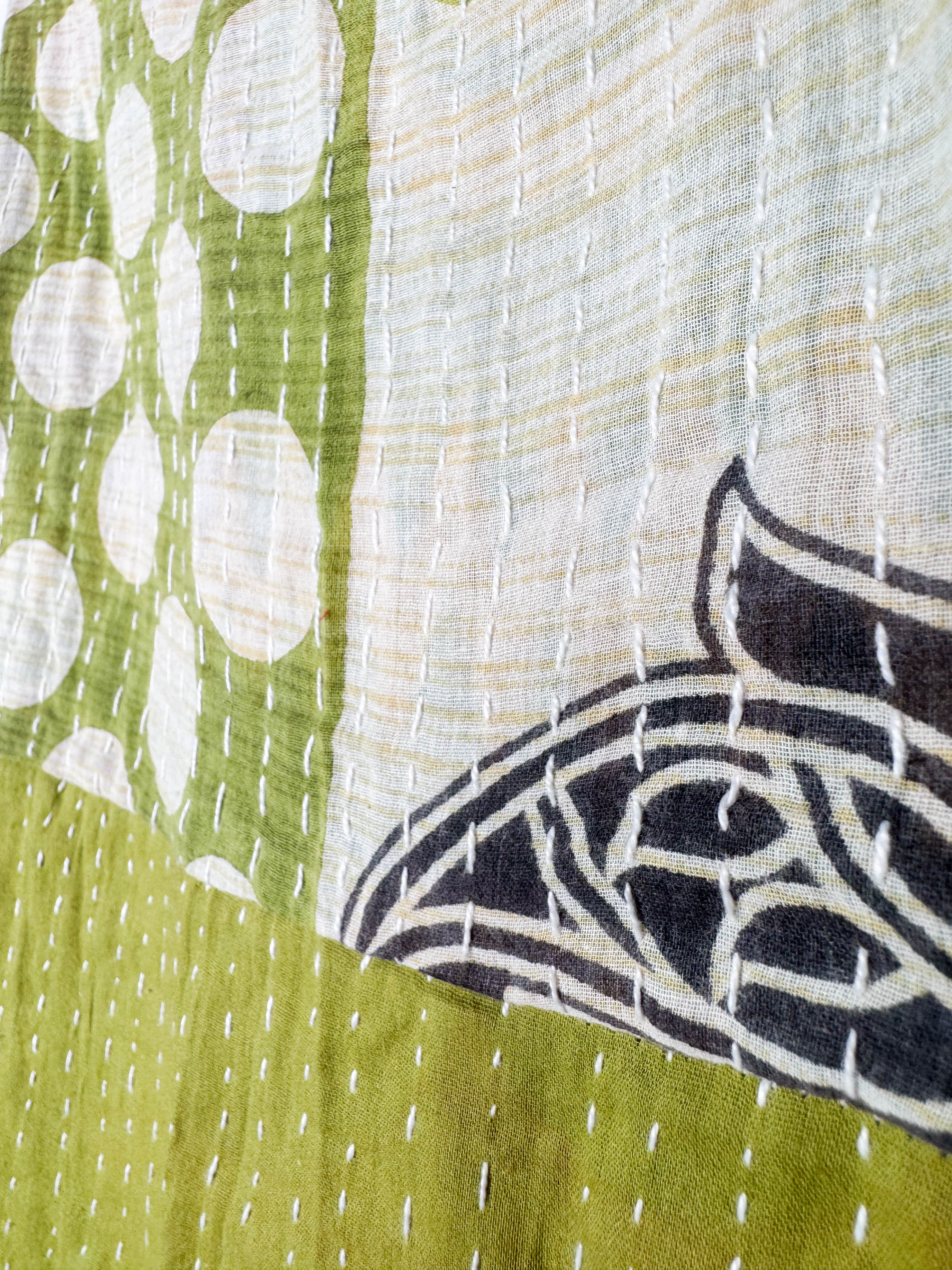Envelop yourself in the artistry of this vintage Kantha dress. Each running stitch tells a story across the lightweight fabric, creating a unique texture and a beautifully airy feel. A long slit graces the left side, adding a touch of distinctive charm. Experience the seamless harmony of traditional hand craftsmanship and everyday ease to enhance your Playful feminine essence every day!