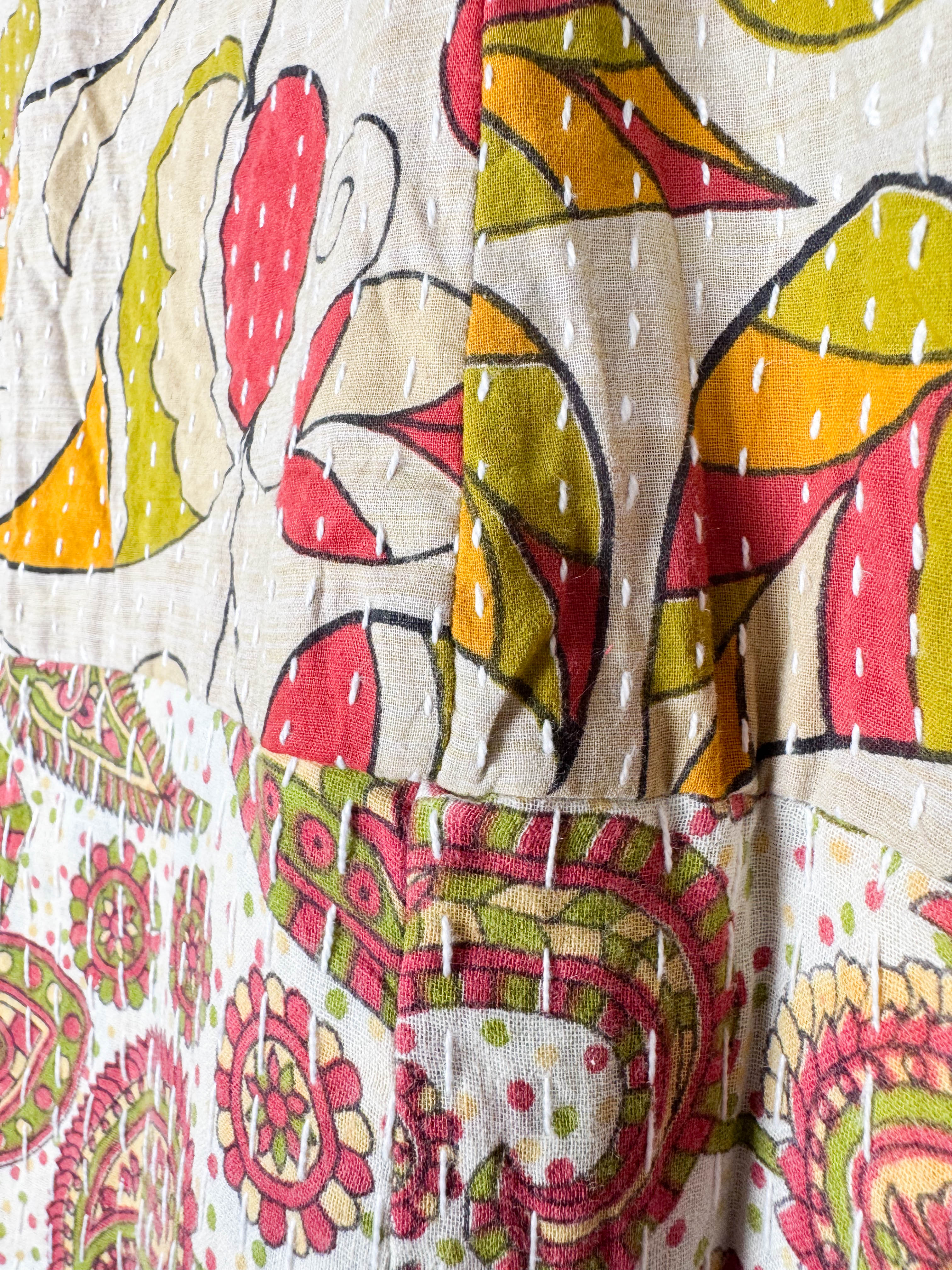 This is Kantha stitches all over the fabric. this kantha work is done by layering 2 or more cotton sarees over each other and stitched them all over the span to get the desired thickness depending upon the number of sarees put in layers, the texture of the stitch all over and the floral prints of cotton make it unique