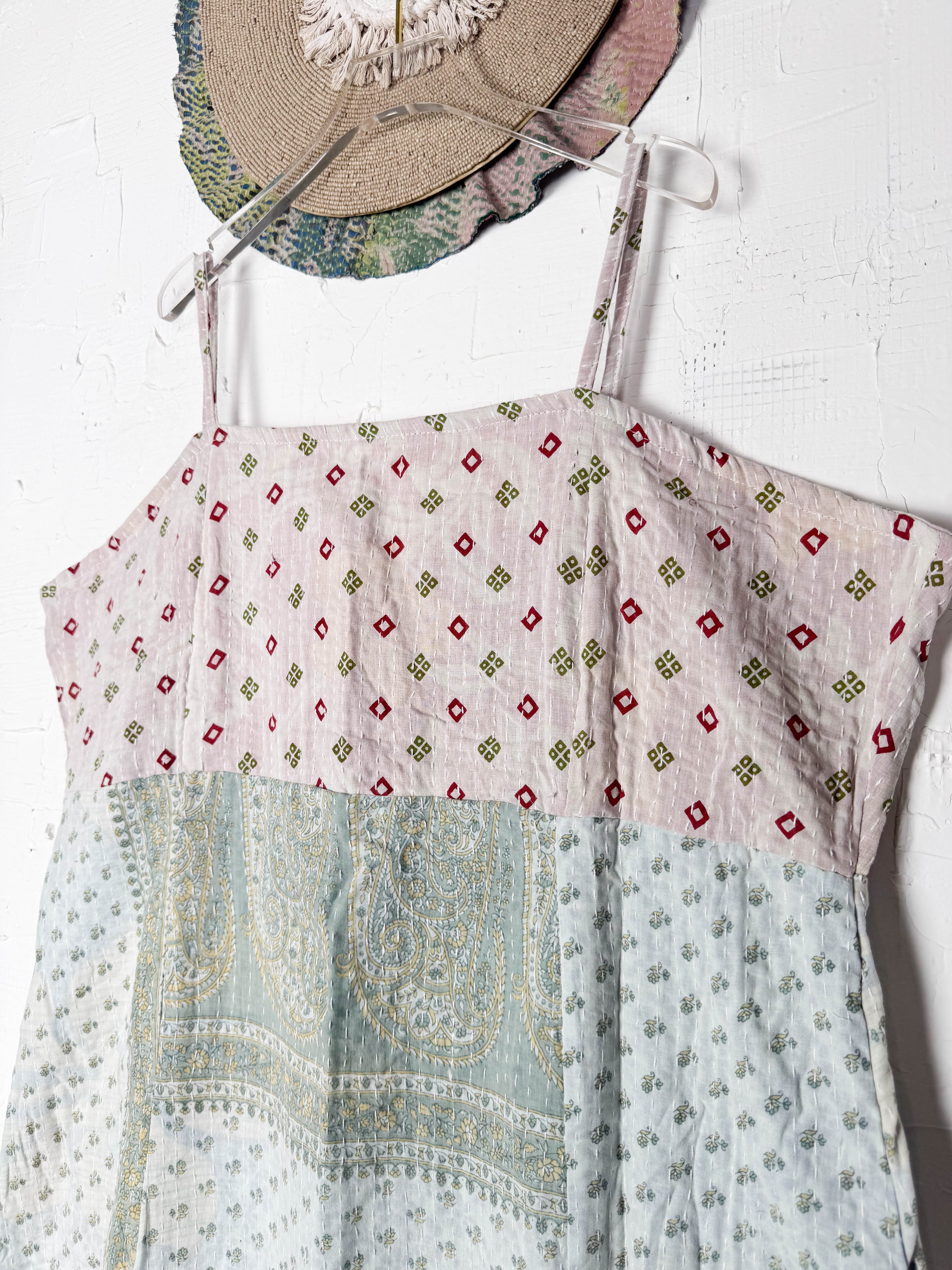 Envelop yourself in the artistry of this vintage Kantha dress. Each running stitch tells a story across the lightweight fabric, creating a unique texture and a beautifully airy feel. A long slit graces the left side, adding a touch of distinctive charm. Experience the seamless harmony of traditional hand craftsmanship and everyday ease to enhance your Playful feminine essence every day!