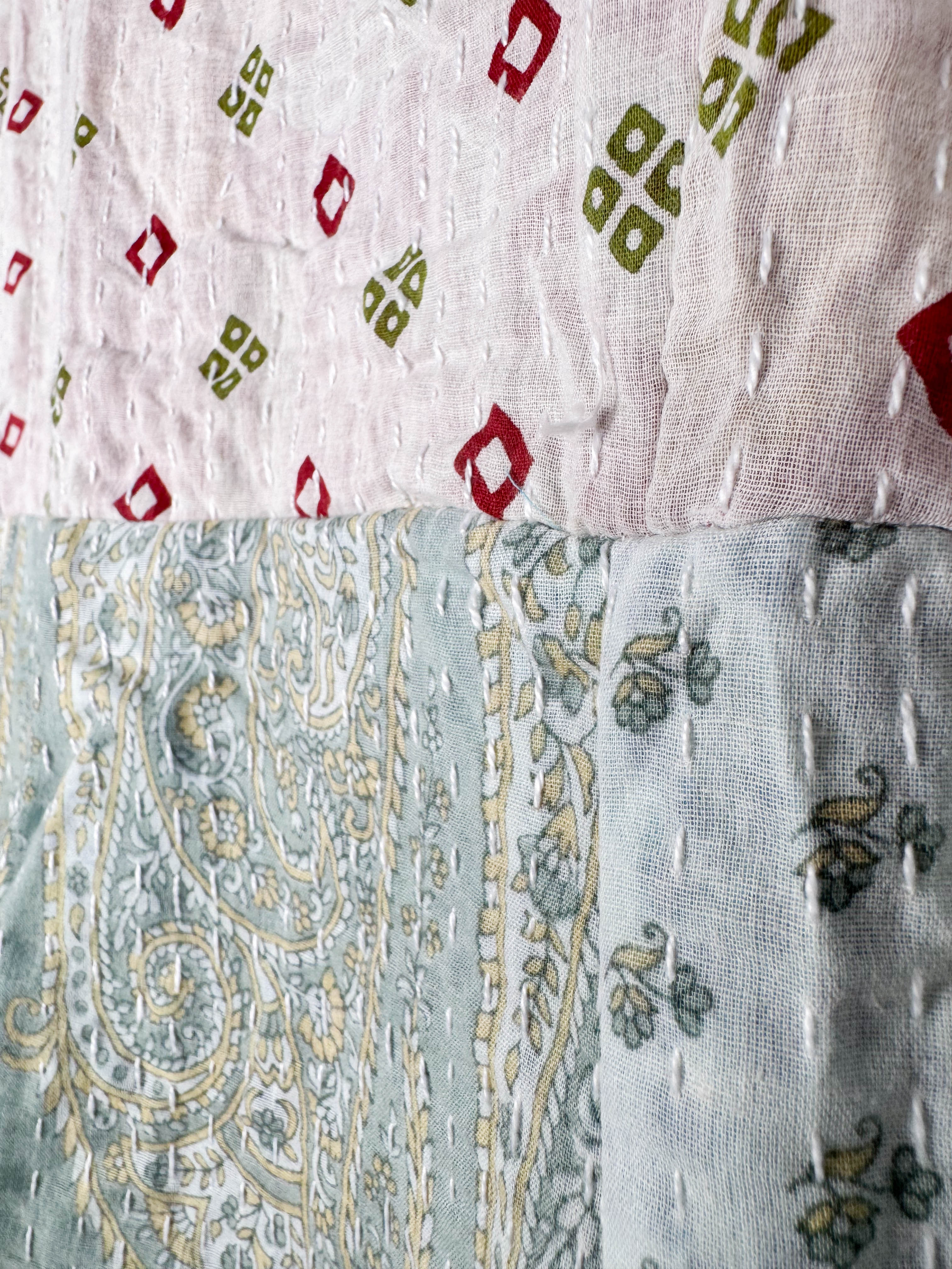 This is Kantha stitches all over the fabric. this kantha work is done by layering 2 or more cotton sarees over each other and stitched them all over the span to get the desired thickness depending upon the number of sarees put in layers, the texture of the stitch all over and the floral prints of cotton make it unique