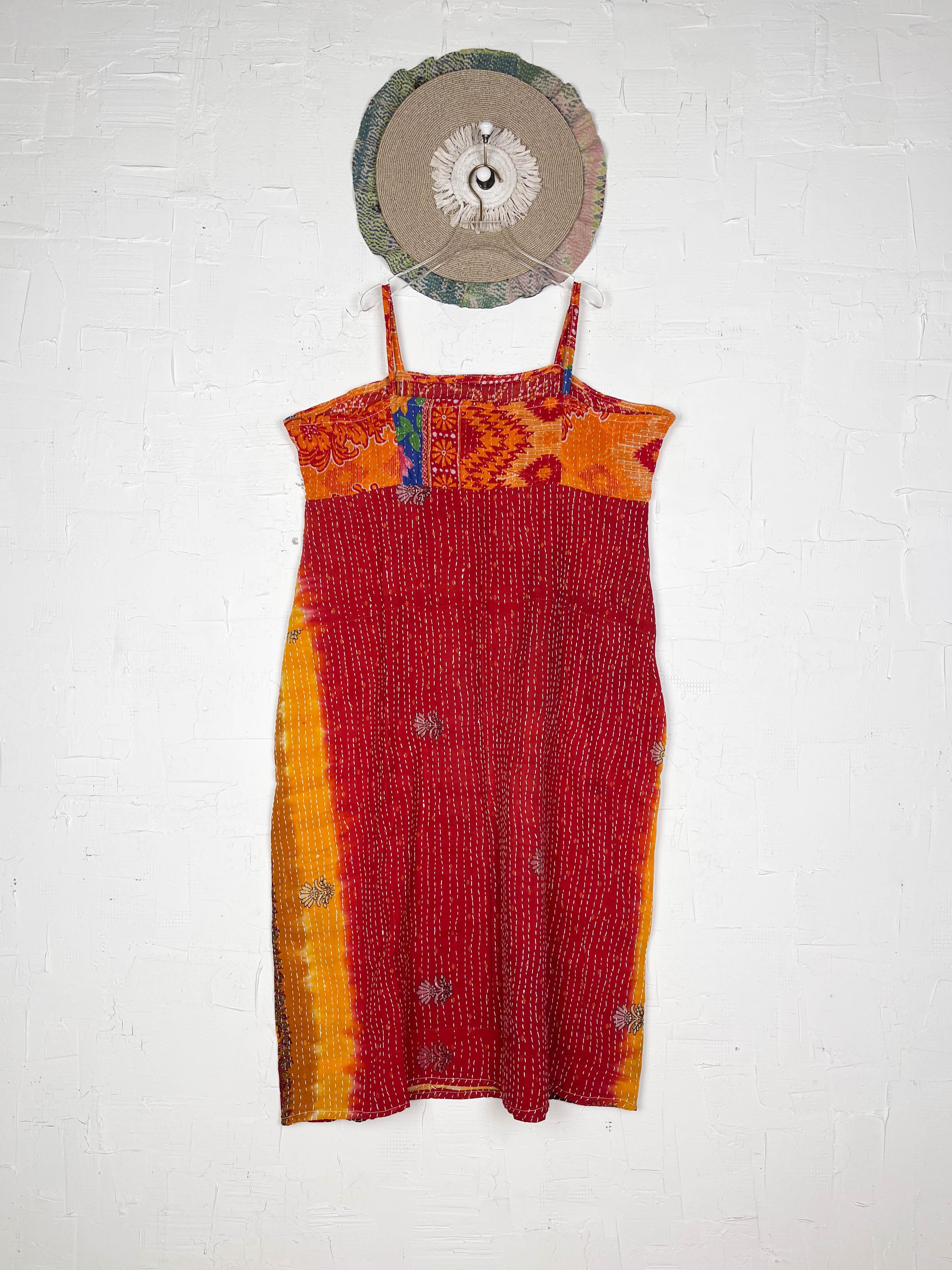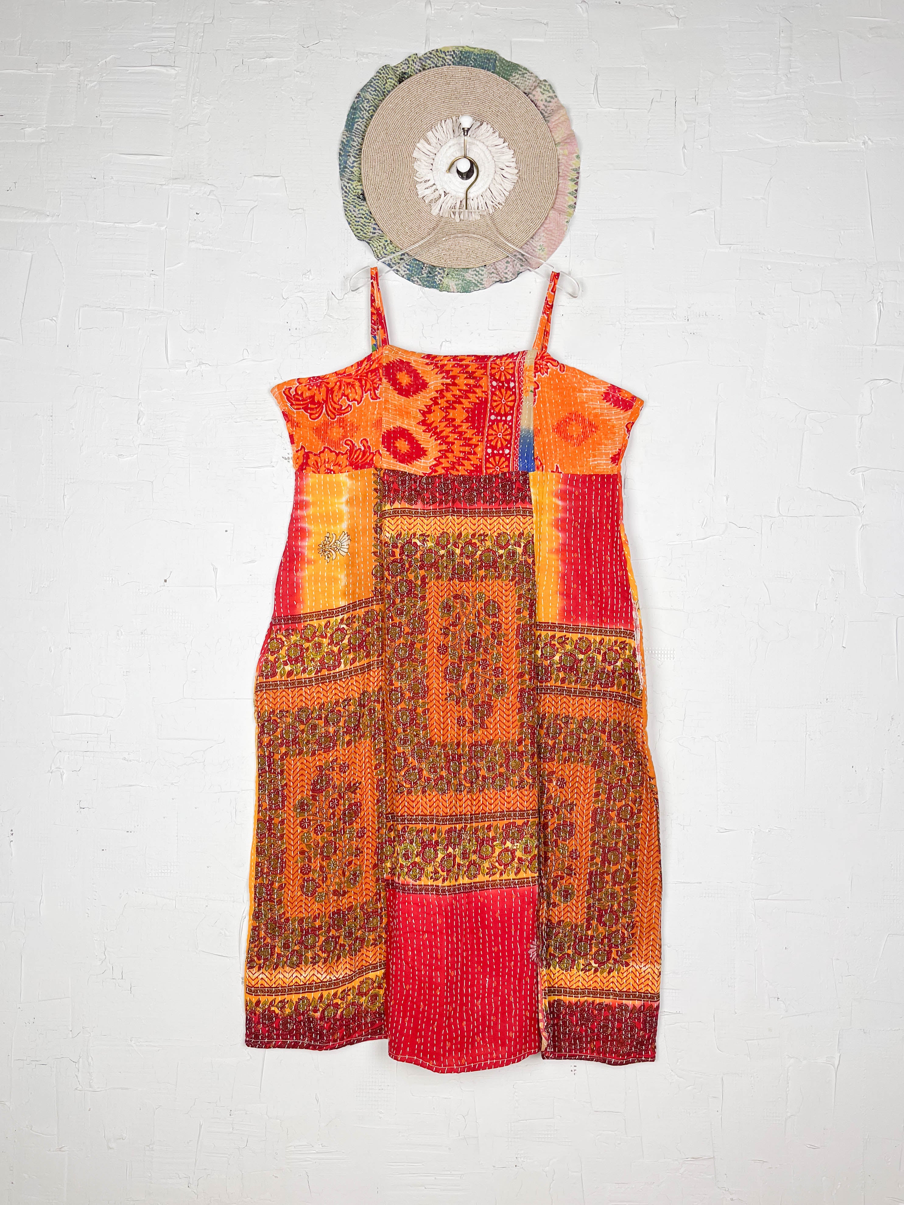 Envelop yourself in the artistry of this vintage Kantha dress. Each running stitch tells a story across the lightweight fabric, creating a unique texture and a beautifully airy feel. A long slit graces the left side, adding a touch of distinctive charm. Experience the seamless harmony of traditional hand craftsmanship and everyday ease to enhance your Playful feminine essence every day!