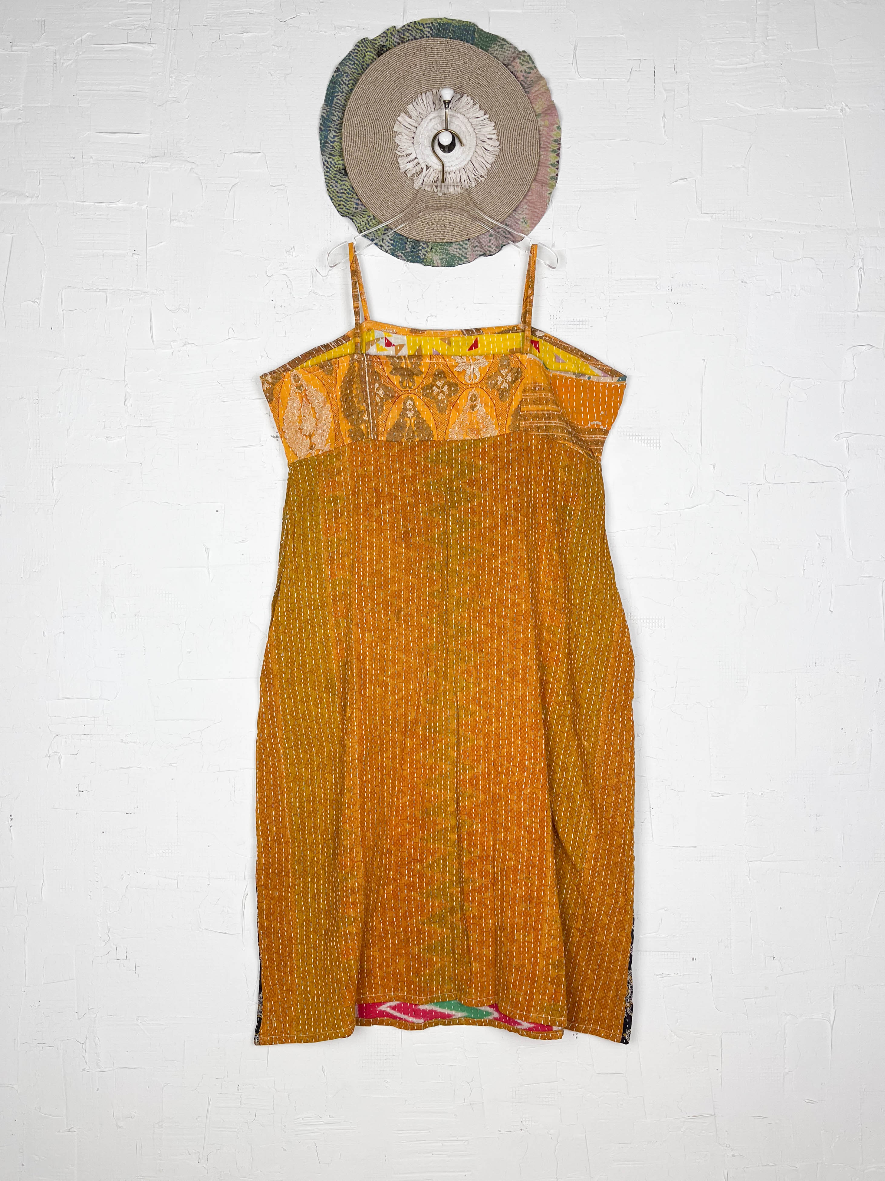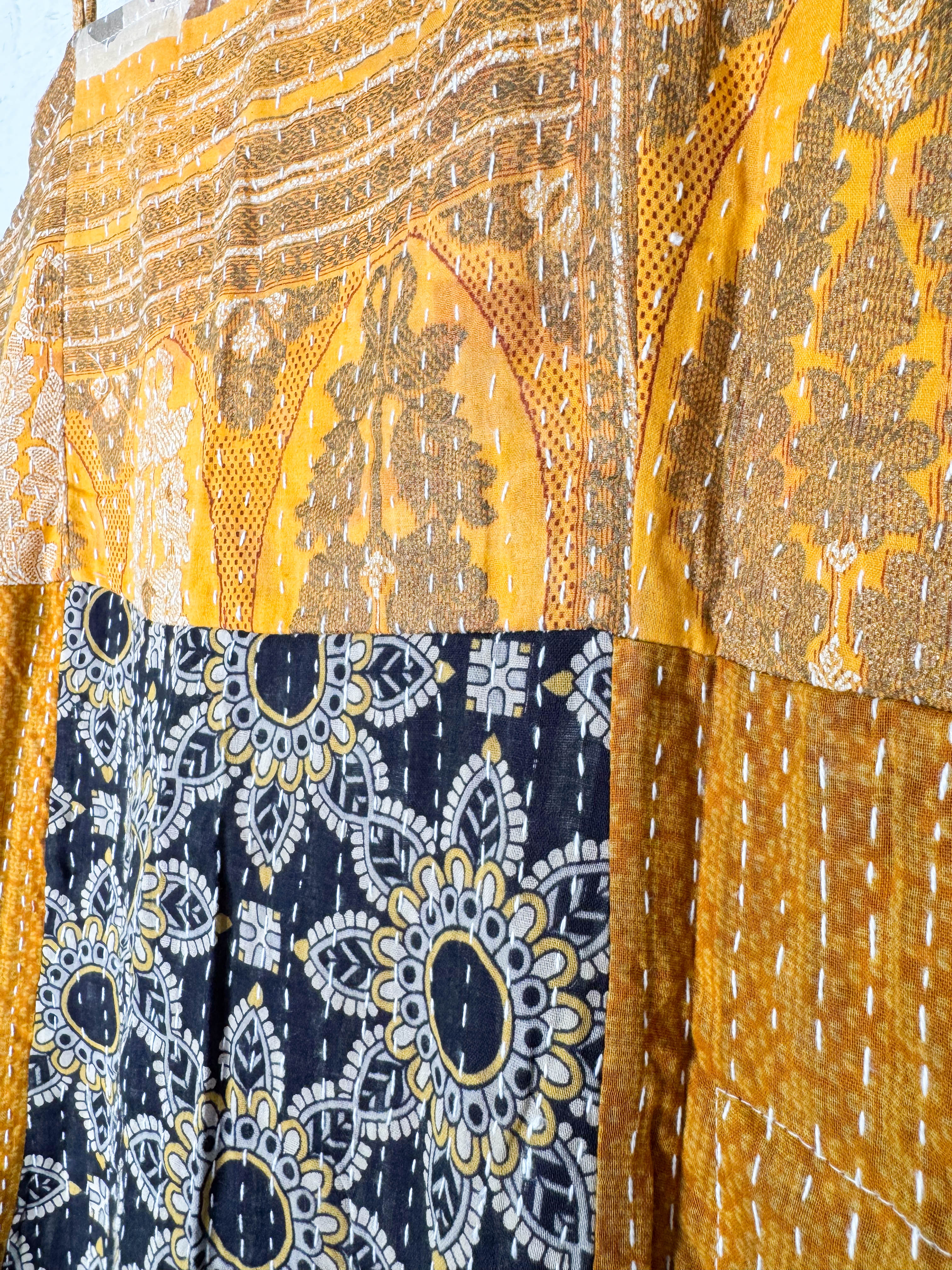 Envelop yourself in the artistry of this vintage Kantha dress. Each running stitch tells a story across the lightweight fabric, creating a unique texture and a beautifully airy feel. A long slit graces the left side, adding a touch of distinctive charm. Experience the seamless harmony of traditional hand craftsmanship and everyday ease to enhance your Playful feminine essence every day!