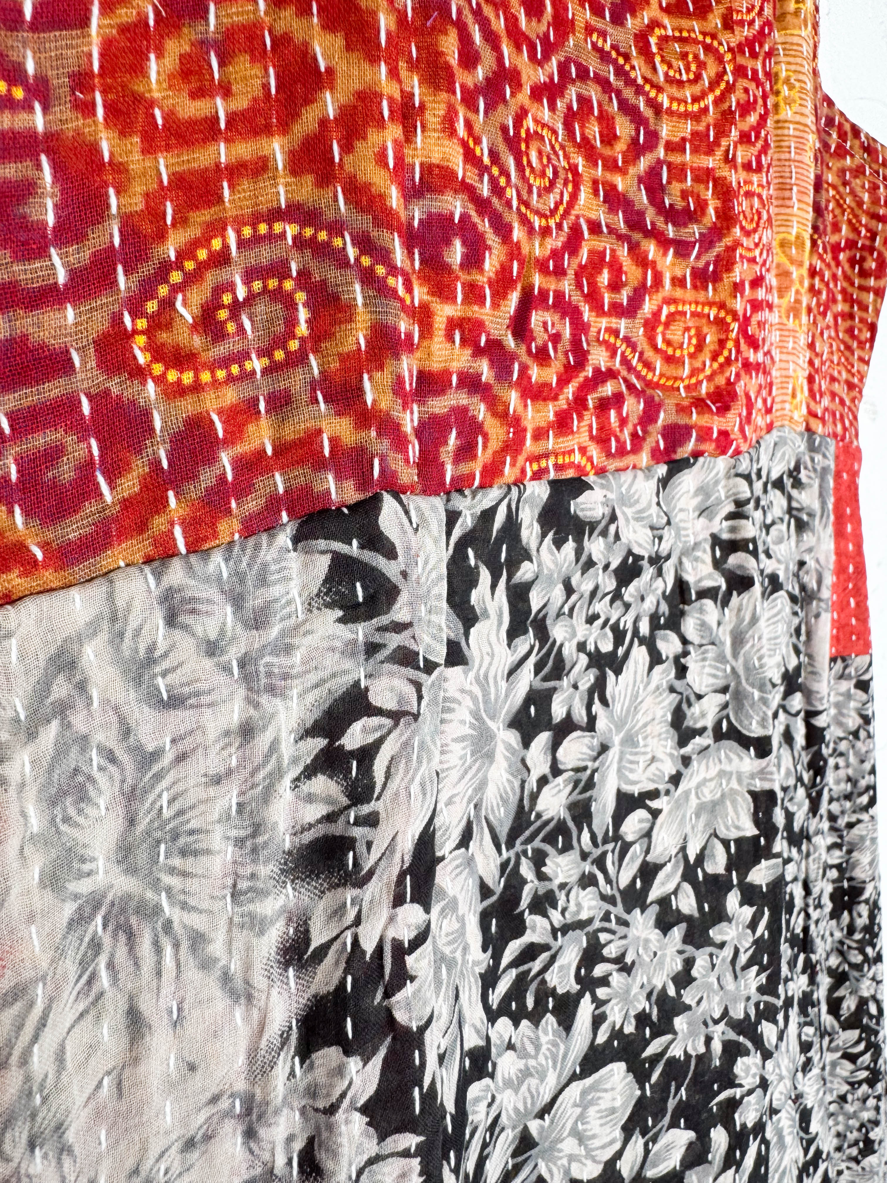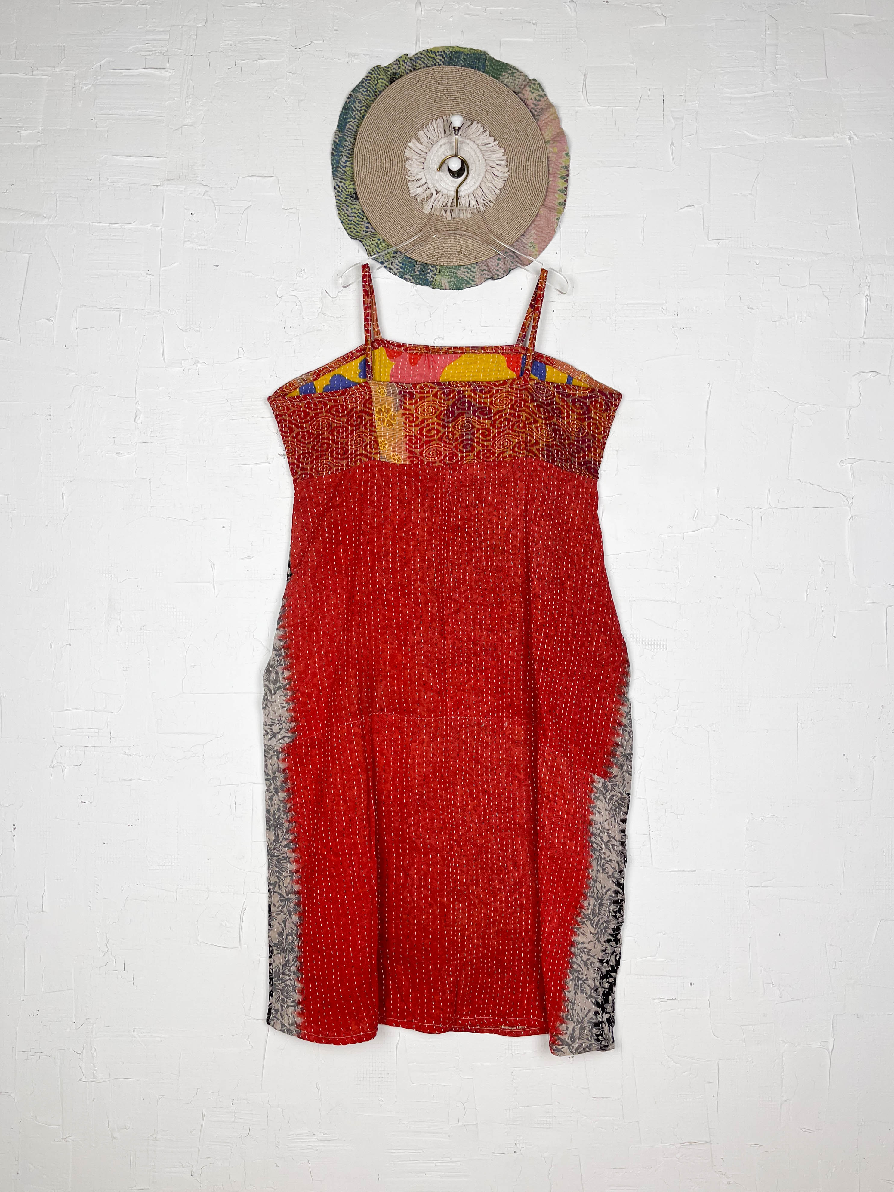 Envelop yourself in the artistry of this vintage Kantha dress. Each running stitch tells a story across the lightweight fabric, creating a unique texture and a beautifully airy feel. A long slit graces the left side, adding a touch of distinctive charm. Experience the seamless harmony of traditional hand craftsmanship and everyday ease to enhance your Playful feminine essence every day!