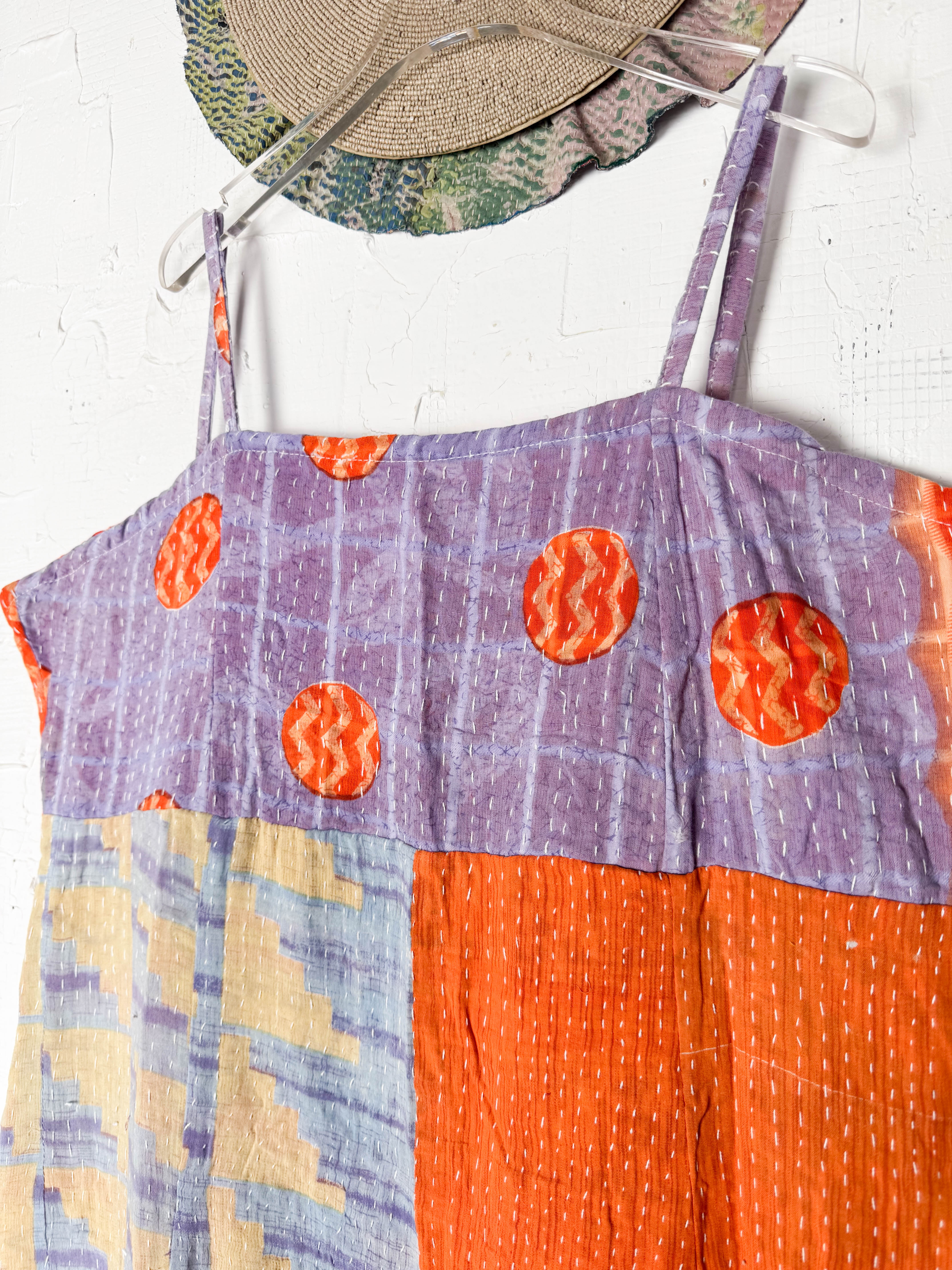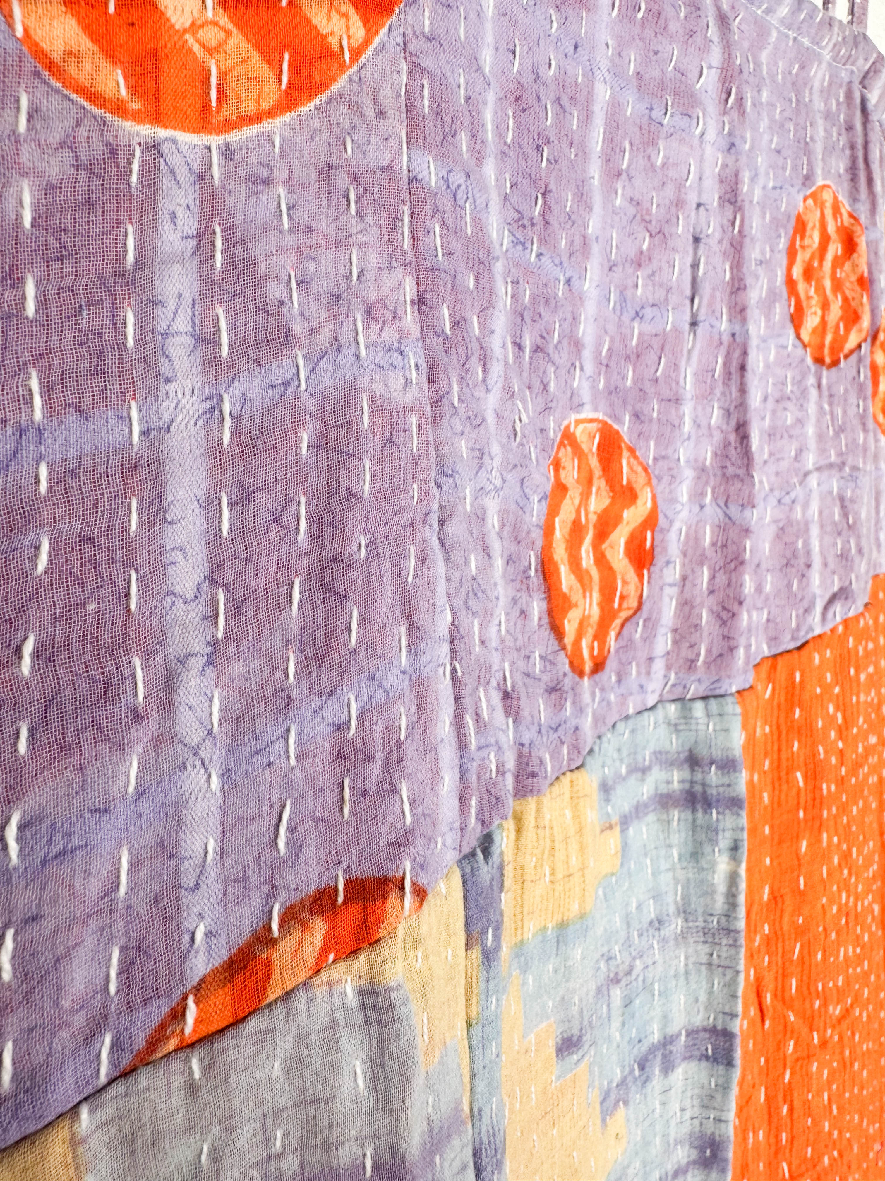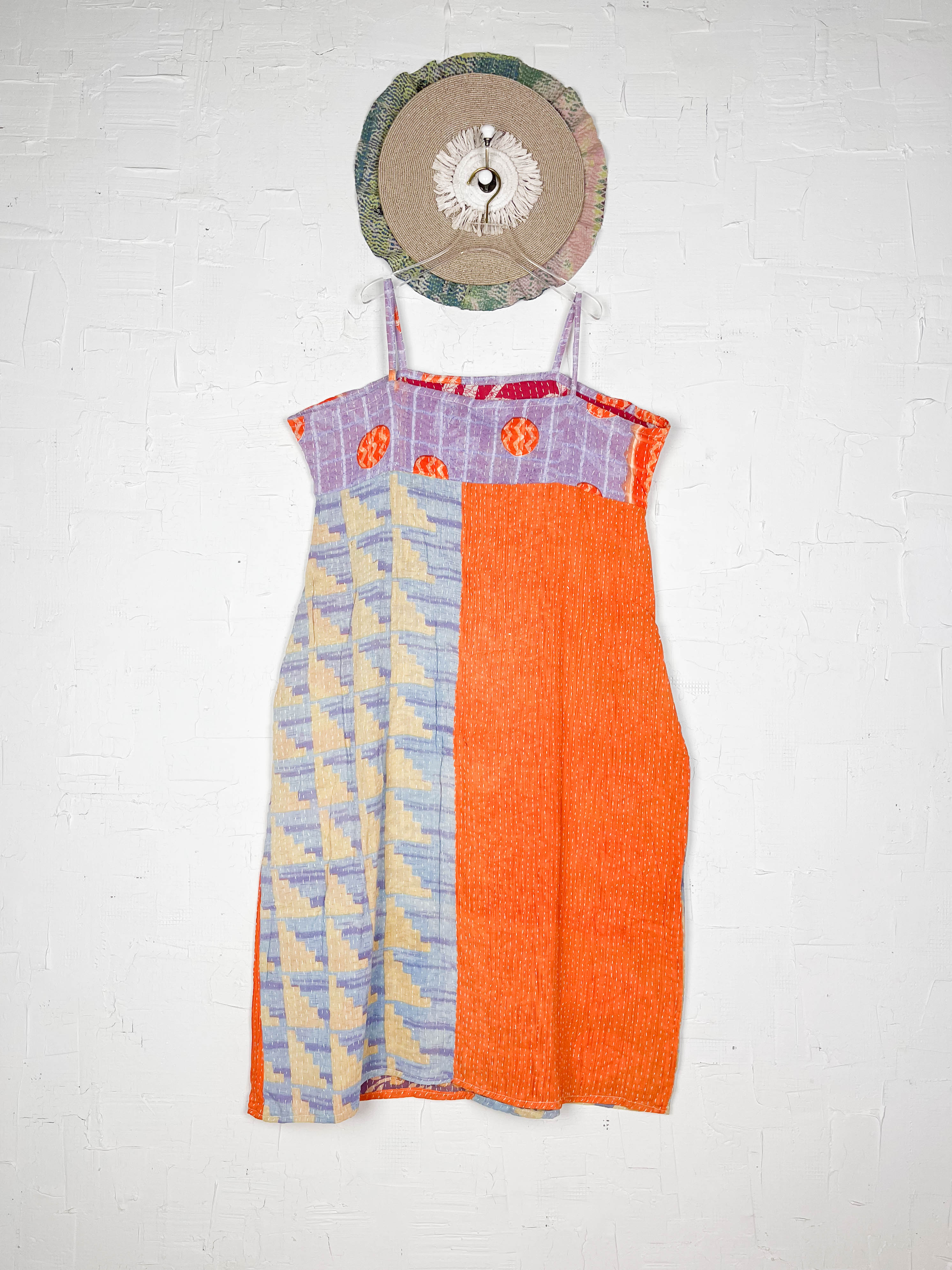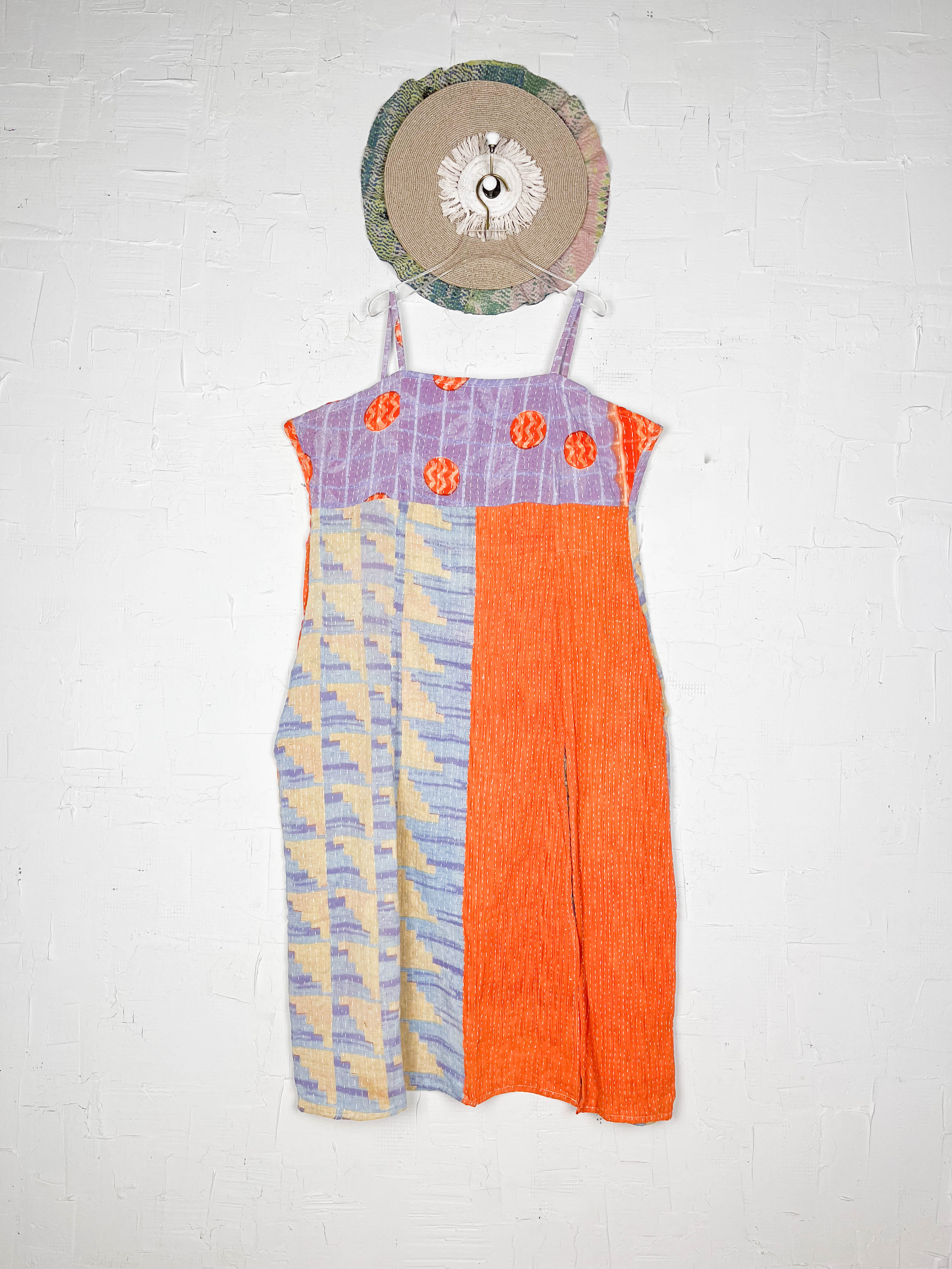 Envelop yourself in the artistry of this vintage Kantha dress. Each running stitch tells a story across the lightweight fabric, creating a unique texture and a beautifully airy feel. A long slit graces the left side, adding a touch of distinctive charm. Experience the seamless harmony of traditional hand craftsmanship and everyday ease to enhance your Playful feminine essence every day!