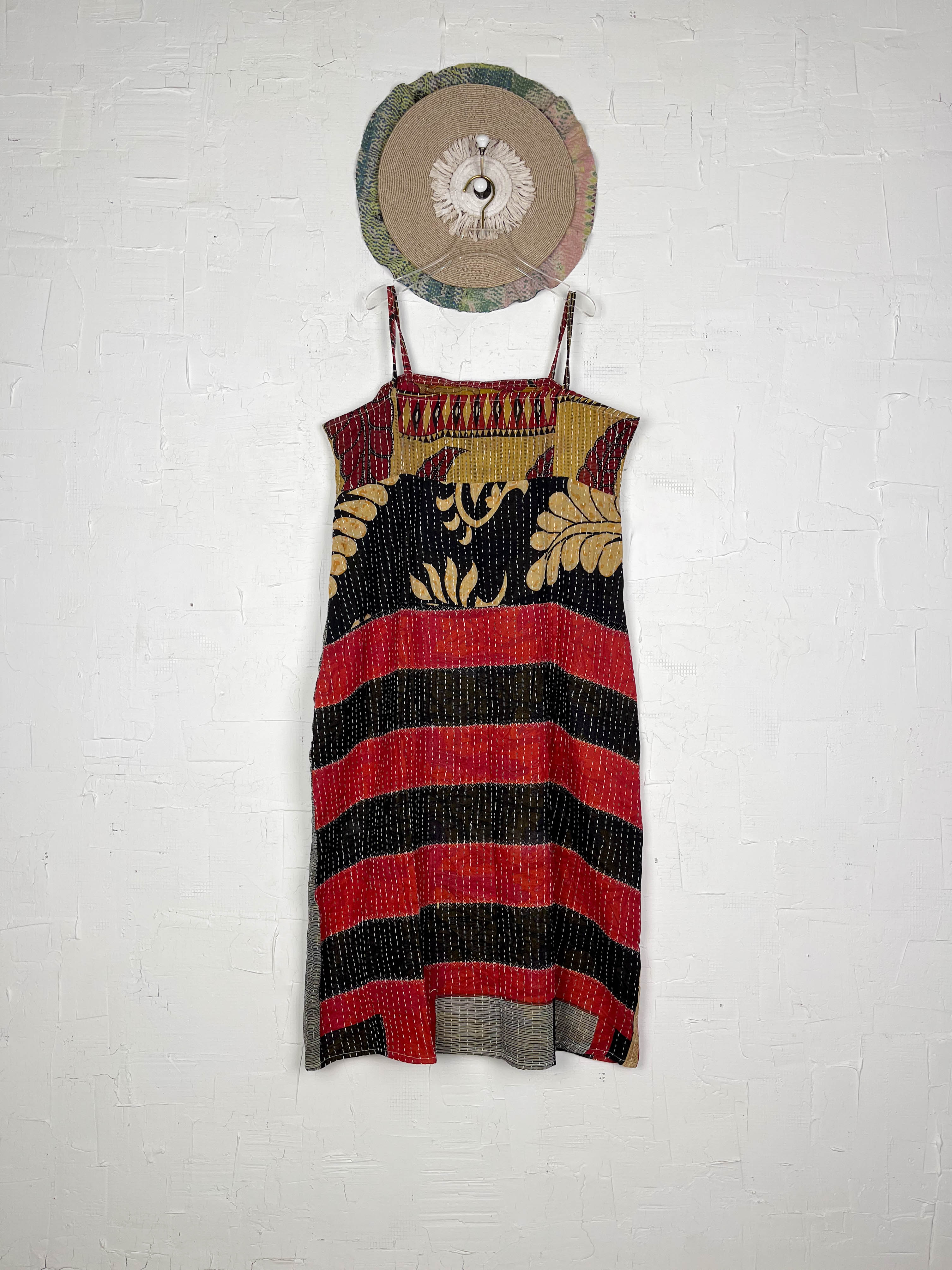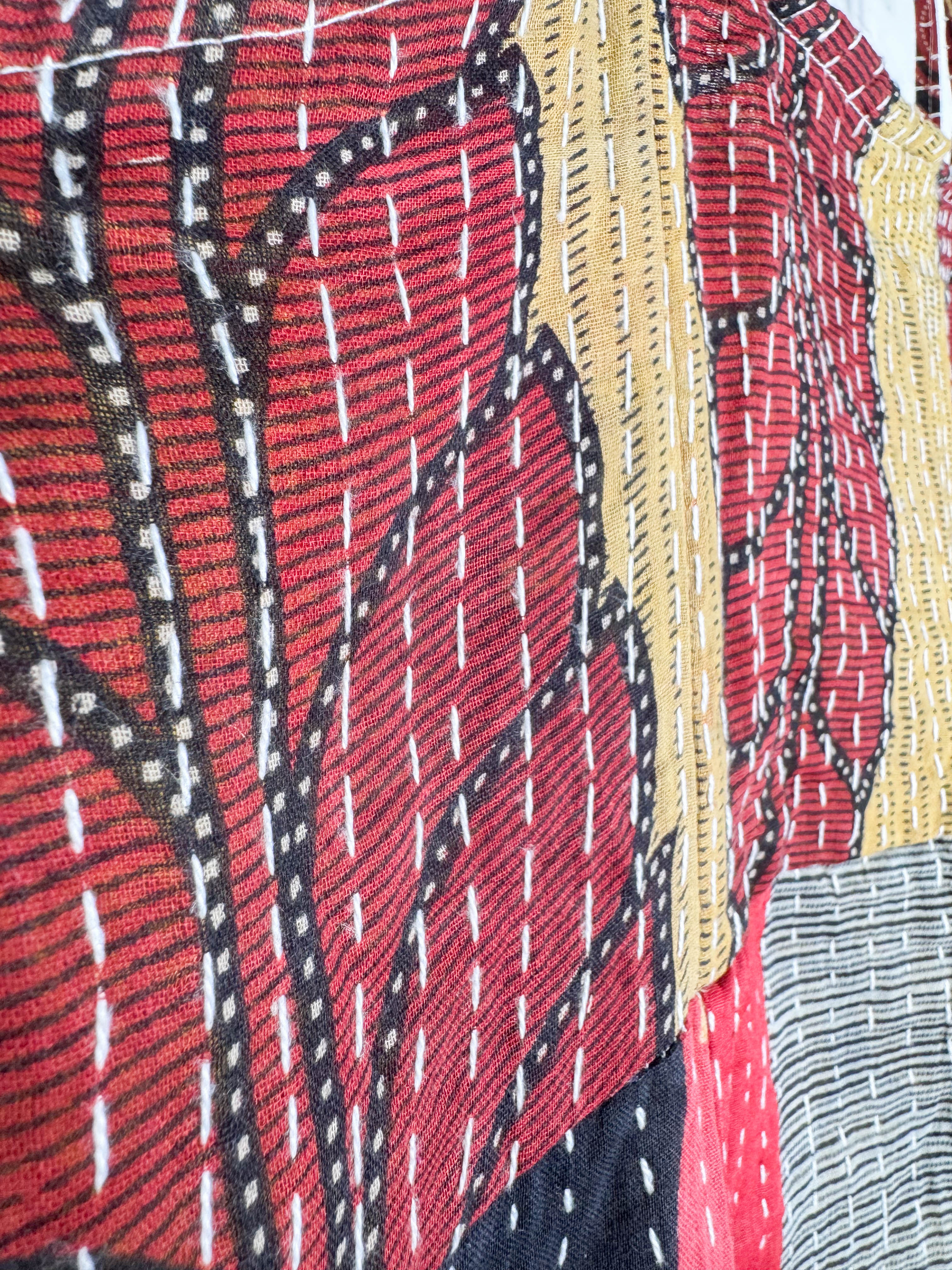 Envelop yourself in the artistry of this vintage Kantha dress. Each running stitch tells a story across the lightweight fabric, creating a unique texture and a beautifully airy feel. A long slit graces the left side, adding a touch of distinctive charm. Experience the seamless harmony of traditional hand craftsmanship and everyday ease to enhance your Playful feminine essence every day!